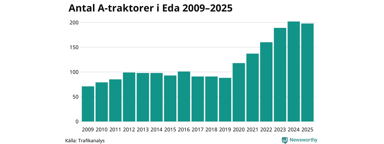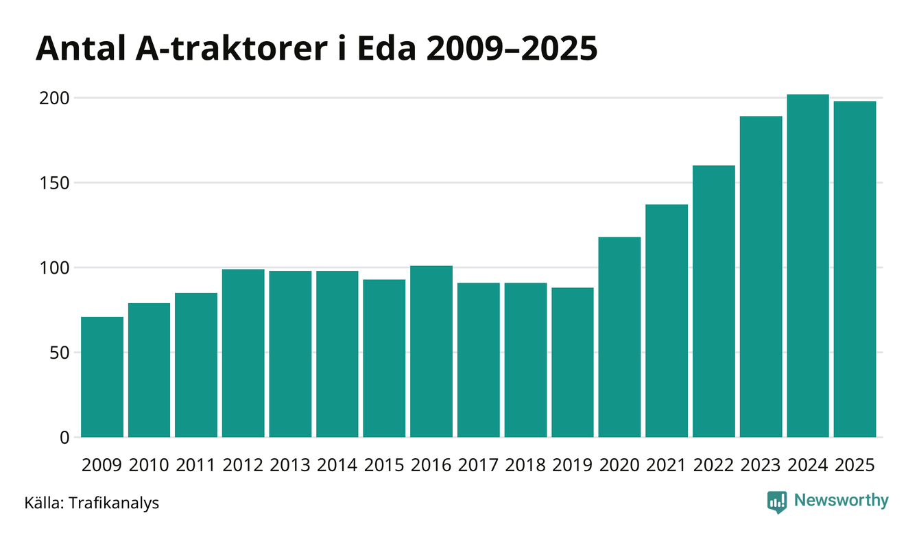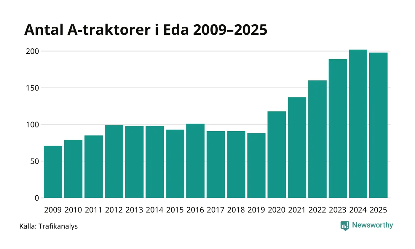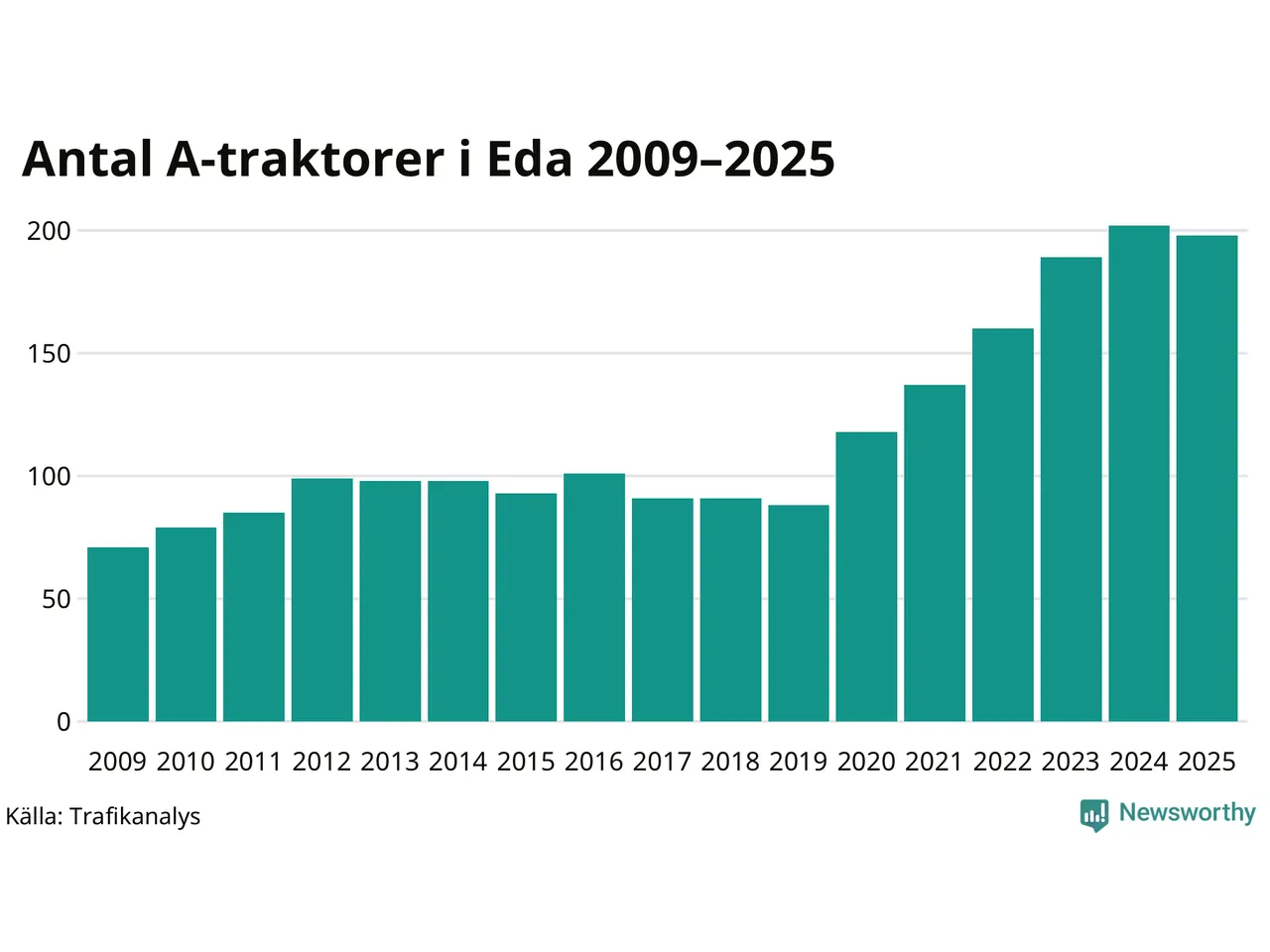 Under det senaste decenniet har antalet A-traktorer femdubblats i Sverige, och under 2025 fortsatte utvecklingen. Men i Eda kommun blev A-traktorerna färre. Det är första gången sedan 2019 som antalet inte ökar.