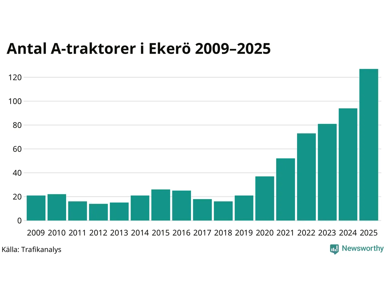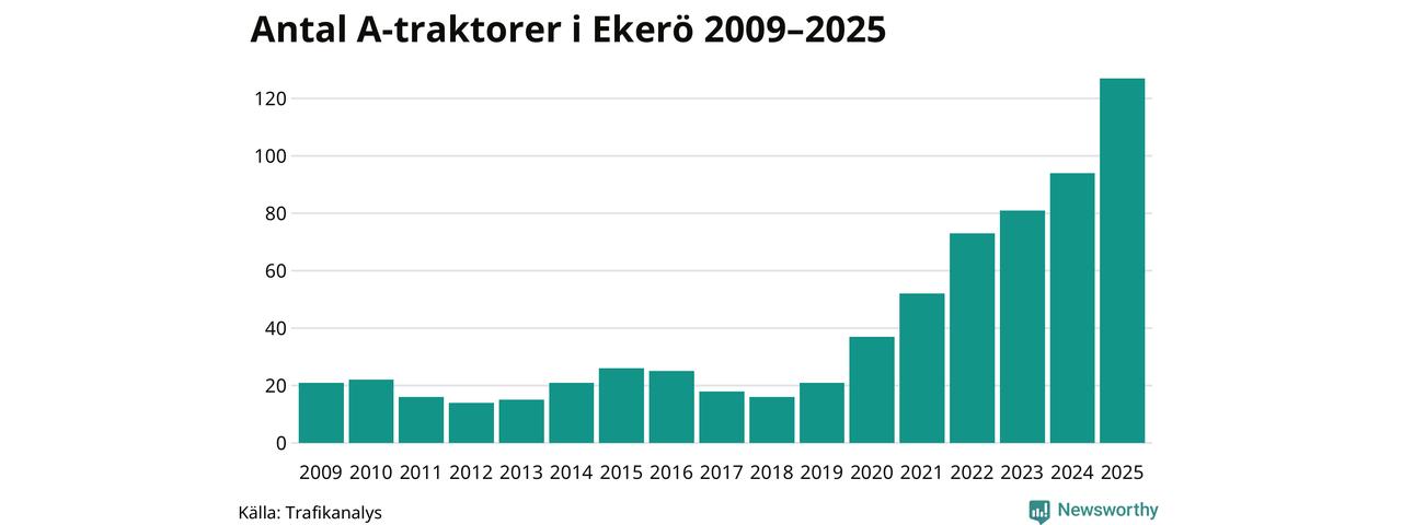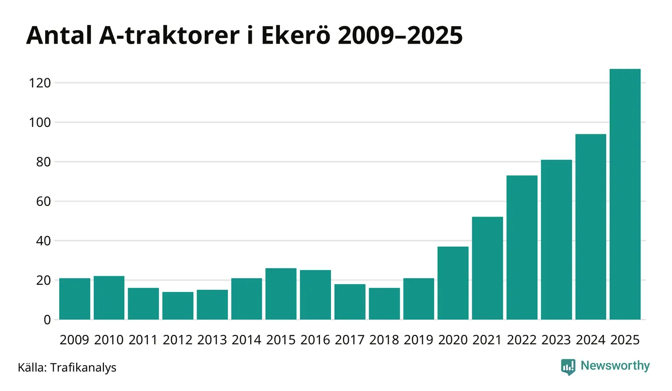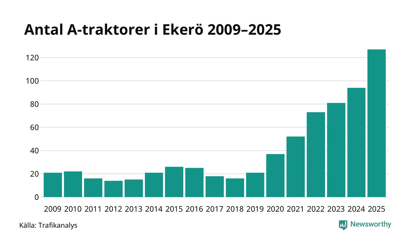 För sjunde året i rad ökar antalet A-traktorer i Ekerö kommun, visar nya siffror från Trafikanalys. I slutet av 2025 fanns 127 A-traktorer registrerade i kommunen, vilket är 33 mer än året innan – en ökning med 35 procent. Ökningen är den största från ett år till ett annat någonsin i Ekerö kommun i absoluta tal.