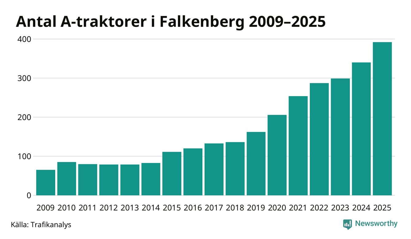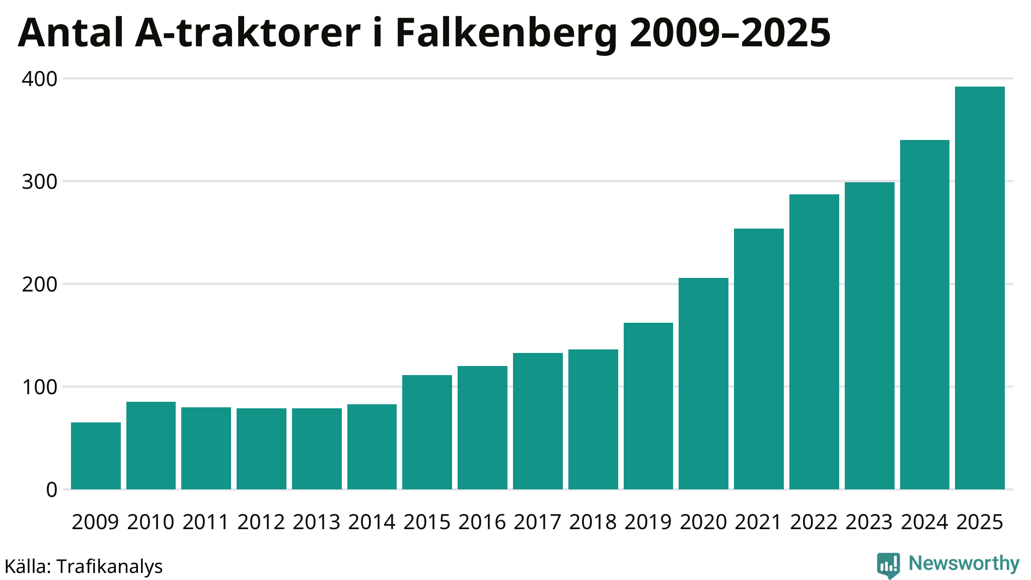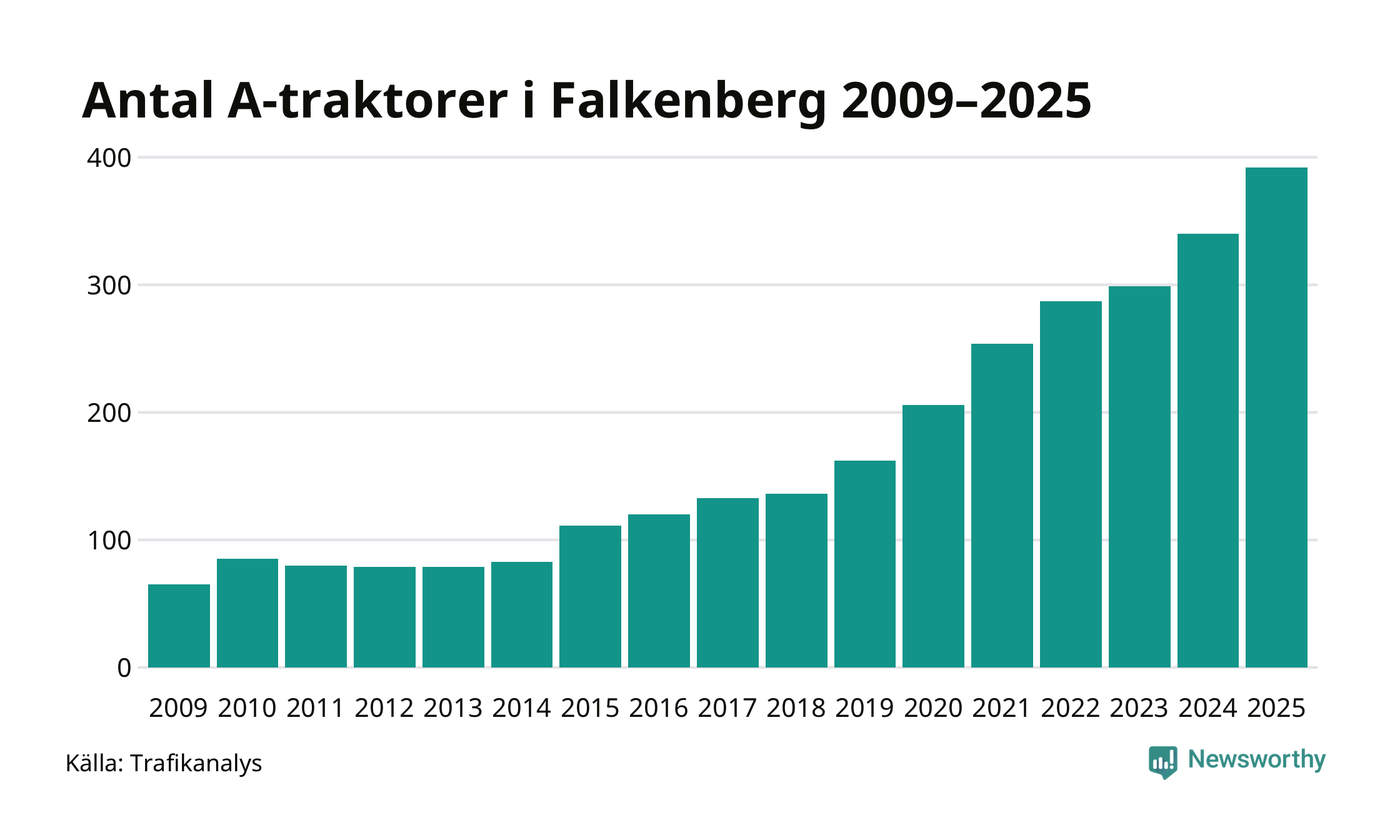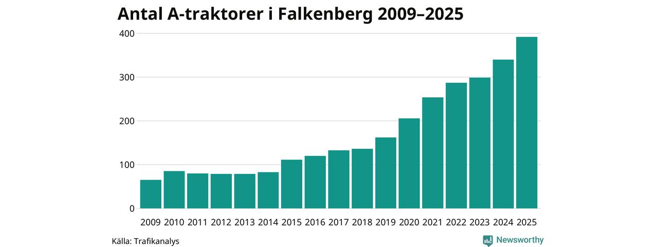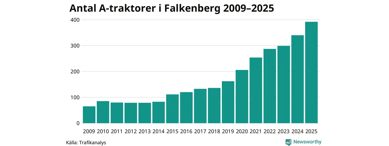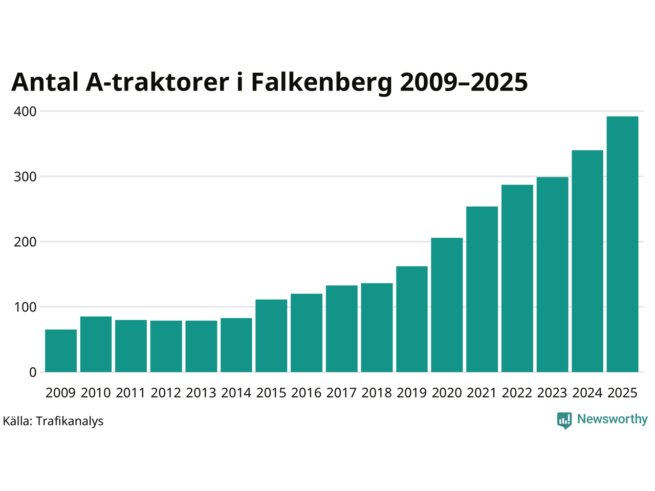 För tolfte året i rad ökar antalet A-traktorer i Falkenbergs kommun, visar nya siffror från Trafikanalys. I slutet av 2025 fanns 392 A-traktorer registrerade i kommunen, vilket är 52 mer än året innan – en ökning med 15 procent. Ökningen är den största från ett år till ett annat någonsin i Falkenbergs kommun i absoluta tal och den näst största ökningen i Hallands län i år.