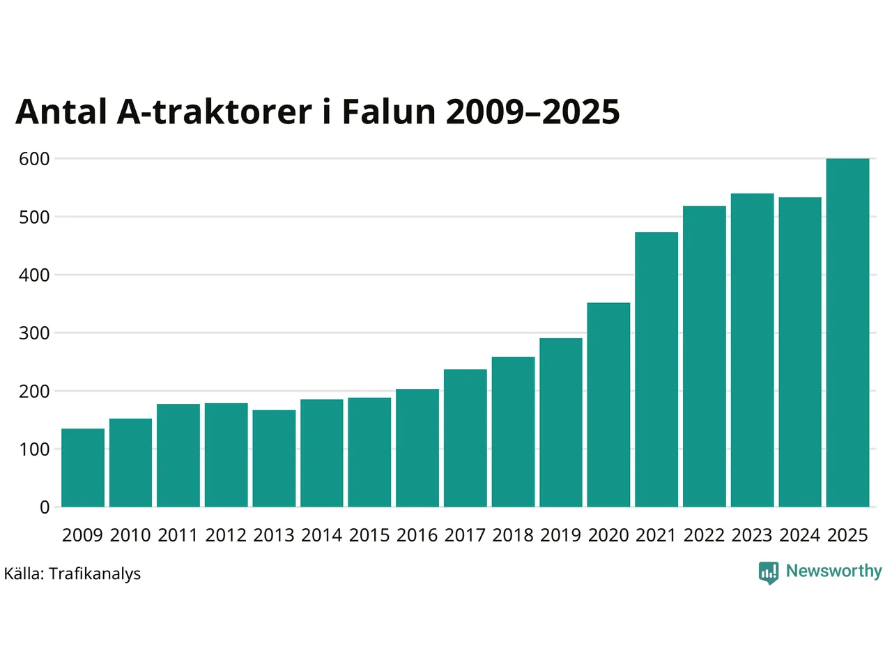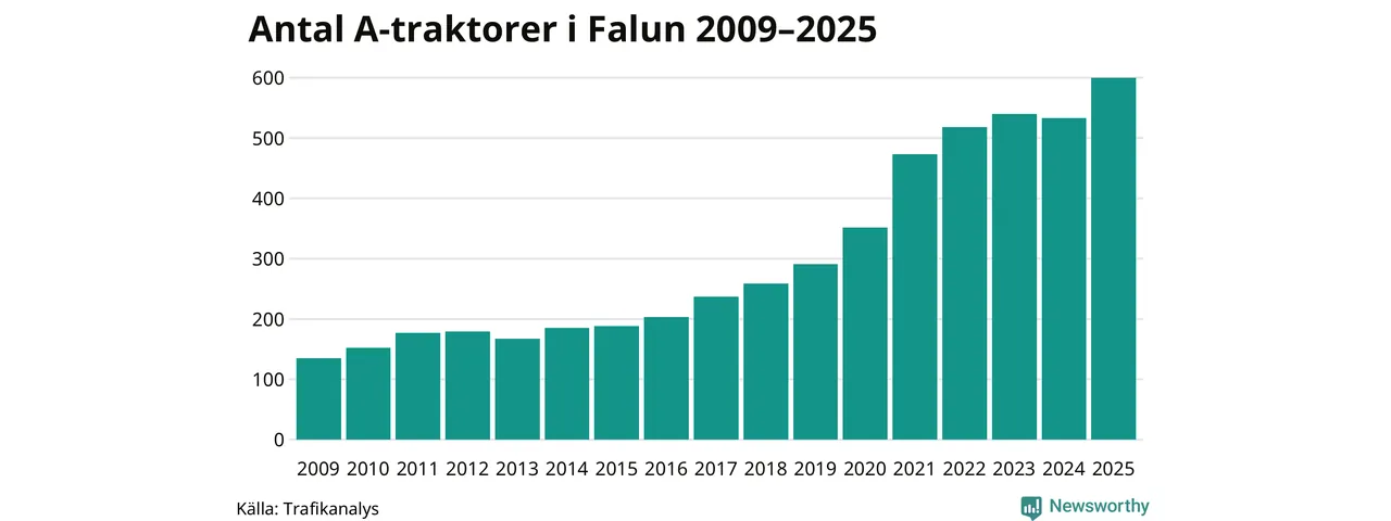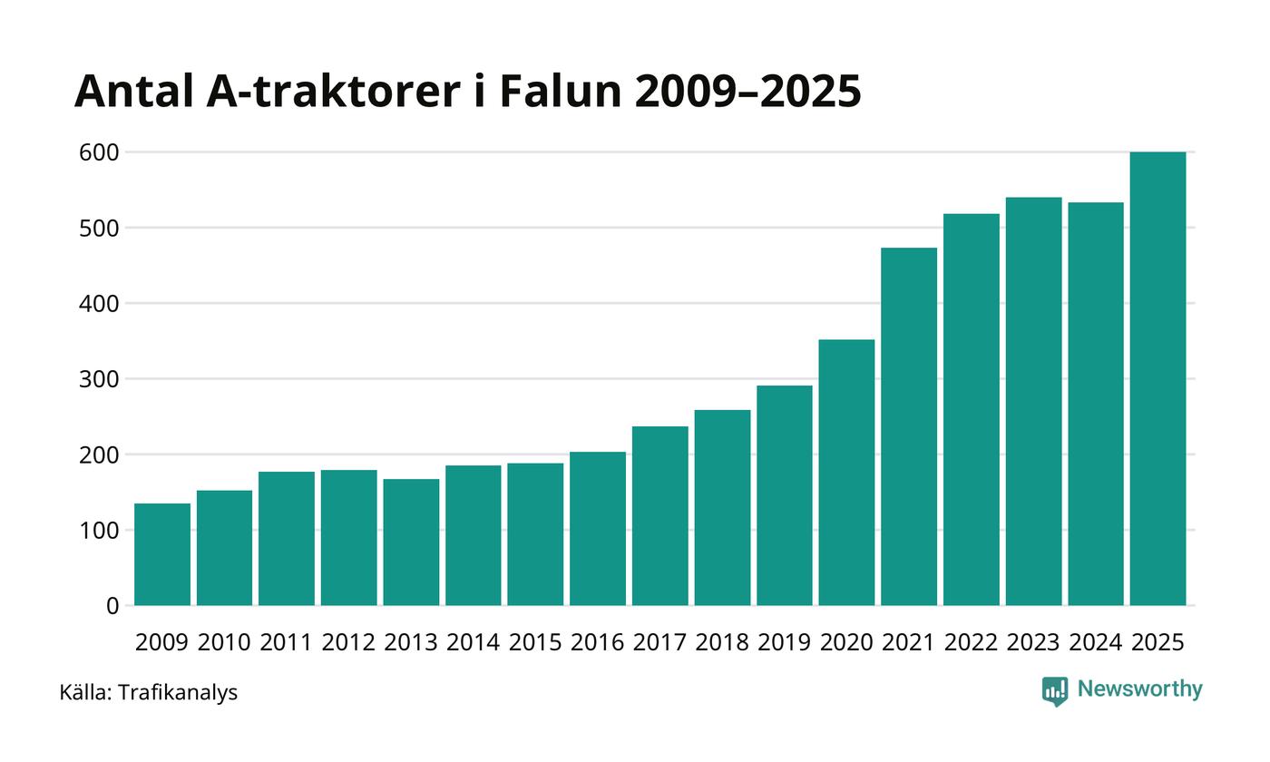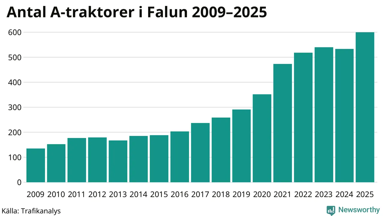I slutet av 2025 fanns 600 A-traktorer registrerade i kommunen, vilket är 67 mer än året innan – en ökning med 13 procent. Det visar nya siffror från Trafikanalys. Det är den näst största ökningen i Dalarnas län. Inte sedan åtminstone 2009, som är det första året vi har statistik för, har det funnits så många A-traktorer i kommunen.