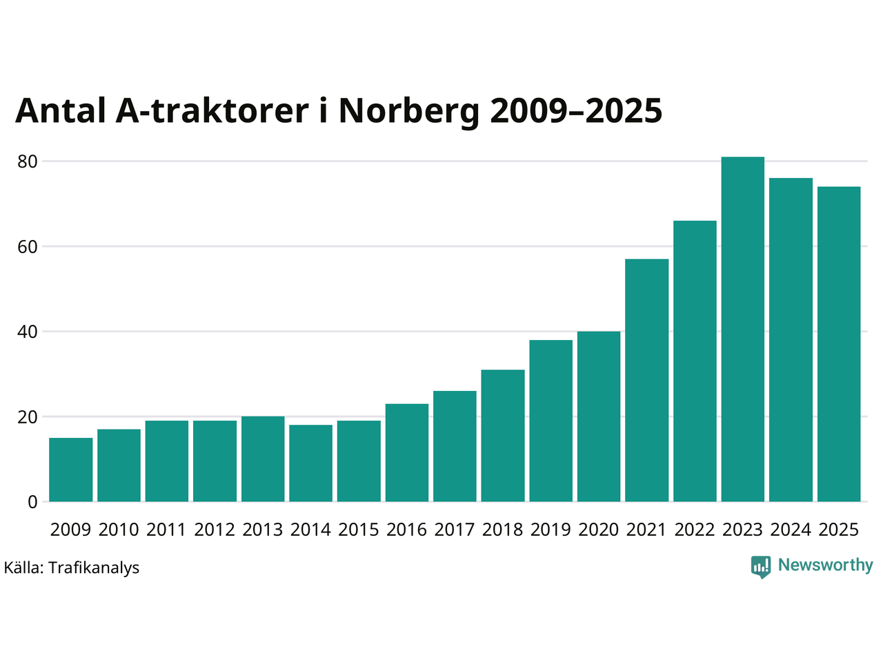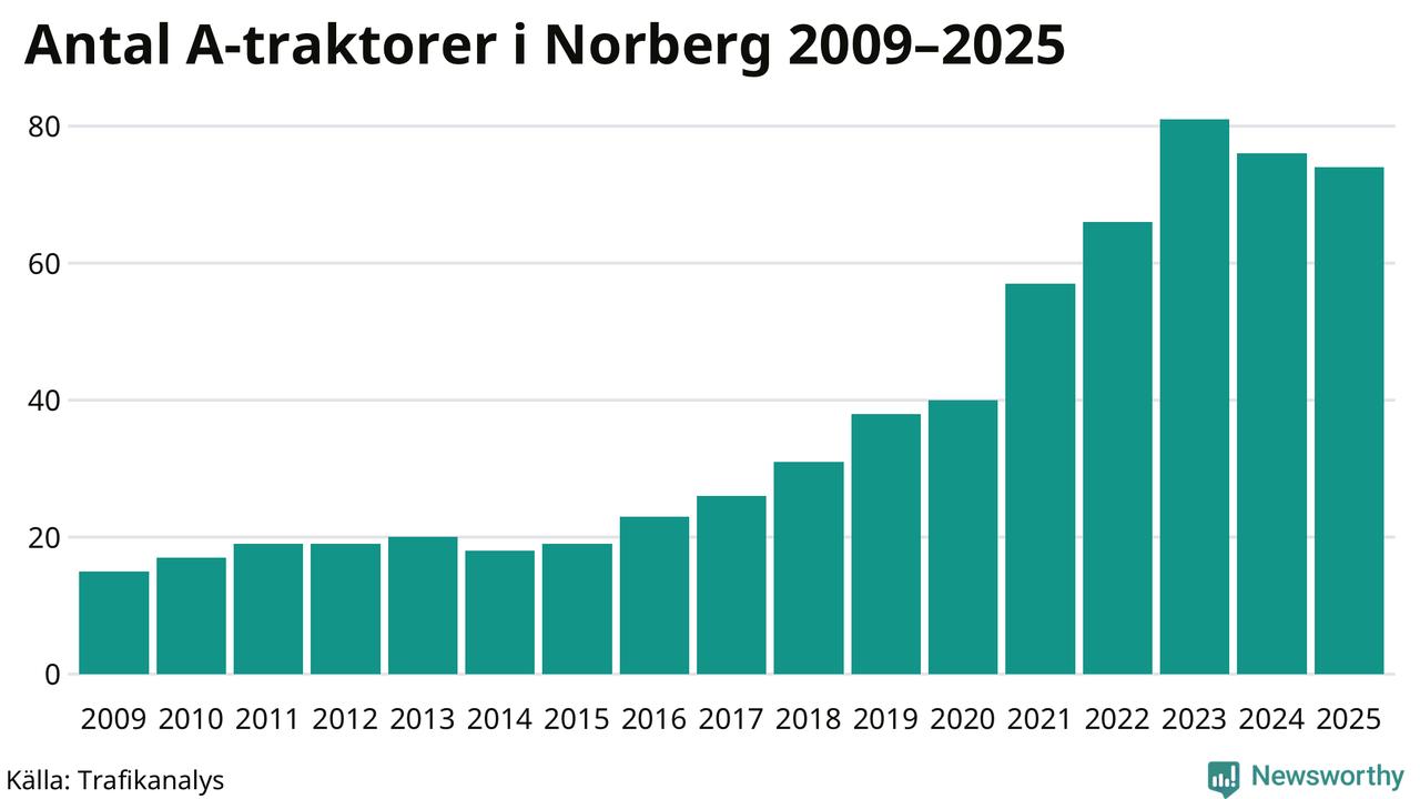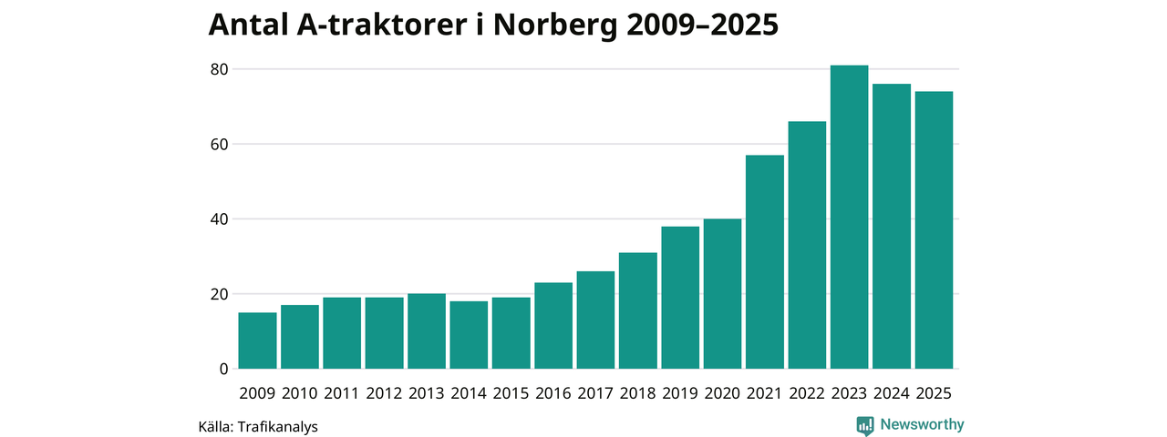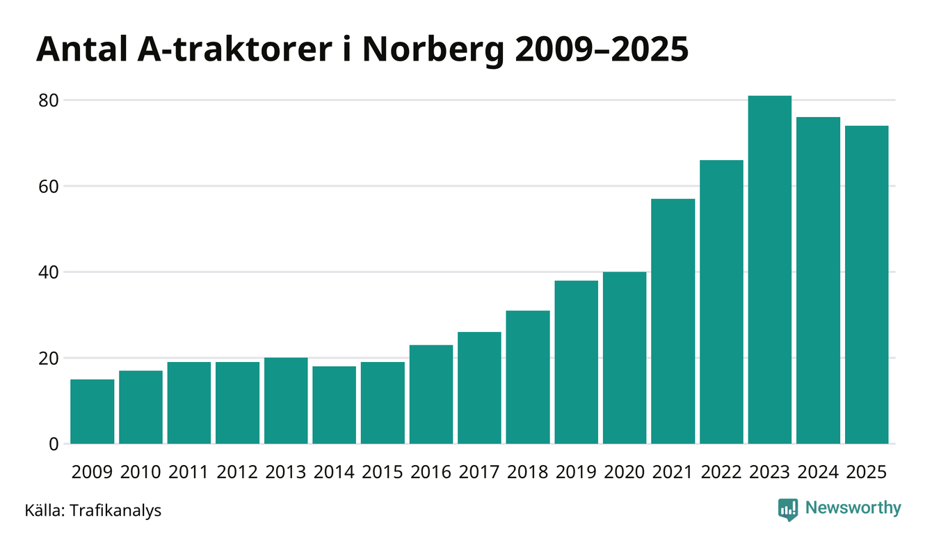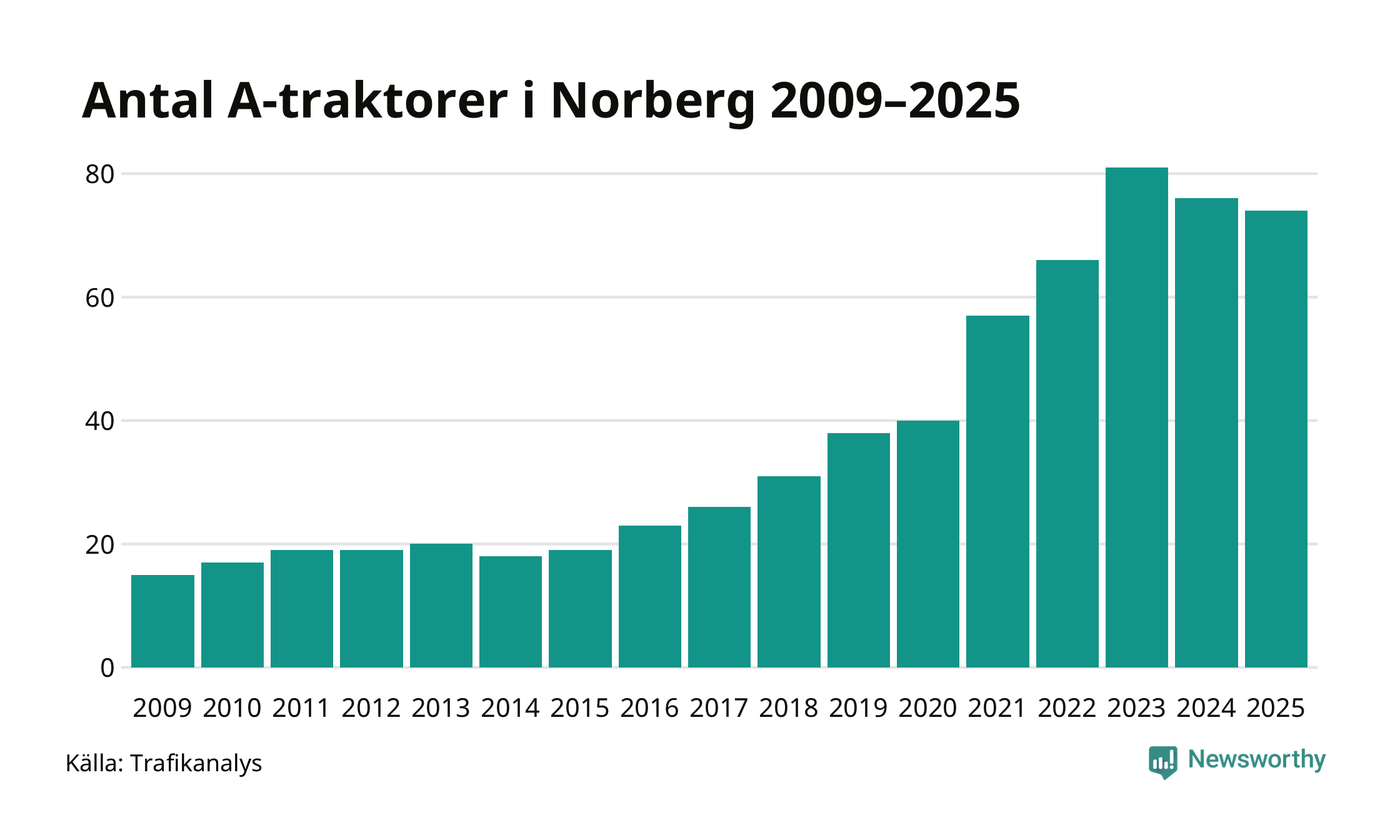 För andra året i rad minskar antalet A-traktorer i Norbergs kommun, visar nya siffror från Trafikanalys. I slutet av 2025 fanns 74 A-traktorer registrerade i Norbergs kommun, vilket är två mindre än året innan. Det visar nya siffror från Trafikanalys.