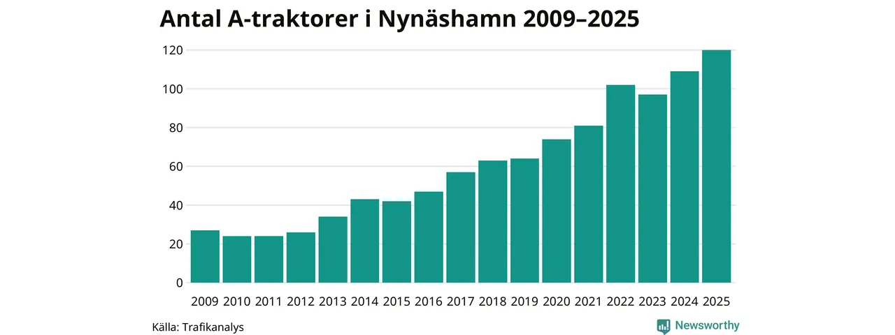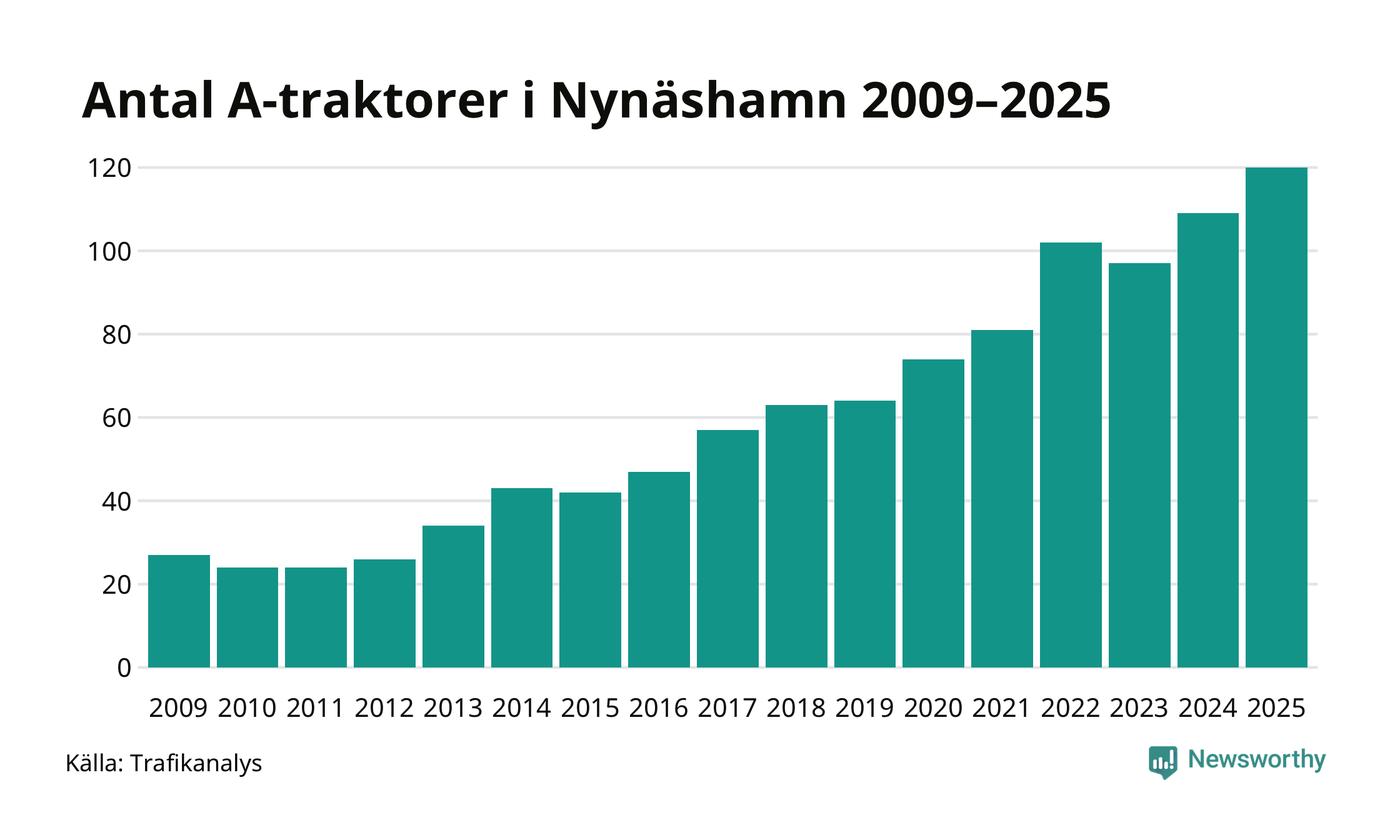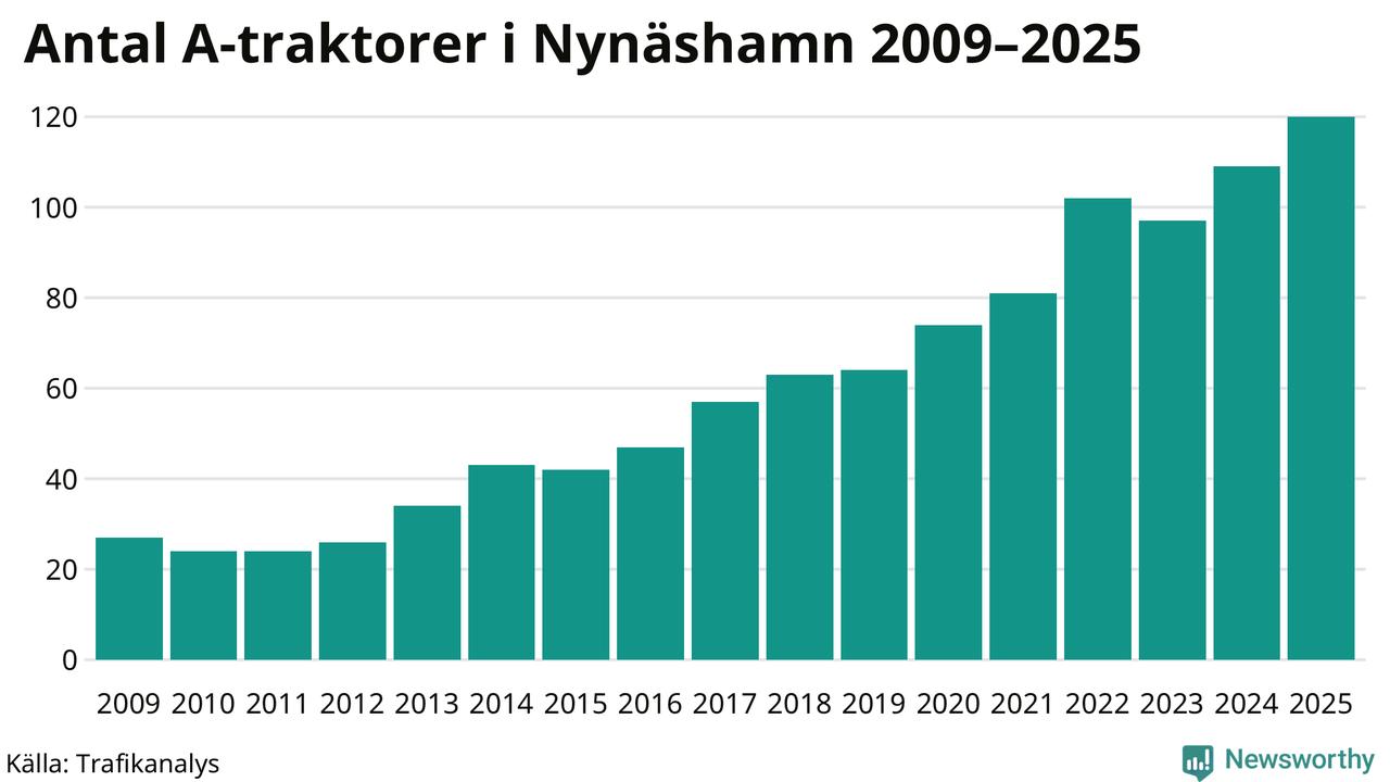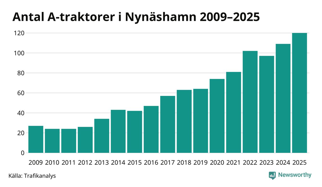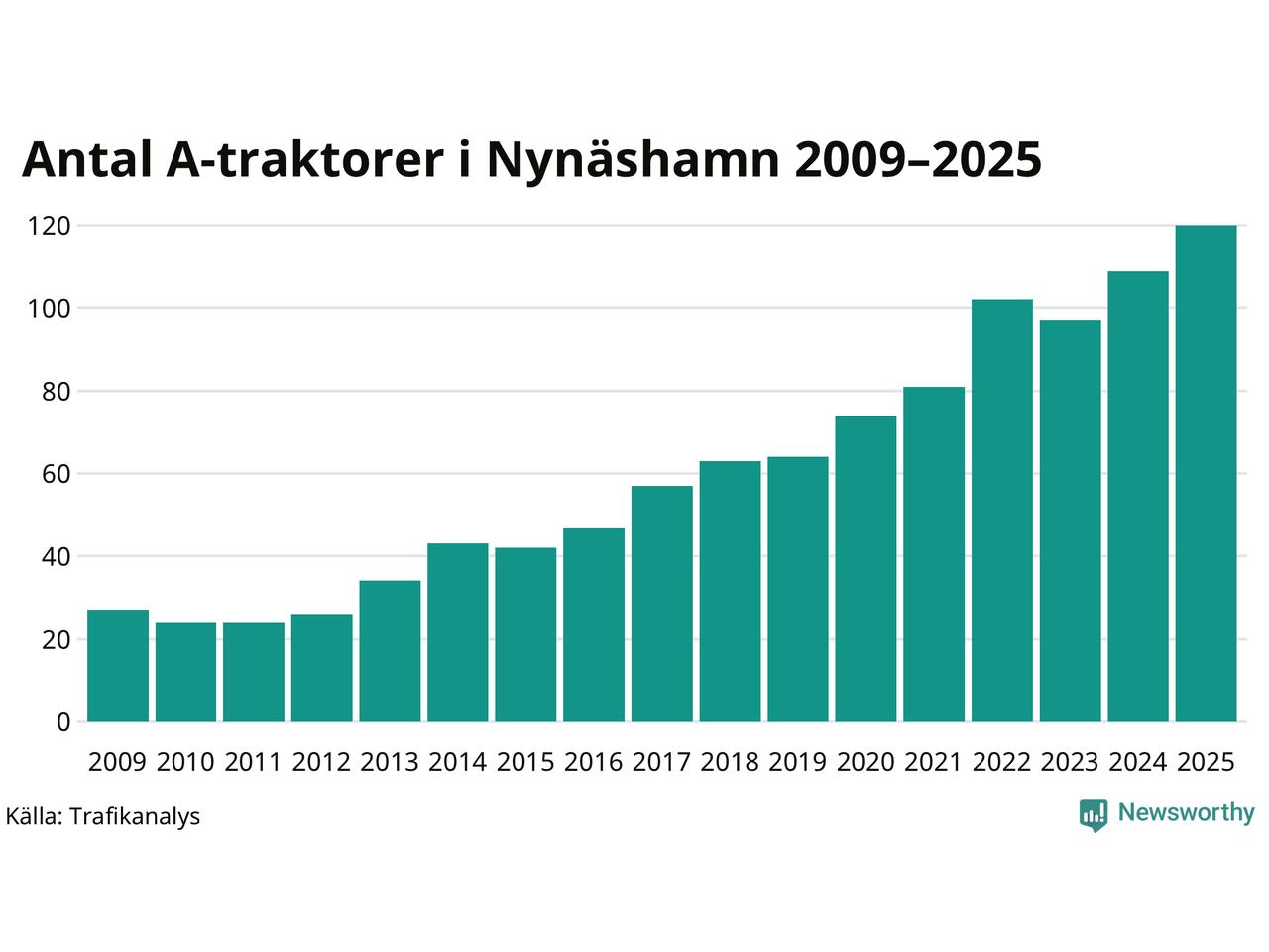 För andra året i rad ökar antalet A-traktorer i Nynäshamns kommun, visar nya siffror från Trafikanalys. I slutet av 2025 fanns 120 A-traktorer registrerade i kommunen, vilket är elva mer än året innan – en ökning med 10 procent. Det visar nya siffror från Trafikanalys. Inte sedan åtminstone 2009, som är det första året vi har statistik för, har det funnits så många A-traktorer i kommunen.