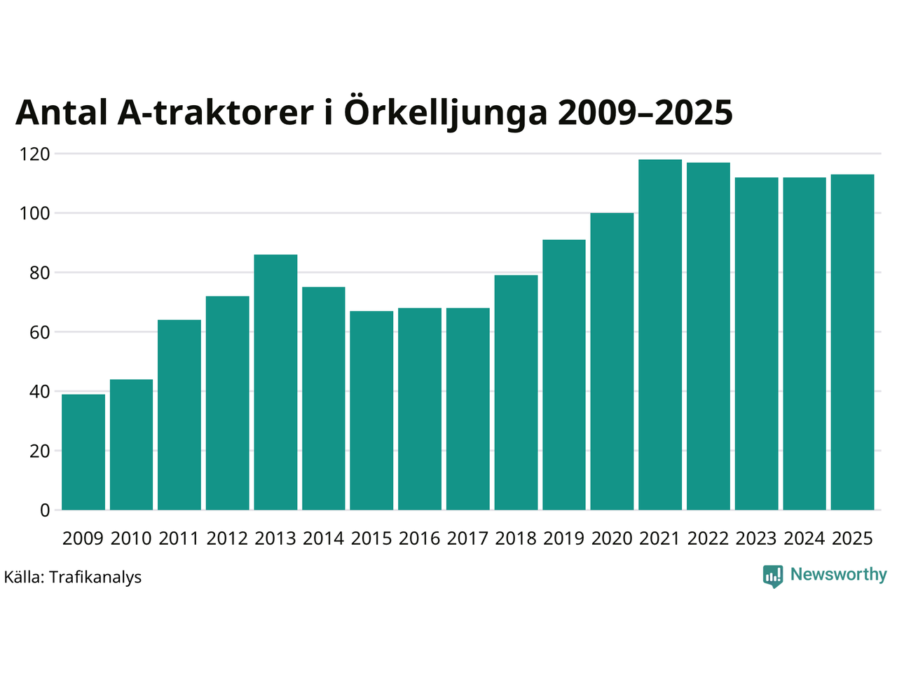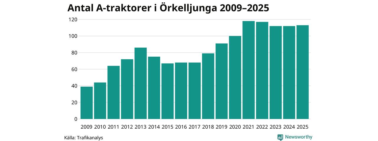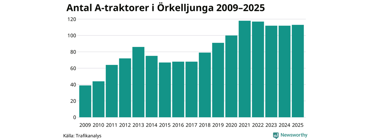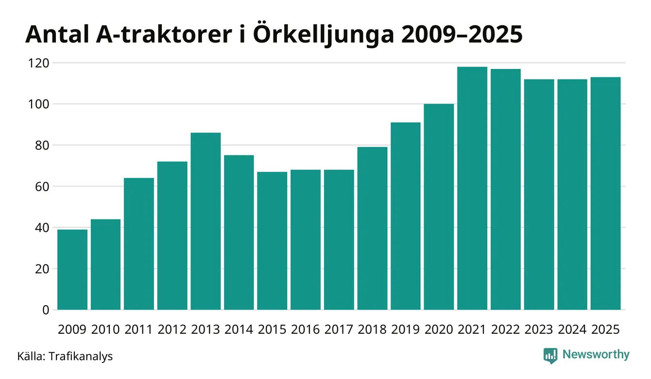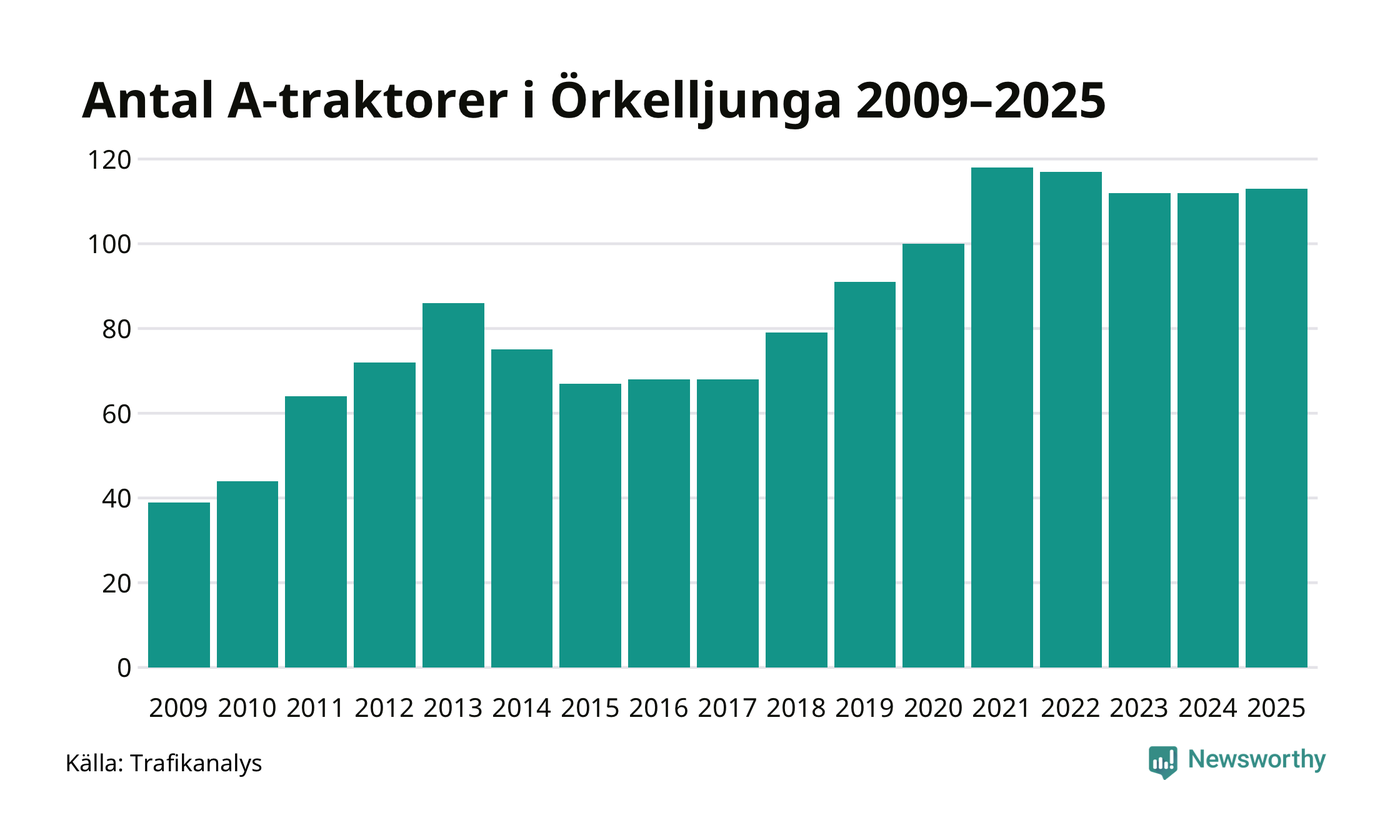 I slutet av 2025 fanns 113 A-traktorer registrerade i Örkelljunga kommun, vilket är en mer än året innan. Det visar nya siffror från Trafikanalys.
