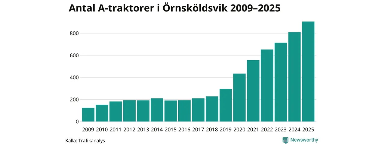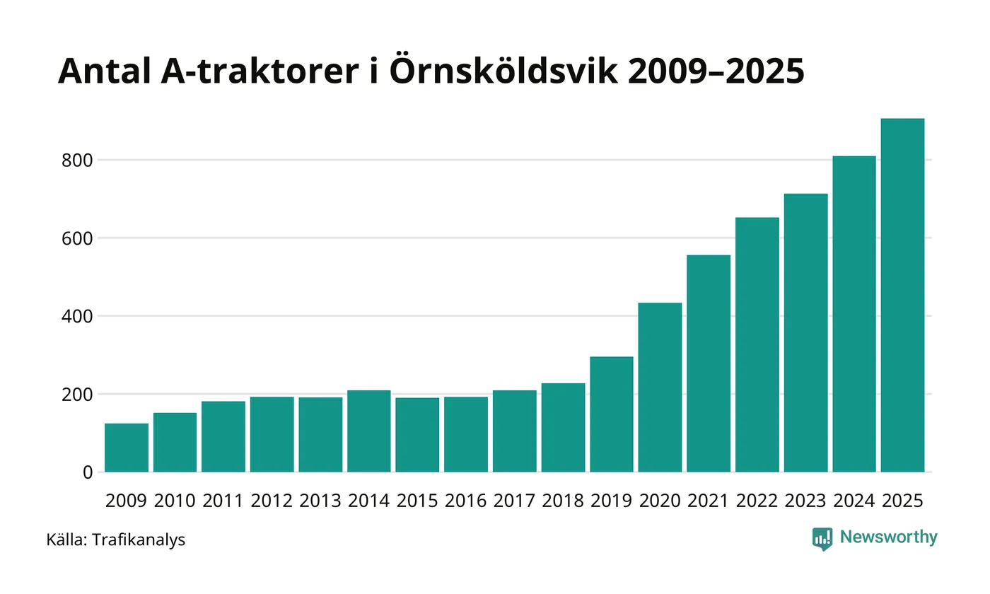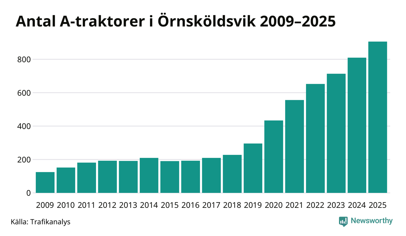 För tionde året i rad ökar antalet A-traktorer i Örnsköldsviks kommun, visar nya siffror från Trafikanalys. I slutet av 2025 fanns 906 A-traktorer registrerade i kommunen, vilket är 96 mer än året innan – en ökning med 12 procent. Det är den största ökningen i Västernorrlands län. Inte sedan åtminstone 2009, som är det första året vi har statistik för, har det funnits så många A-traktorer i kommunen.
