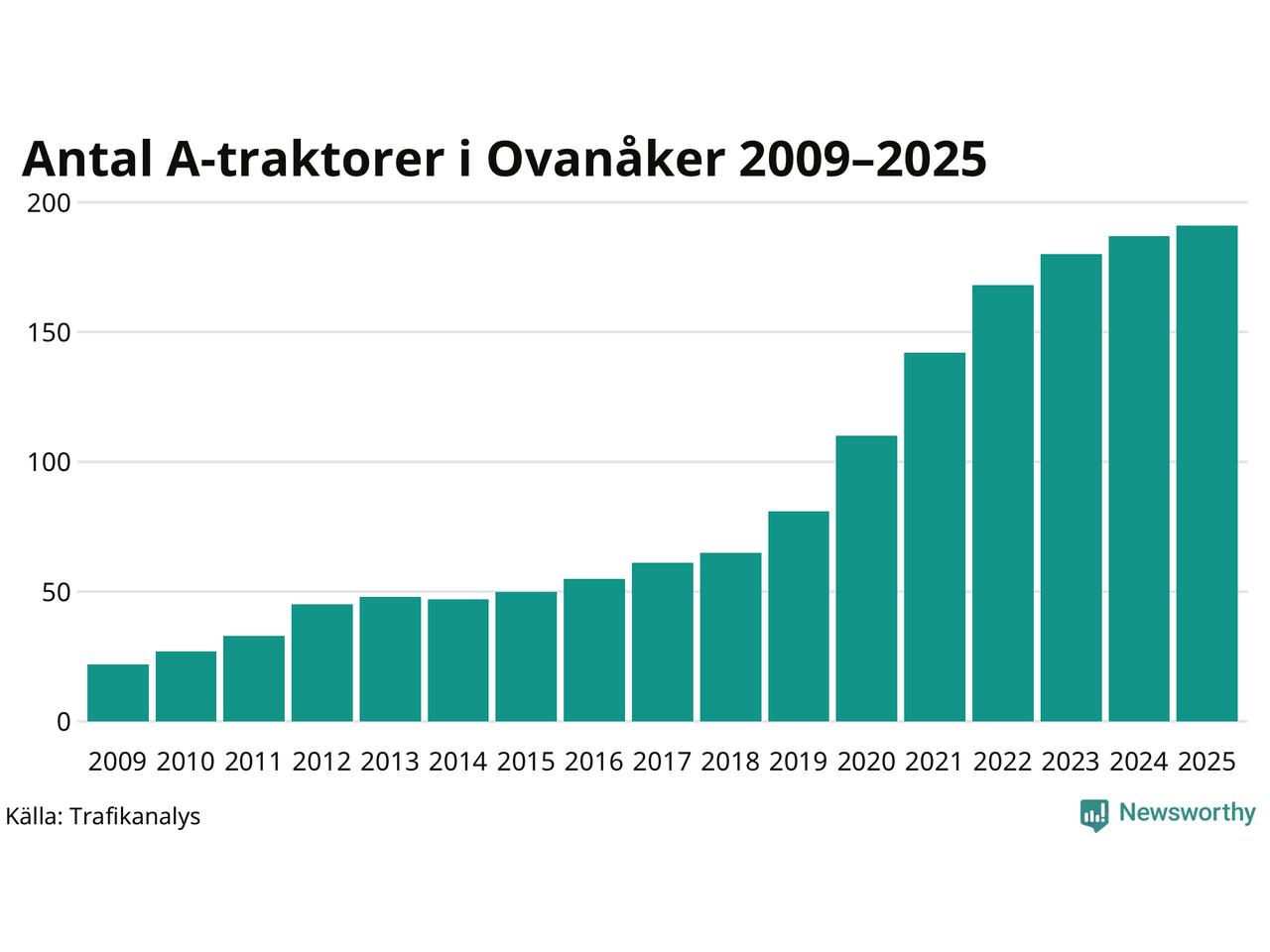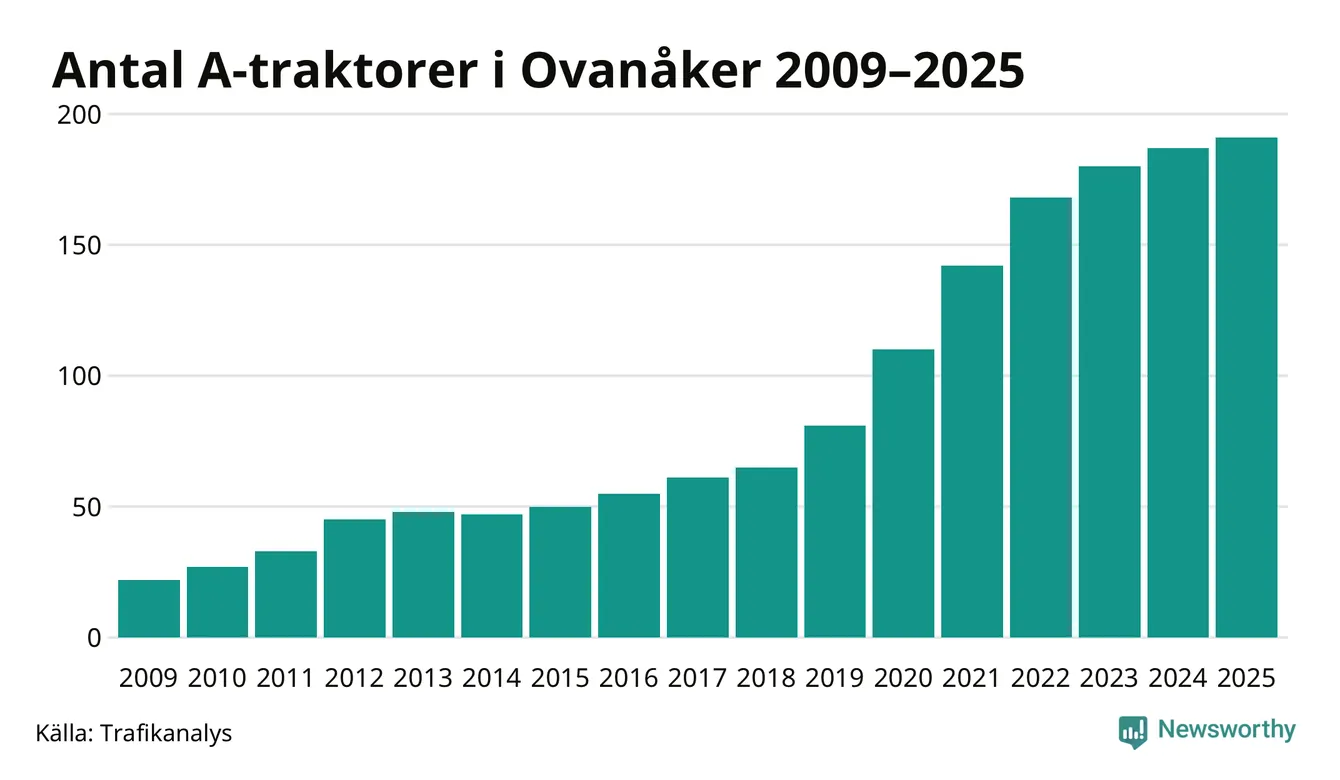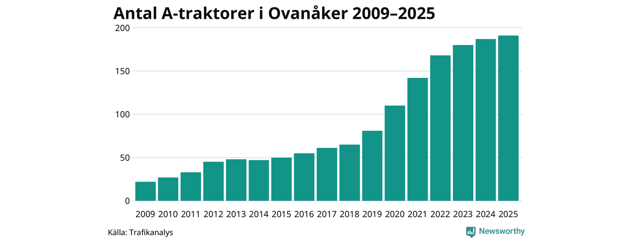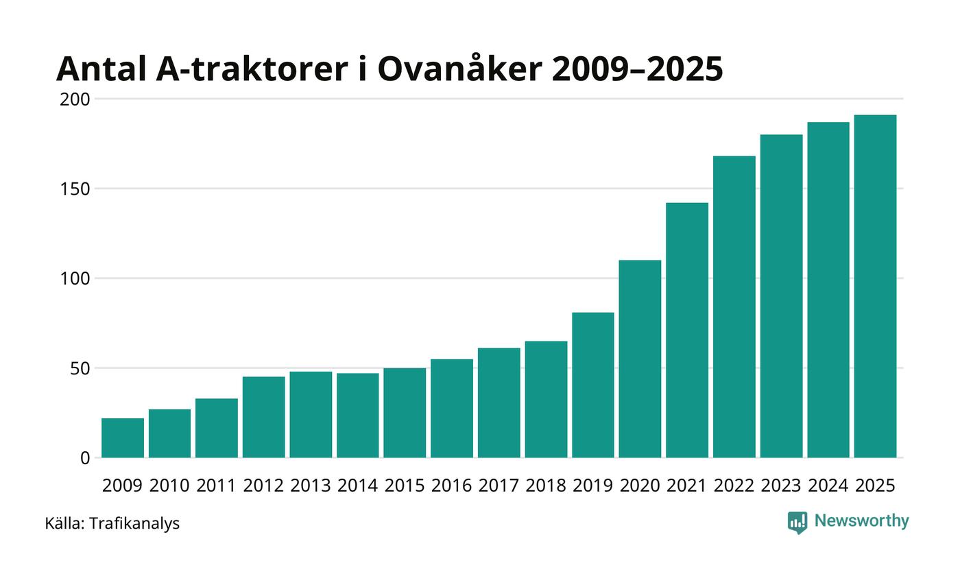 För elfte året i rad ökar antalet A-traktorer i Ovanåkers kommun, visar nya siffror från Trafikanalys. I slutet av 2025 fanns 191 A-traktorer registrerade i kommunen, vilket är fyra mer än året innan. Inte sedan åtminstone 2009, som är det första året vi har statistik för, har det funnits så många A-traktorer i kommunen.