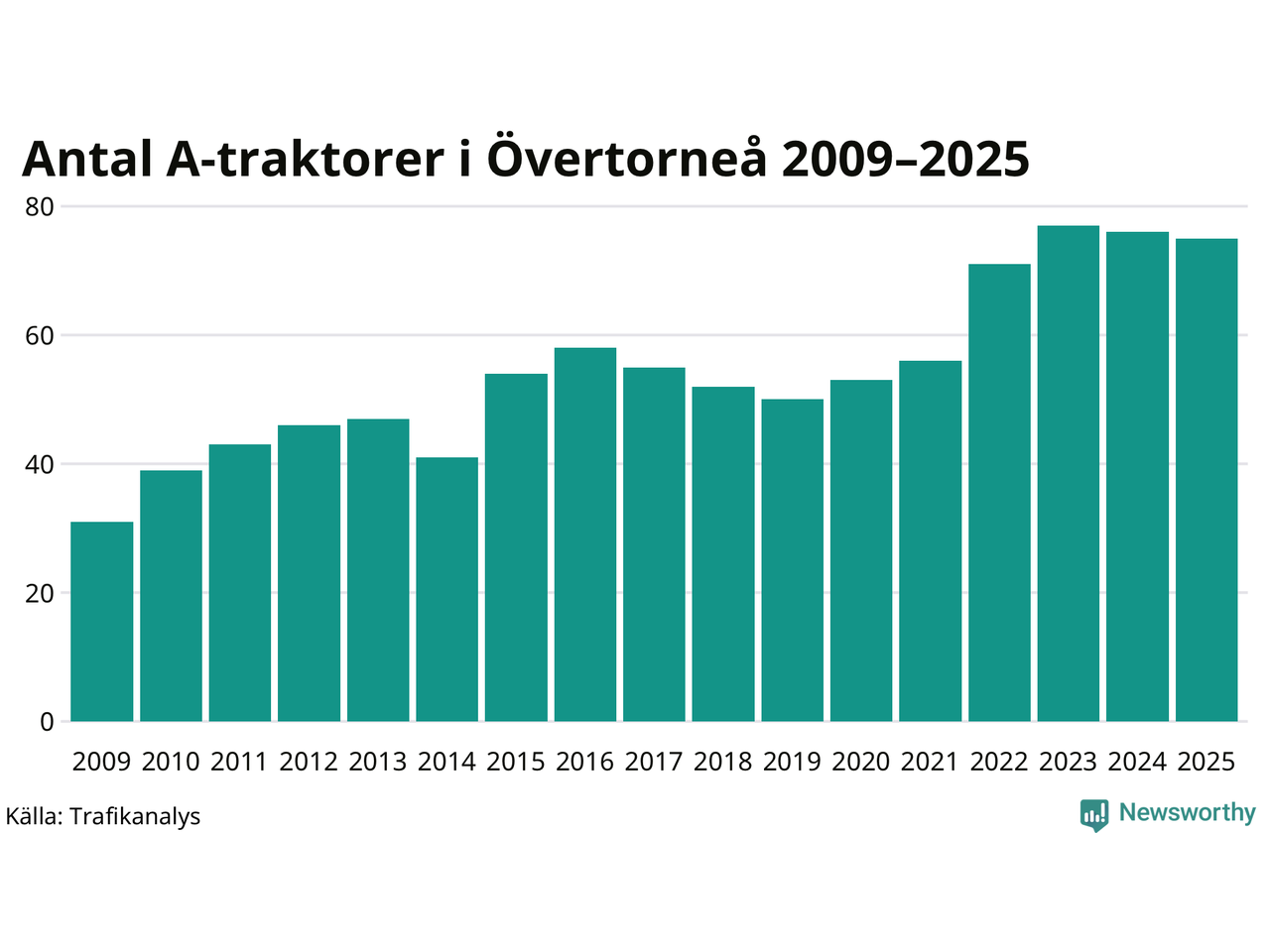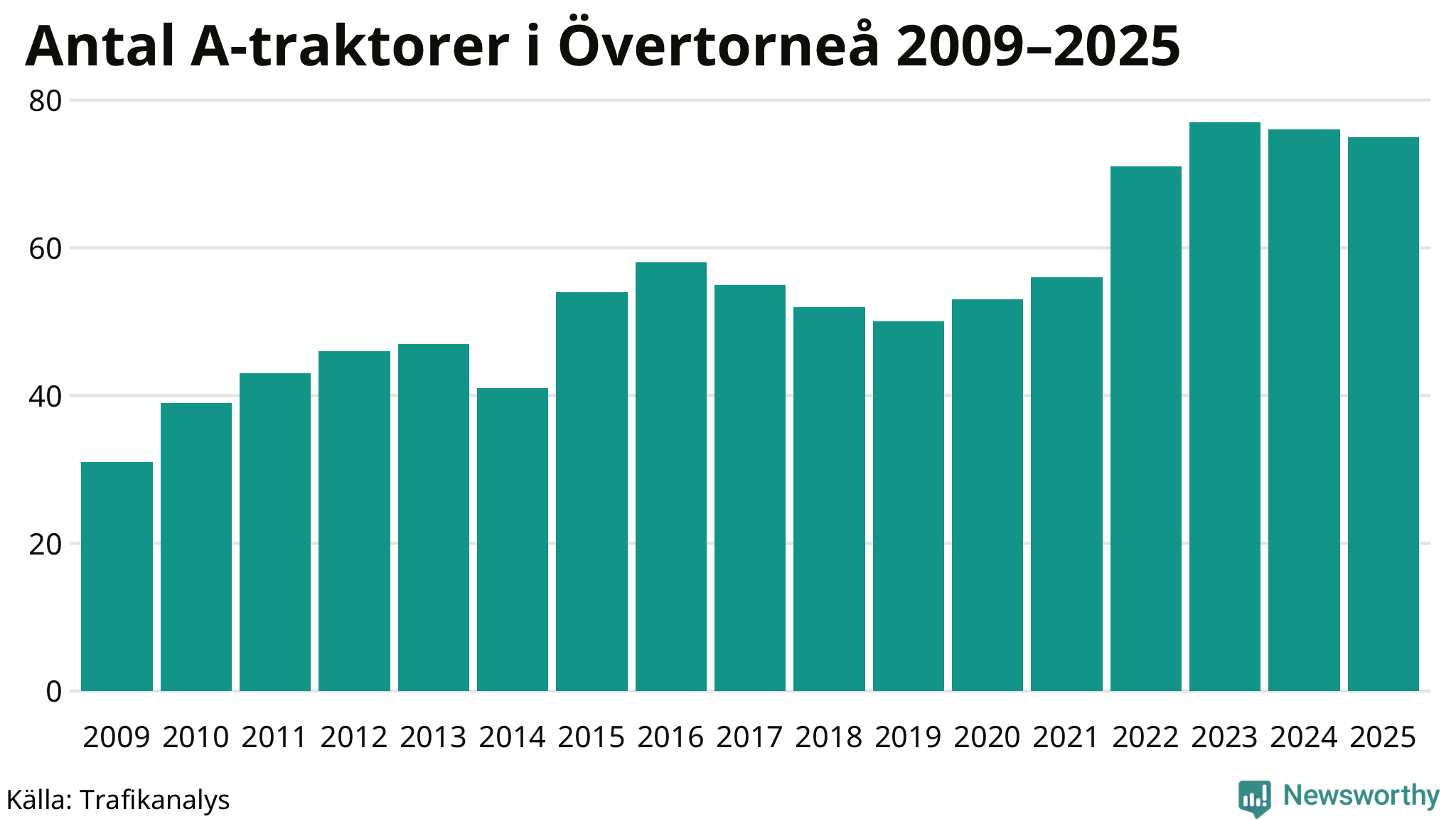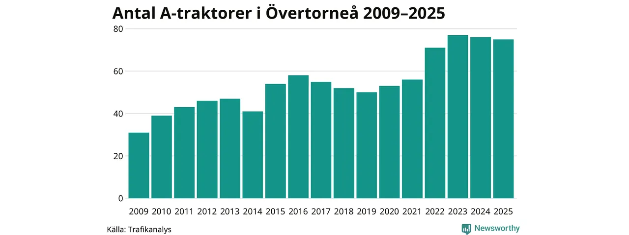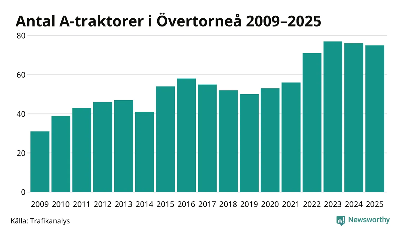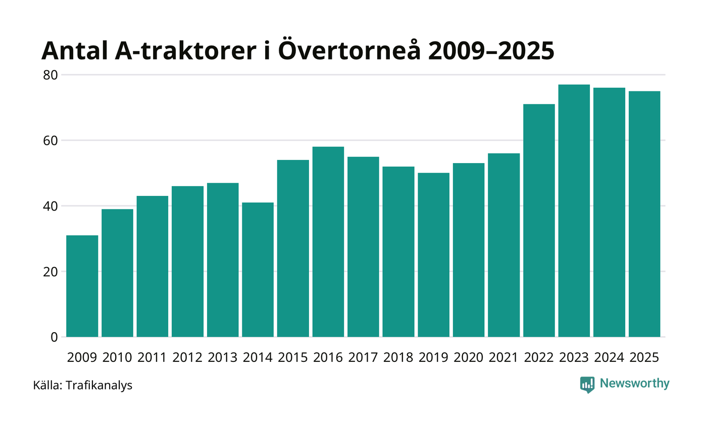 I slutet av 2025 fanns 75 A-traktorer registrerade i Övertorneå kommun, vilket är en mindre än året innan. Det visar nya siffror från Trafikanalys.