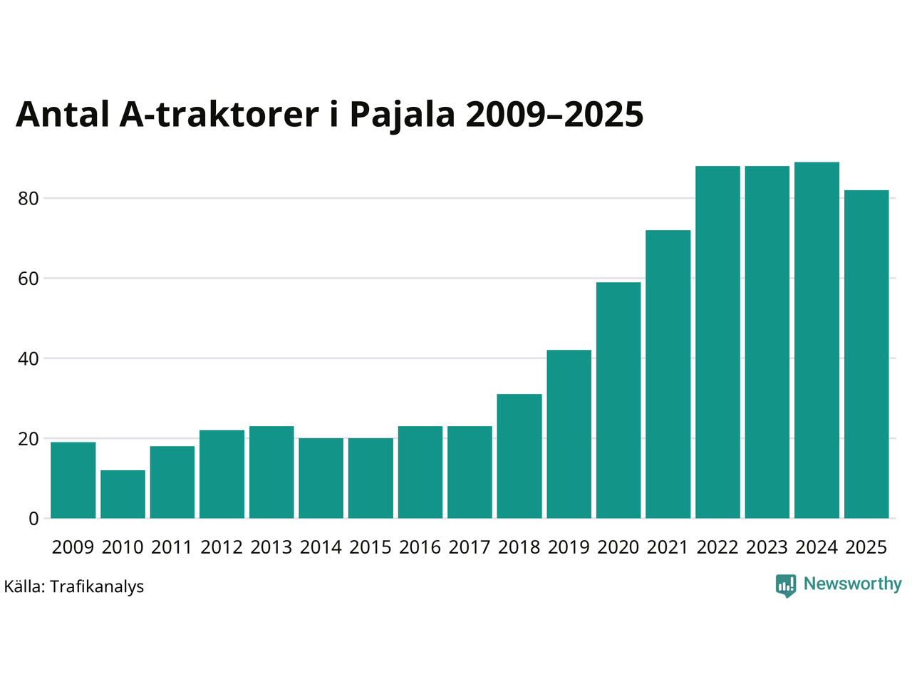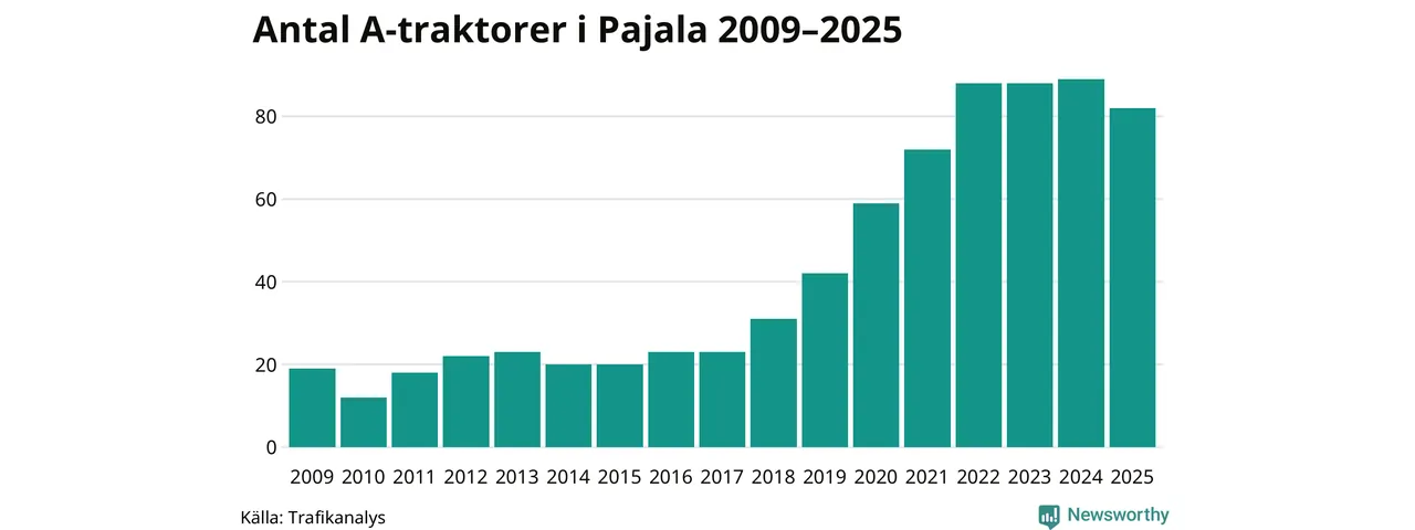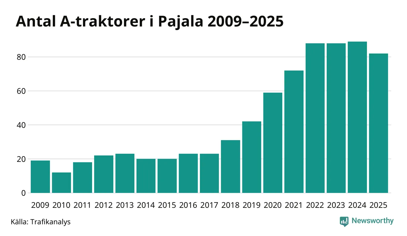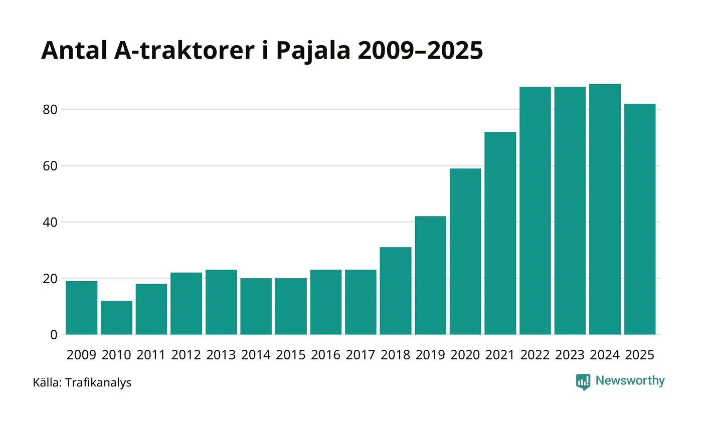 Under det senaste decenniet har antalet A-traktorer femdubblats i Sverige – och under 2025 fortsatte utvecklingen. Men i Pajala kommun blev de färre under förra året.