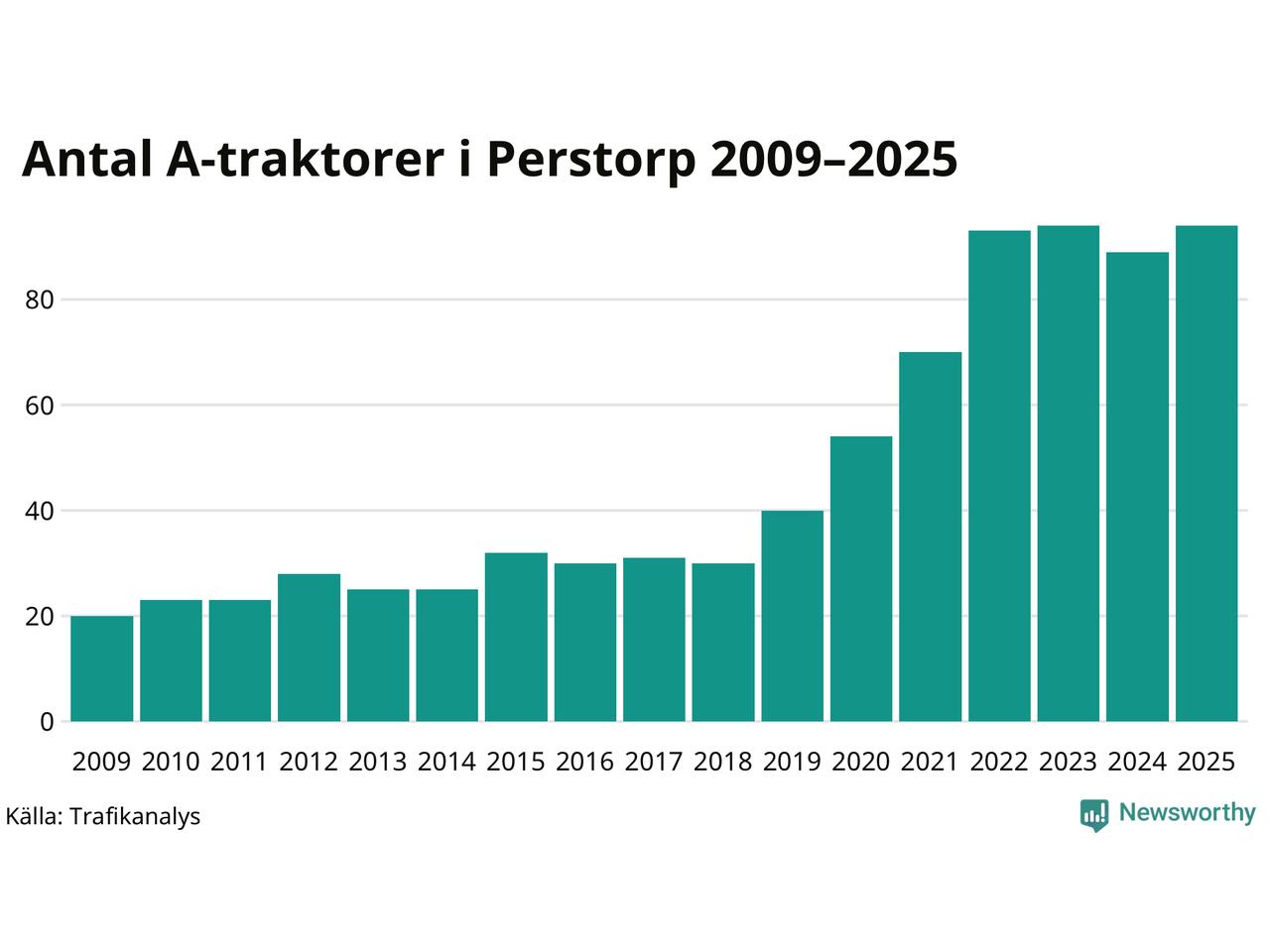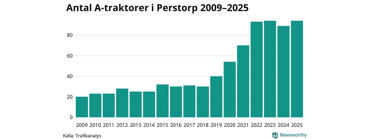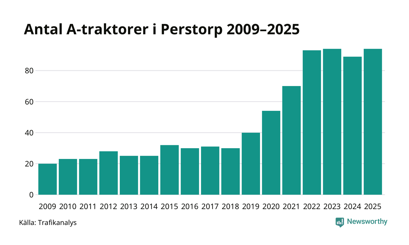 I slutet av 2025 fanns 94 A-traktorer registrerade i kommunen, vilket är fem mer än året innan. Det visar nya siffror från Trafikanalys. Inte sedan åtminstone 2009, som är det första året vi har statistik för, har det funnits så många A-traktorer i kommunen.
