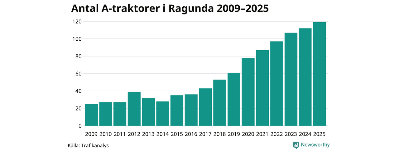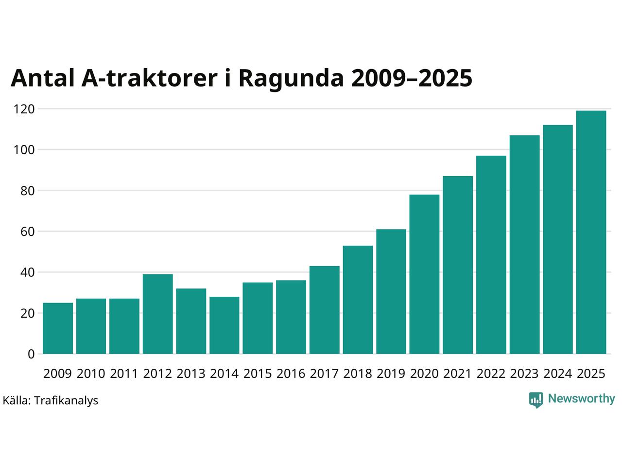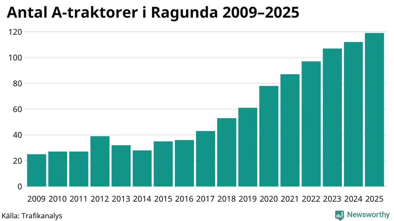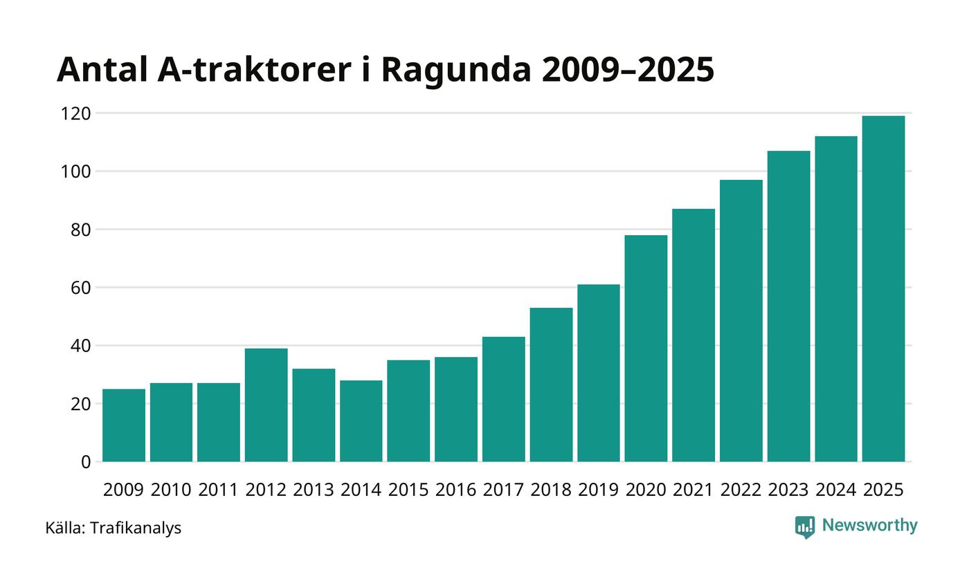 För elfte året i rad ökar antalet A-traktorer i Ragunda kommun, visar nya siffror från Trafikanalys. I slutet av 2025 fanns 119 A-traktorer registrerade i kommunen, vilket är sju mer än året innan – en ökning med 6 procent. Inte sedan åtminstone 2009, som är det första året vi har statistik för, har det funnits så många A-traktorer i kommunen.