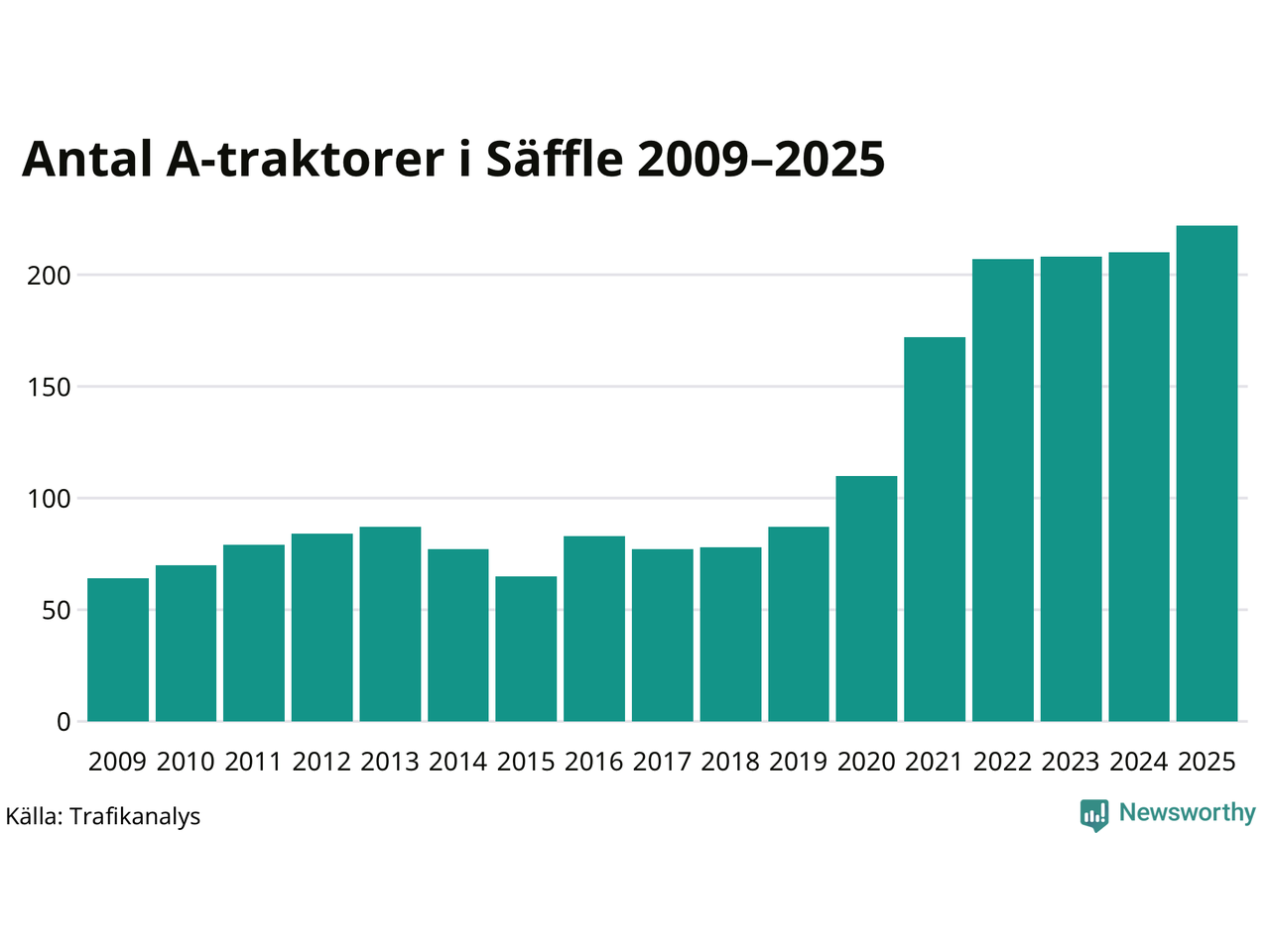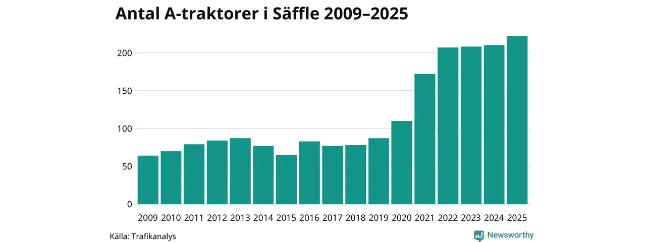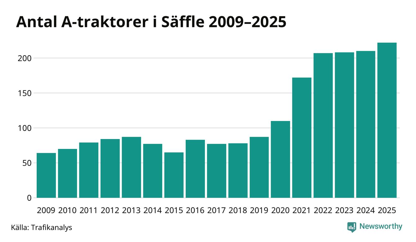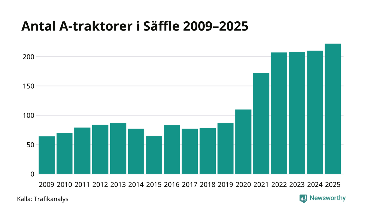 För åttonde året i rad ökar antalet A-traktorer i Säffle kommun, visar nya siffror från Trafikanalys. I slutet av 2025 fanns 222 A-traktorer registrerade i kommunen, vilket är tolv mer än året innan – en ökning med 6 procent. Inte sedan åtminstone 2009, som är det första året vi har statistik för, har det funnits så många A-traktorer i kommunen.