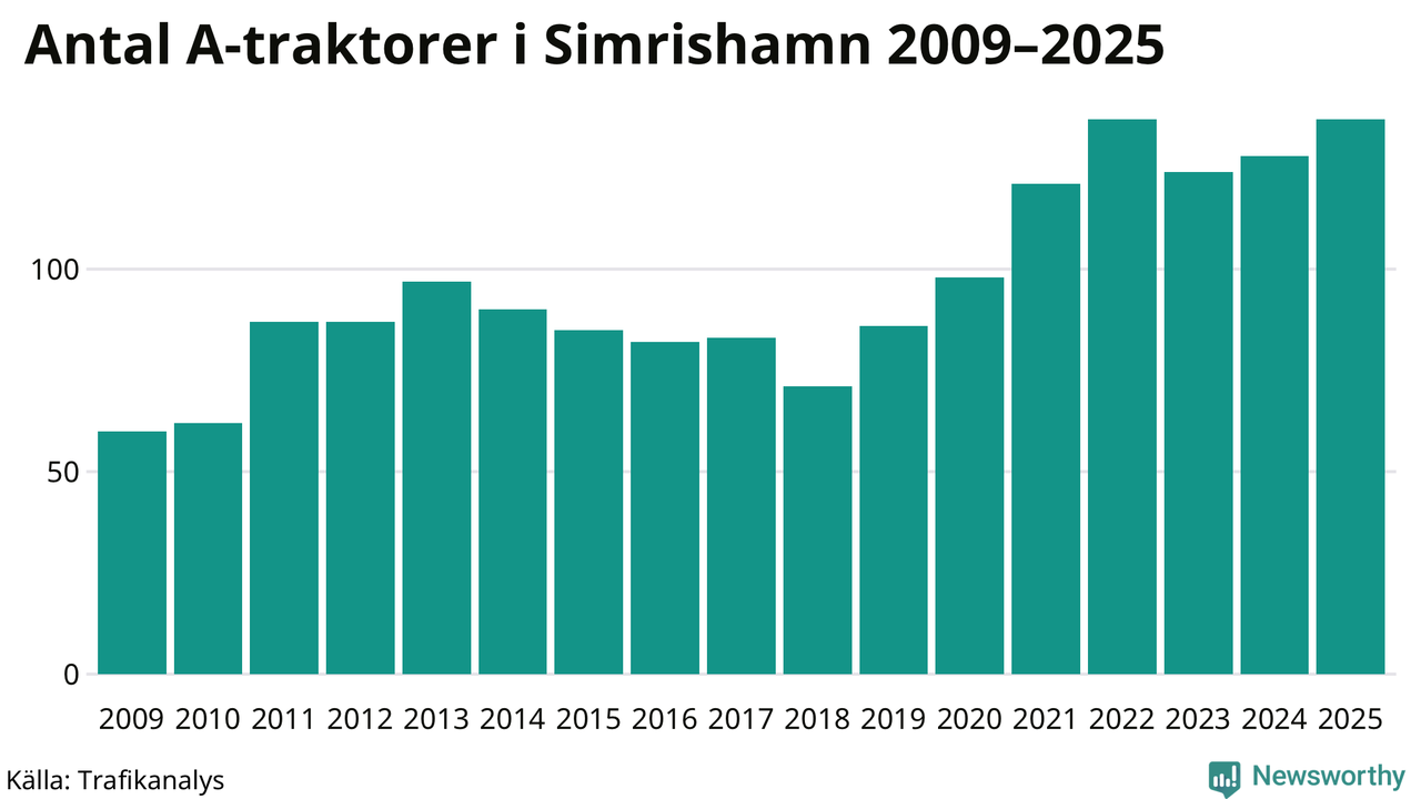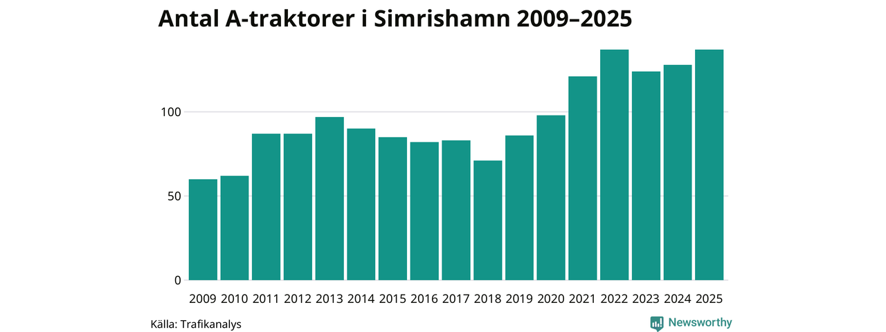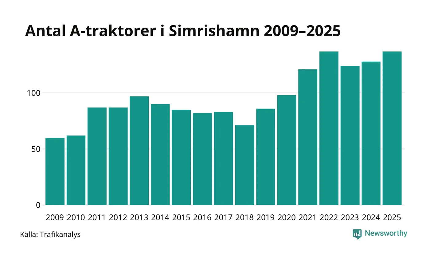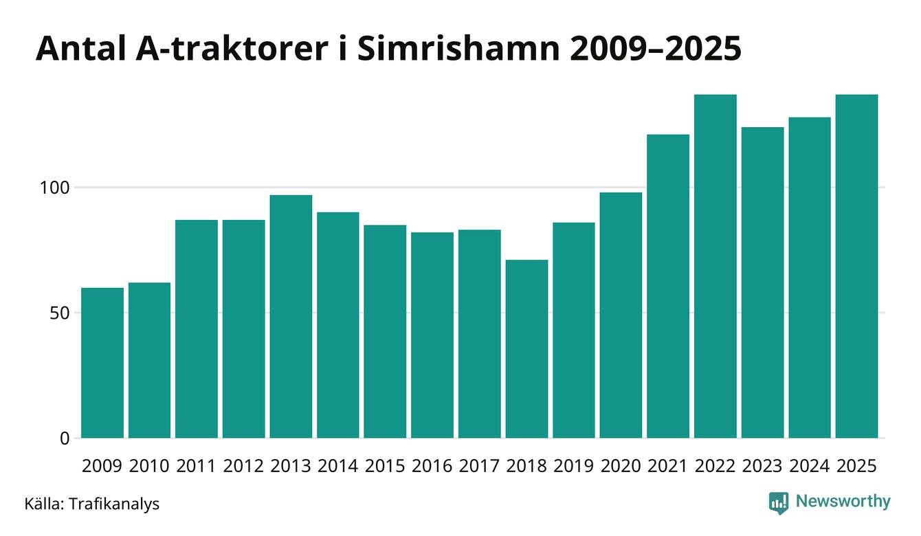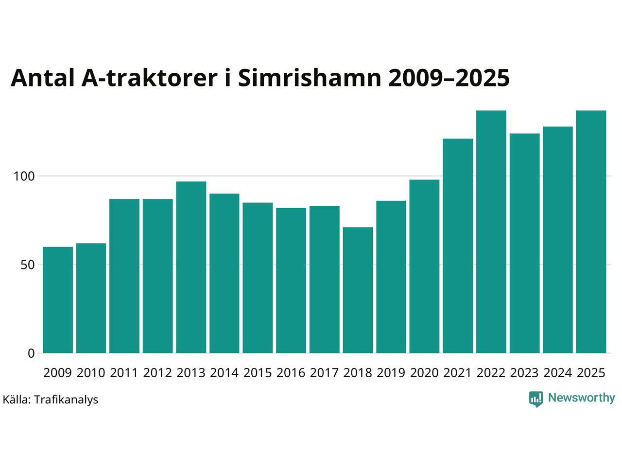 För andra året i rad ökar antalet A-traktorer i Simrishamns kommun, visar nya siffror från Trafikanalys. I slutet av 2025 fanns 137 A-traktorer registrerade i kommunen, vilket är nio mer än året innan – en ökning med 7 procent. Det visar nya siffror från Trafikanalys. Inte sedan åtminstone 2009, som är det första året vi har statistik för, har det funnits så många A-traktorer i kommunen.