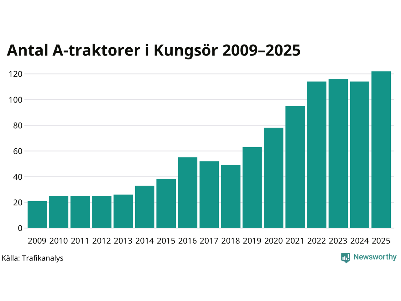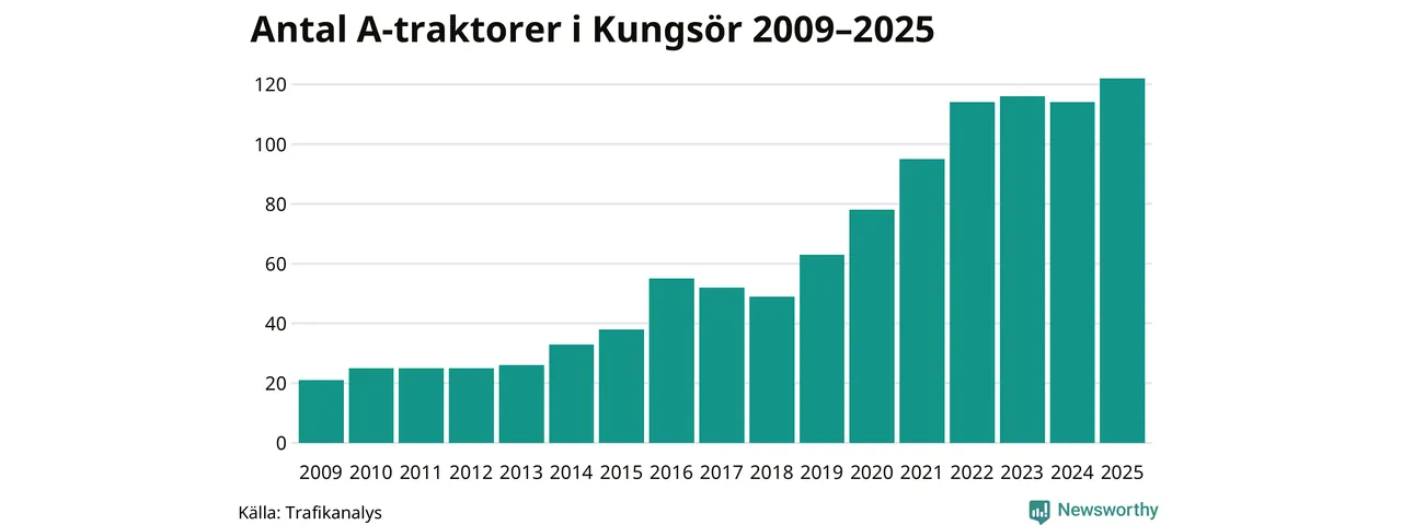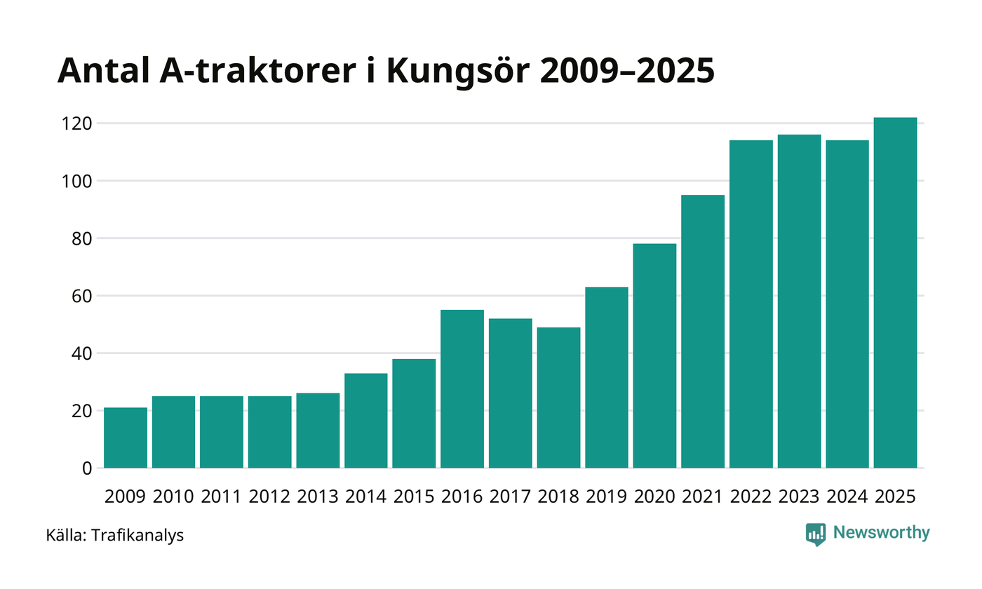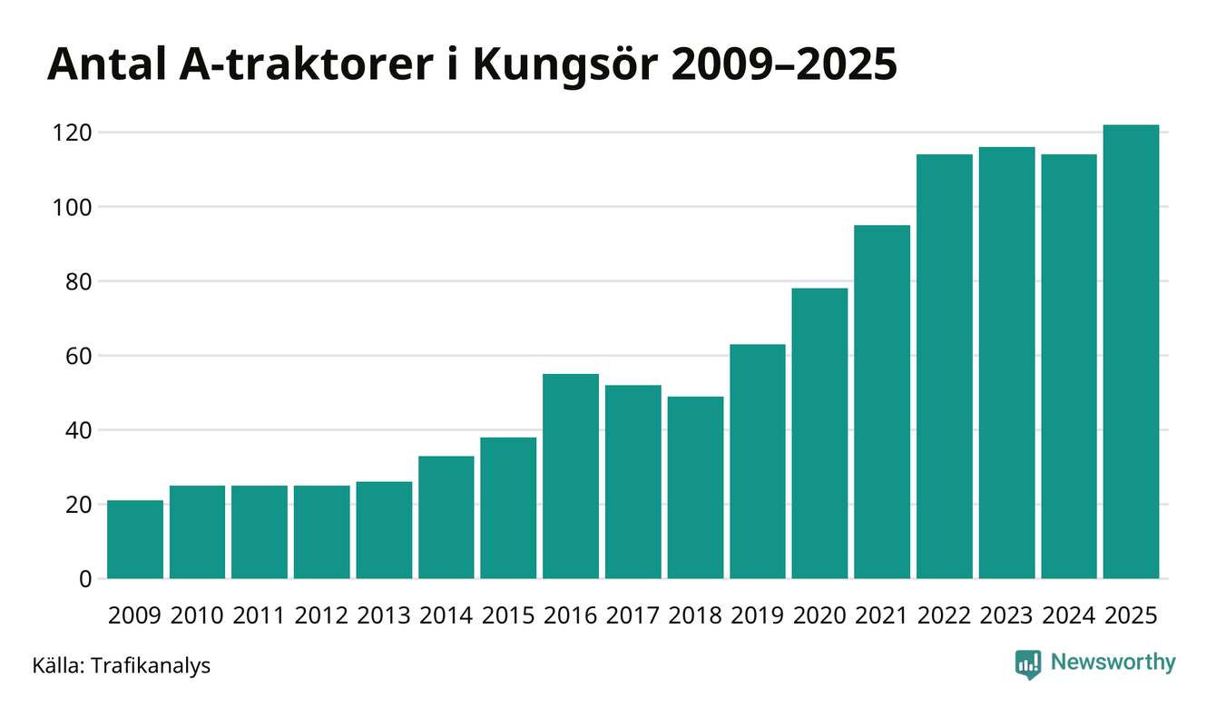 I slutet av 2025 fanns 122 A-traktorer registrerade i kommunen, vilket är åtta mer än året innan – en ökning med 7 procent. Det visar nya siffror från Trafikanalys. Inte sedan åtminstone 2009, som är det första året vi har statistik för, har det funnits så många A-traktorer i kommunen.