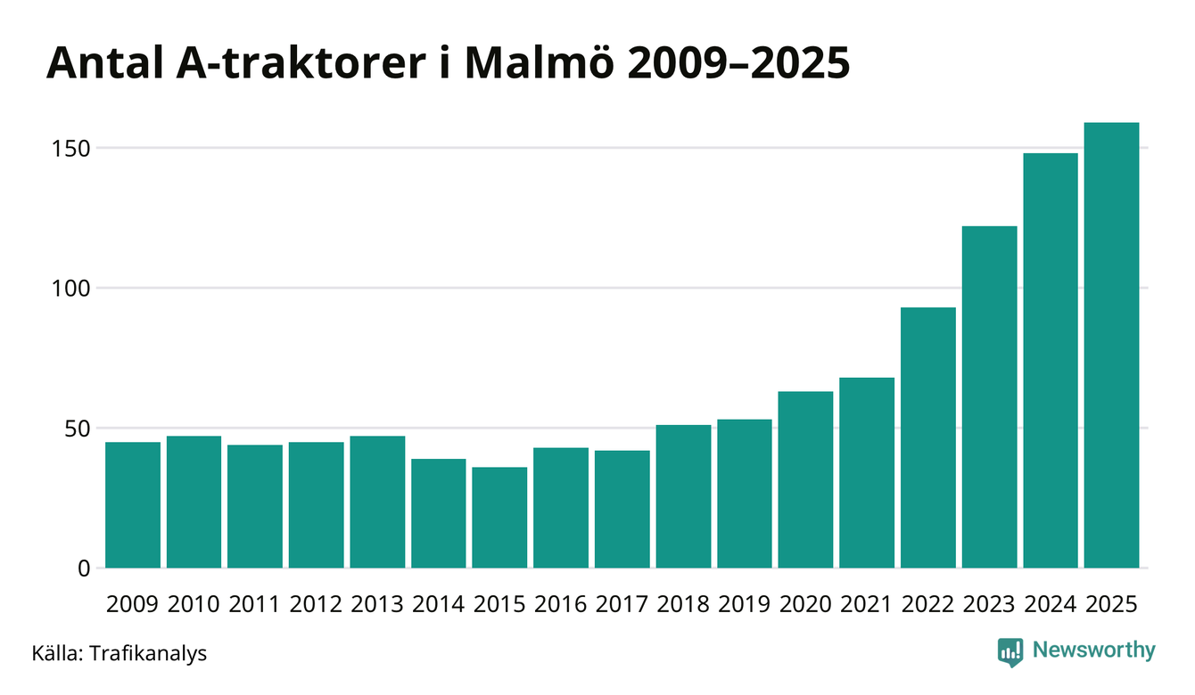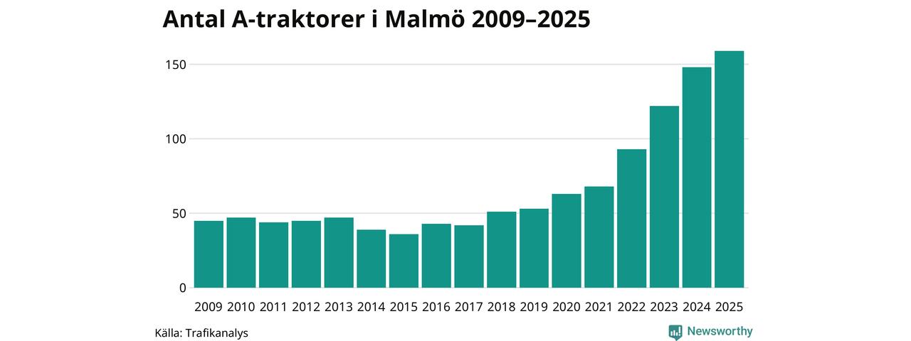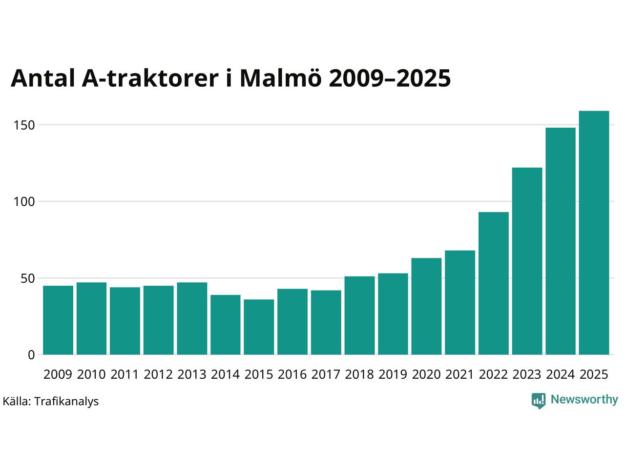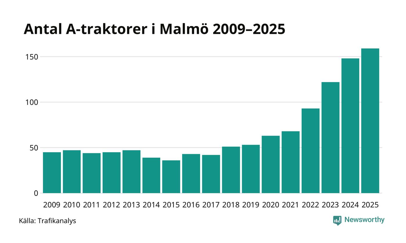 För åttonde året i rad ökar antalet A-traktorer i Malmö kommun, visar nya siffror från Trafikanalys. I slutet av 2025 fanns 159 A-traktorer registrerade i kommunen, vilket är elva mer än året innan – en ökning med 7 procent. Inte sedan åtminstone 2009, som är det första året vi har statistik för, har det funnits så många A-traktorer i kommunen.