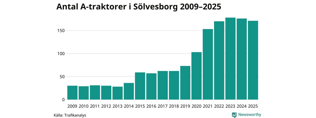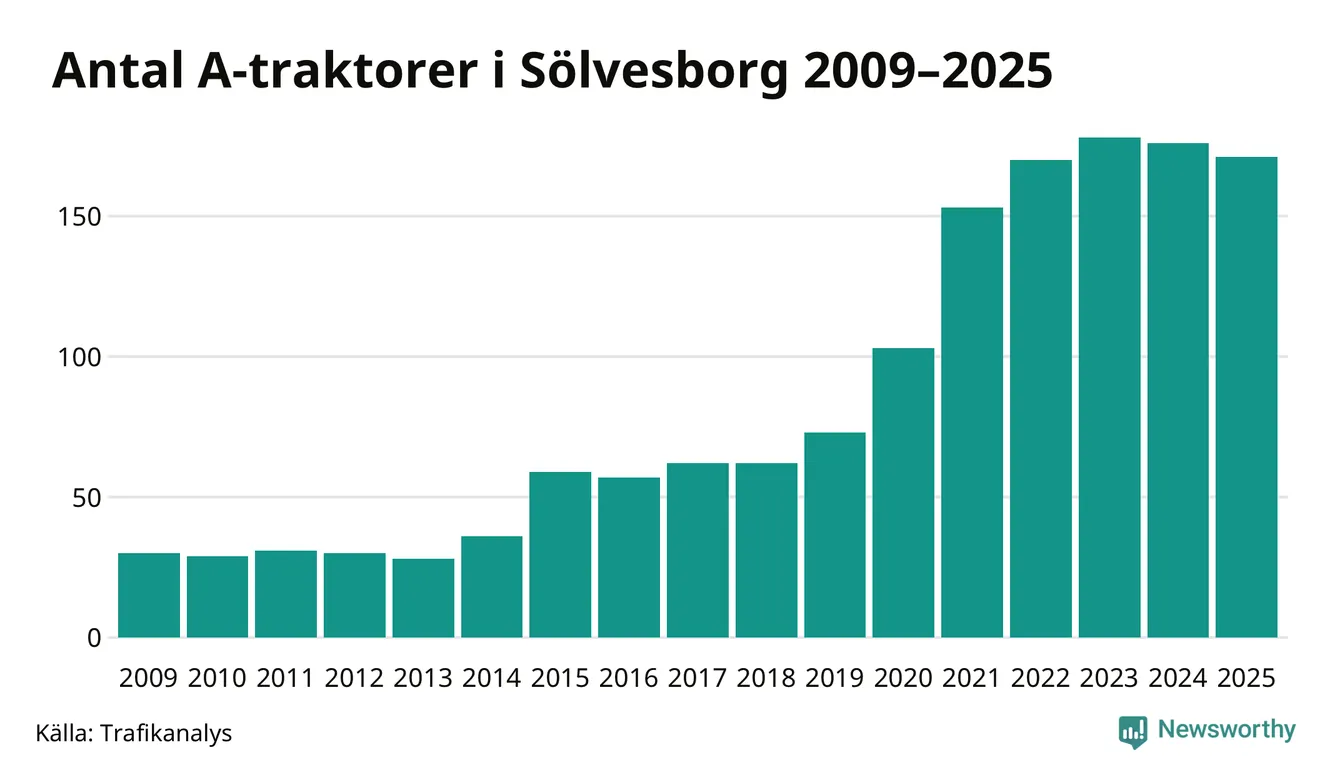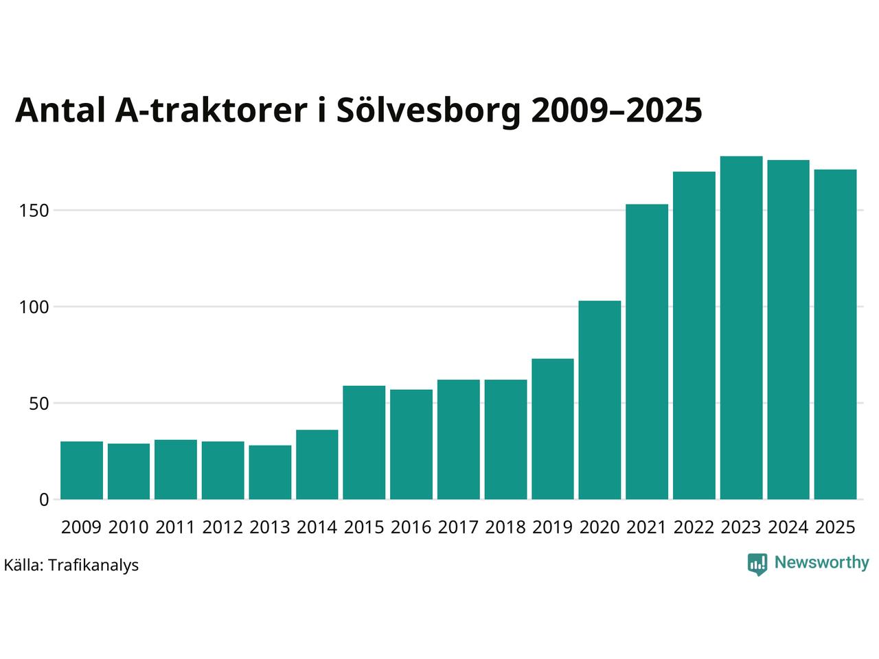 För andra året i rad minskar antalet A-traktorer i Sölvesborgs kommun, visar nya siffror från Trafikanalys. I slutet av 2025 fanns 171 A-traktorer registrerade i Sölvesborgs kommun, vilket är fem mindre än året innan. Det visar nya siffror från Trafikanalys.