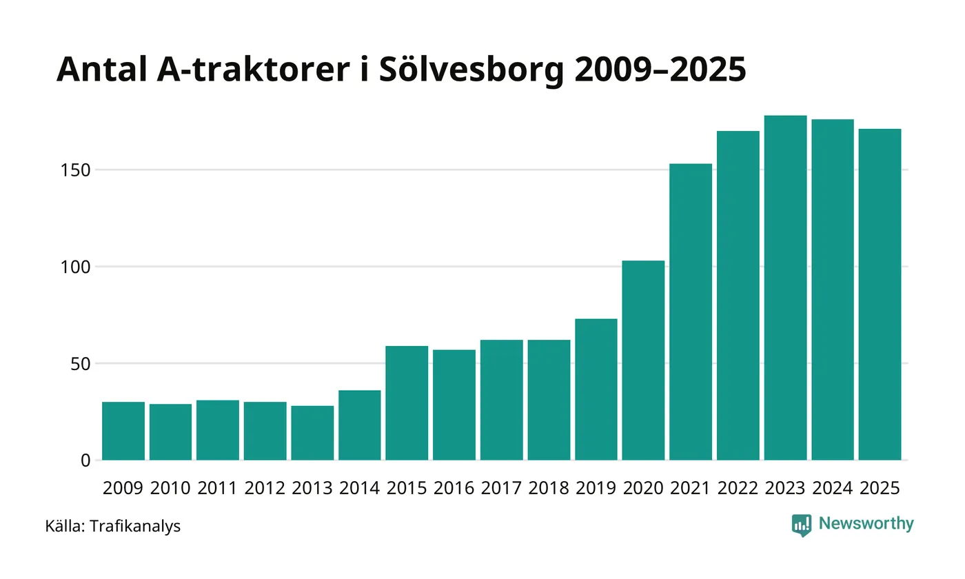 Under det senaste decenniet har antalet A-traktorer femdubblats i Sverige – och under 2025 fortsatte utvecklingen. Men i Sölvesborgs kommun blev de färre under förra året.