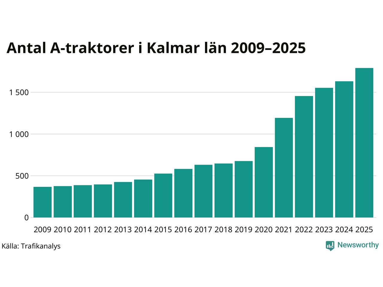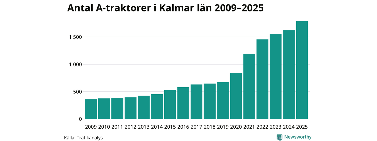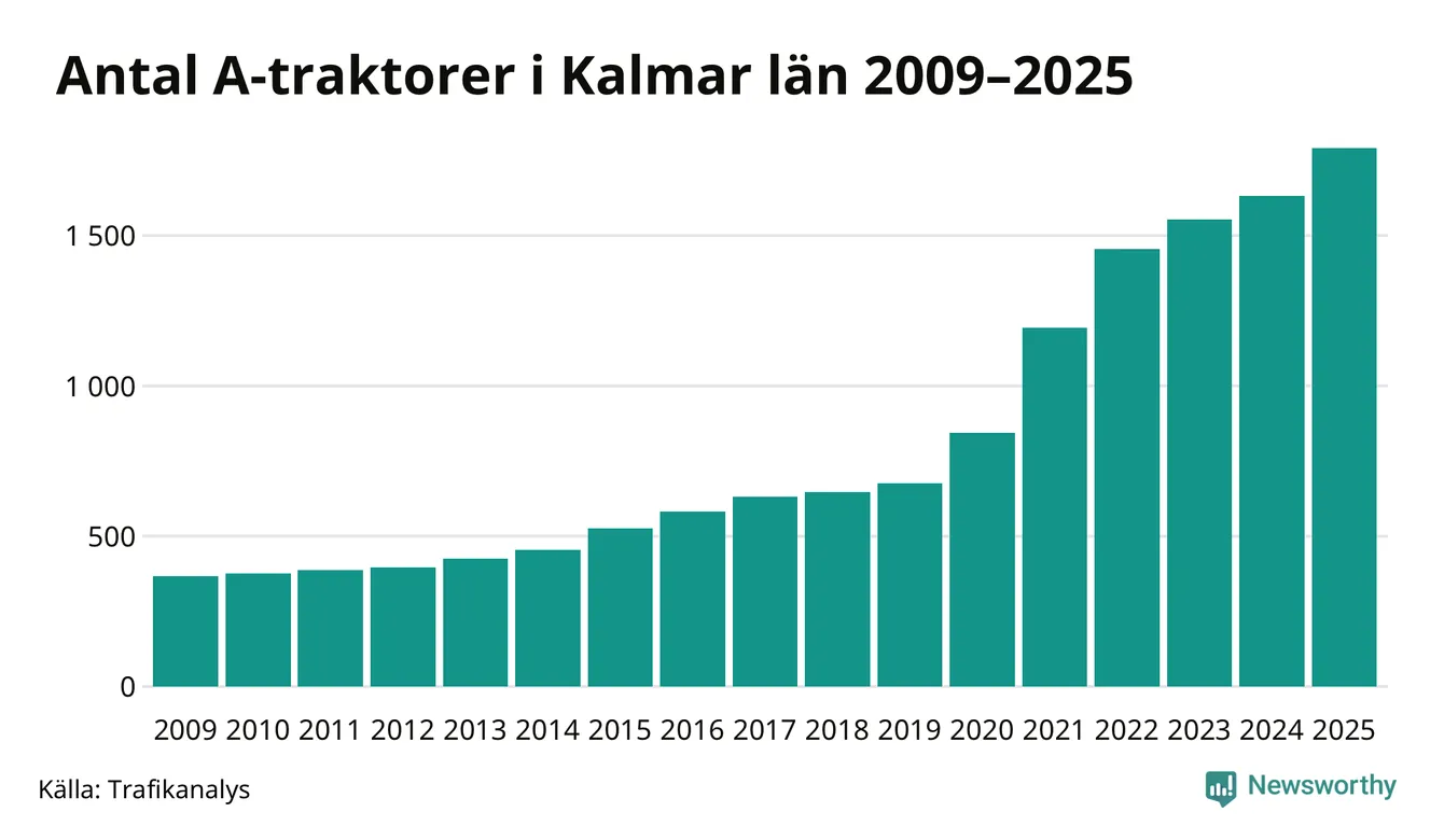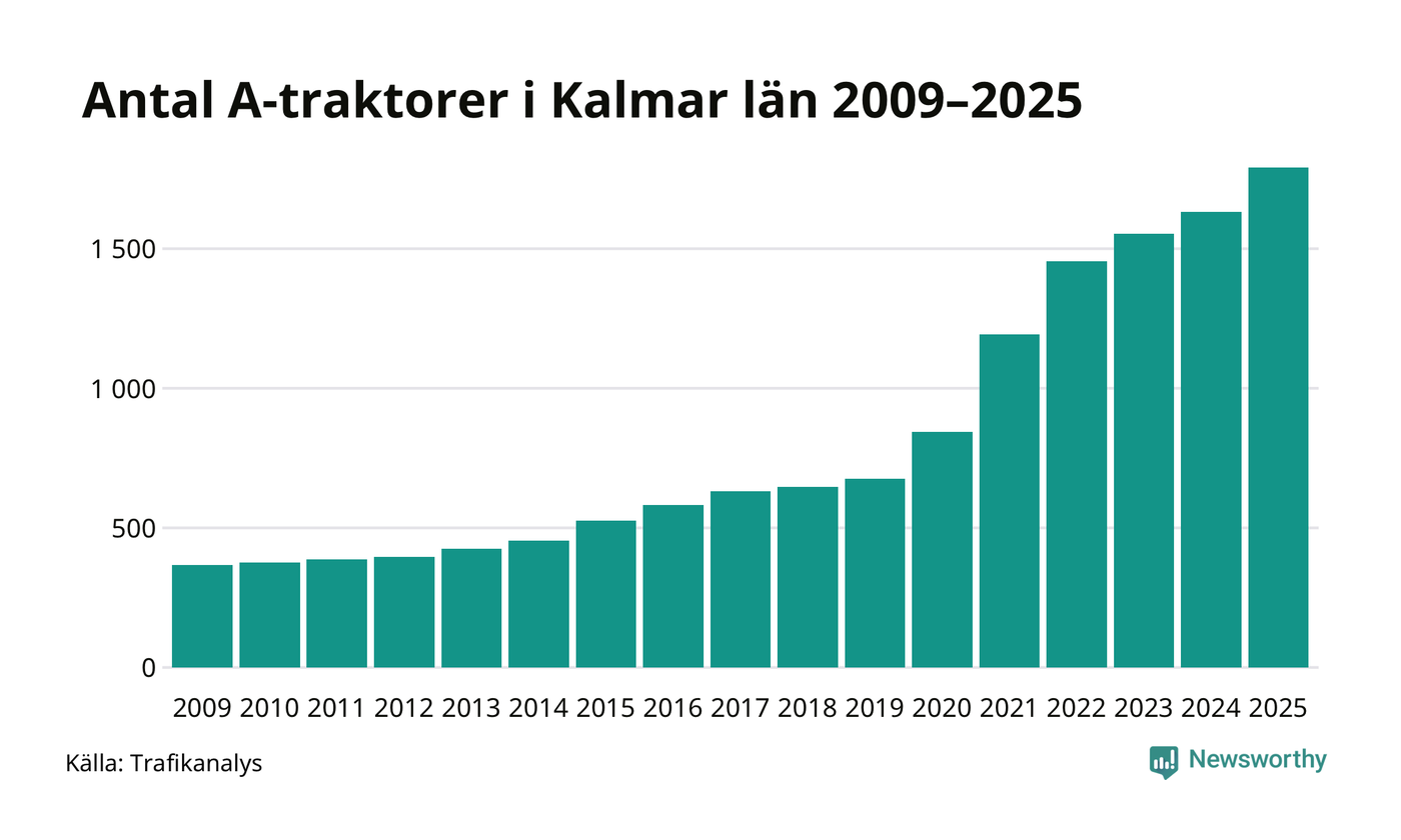 För åtminstone 16:e året i rad ökar antalet A-traktorer i Kalmar län, visar nya siffror från Trafikanalys. I slutet av 2025 fanns 1 791 A-traktorer registrerade i länet, vilket är 159 mer än året innan – en ökning med 10 procent. Inte sedan åtminstone 2009, som är det första året vi har statistik för, har det funnits så många A-traktorer i länet.