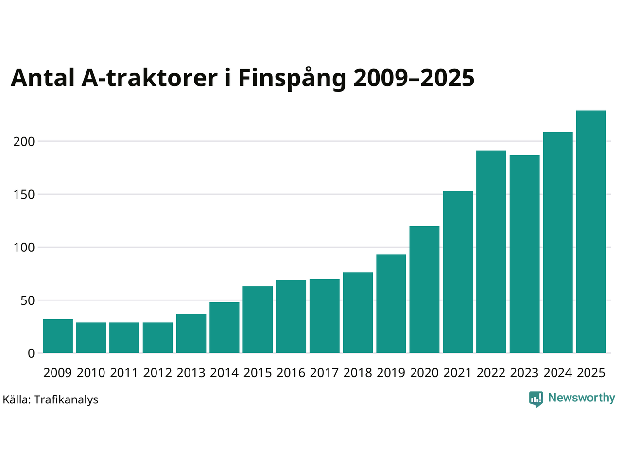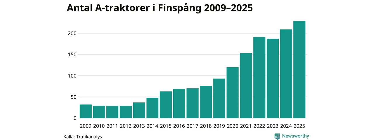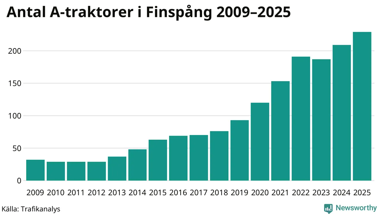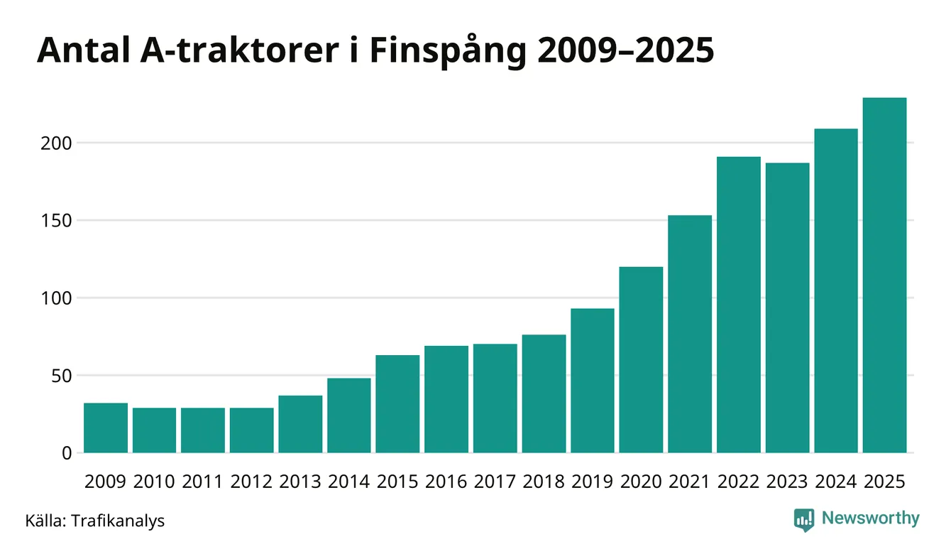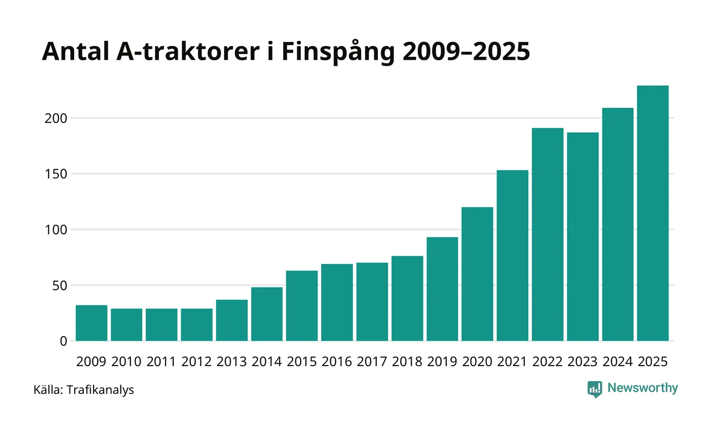 För andra året i rad ökar antalet A-traktorer i Finspångs kommun, visar nya siffror från Trafikanalys. I slutet av 2025 fanns 229 A-traktorer registrerade i kommunen, vilket är 20 mer än året innan – en ökning med 10 procent. Det visar nya siffror från Trafikanalys. Inte sedan åtminstone 2009, som är det första året vi har statistik för, har det funnits så många A-traktorer i kommunen.