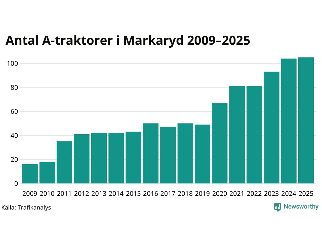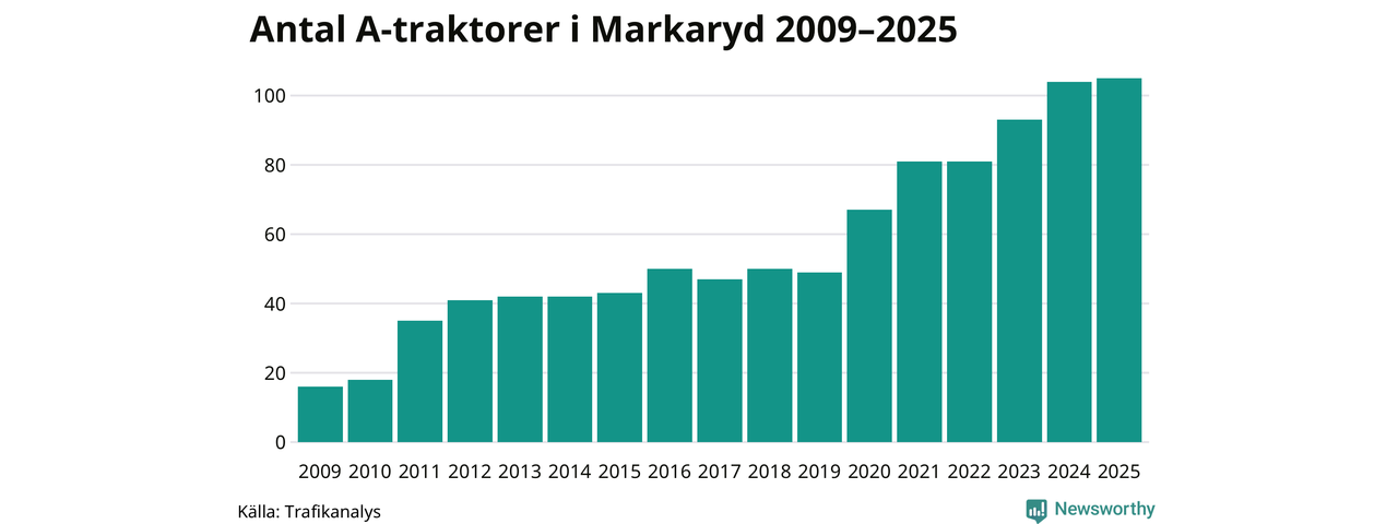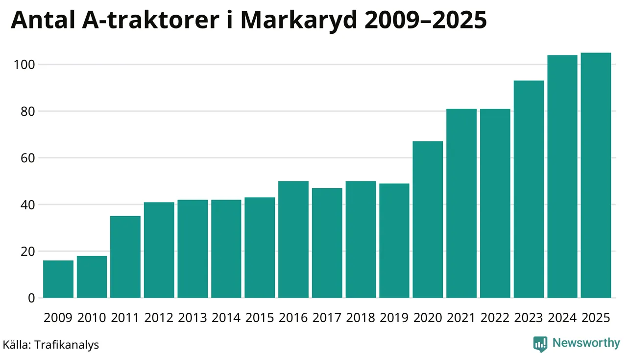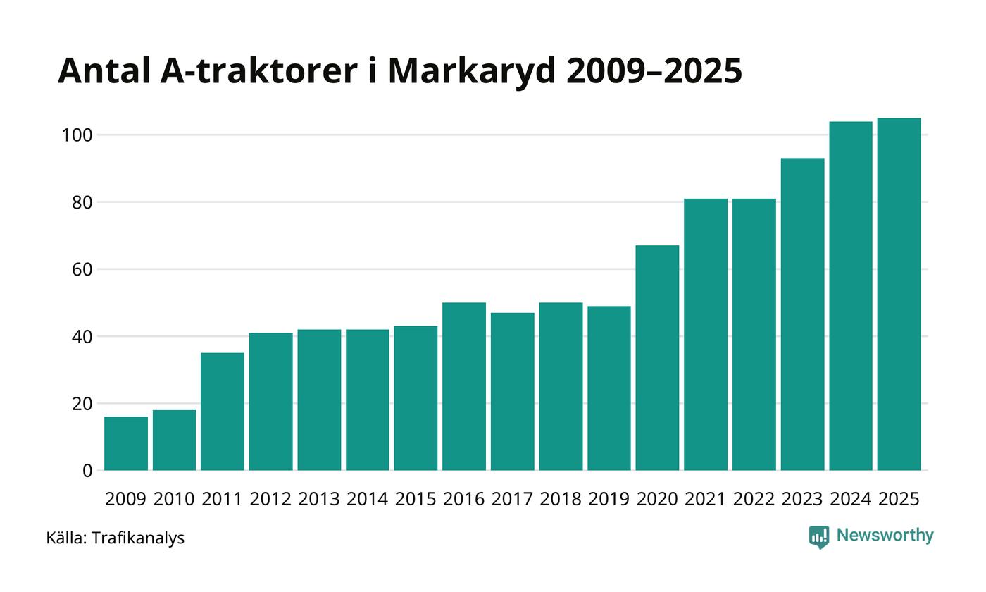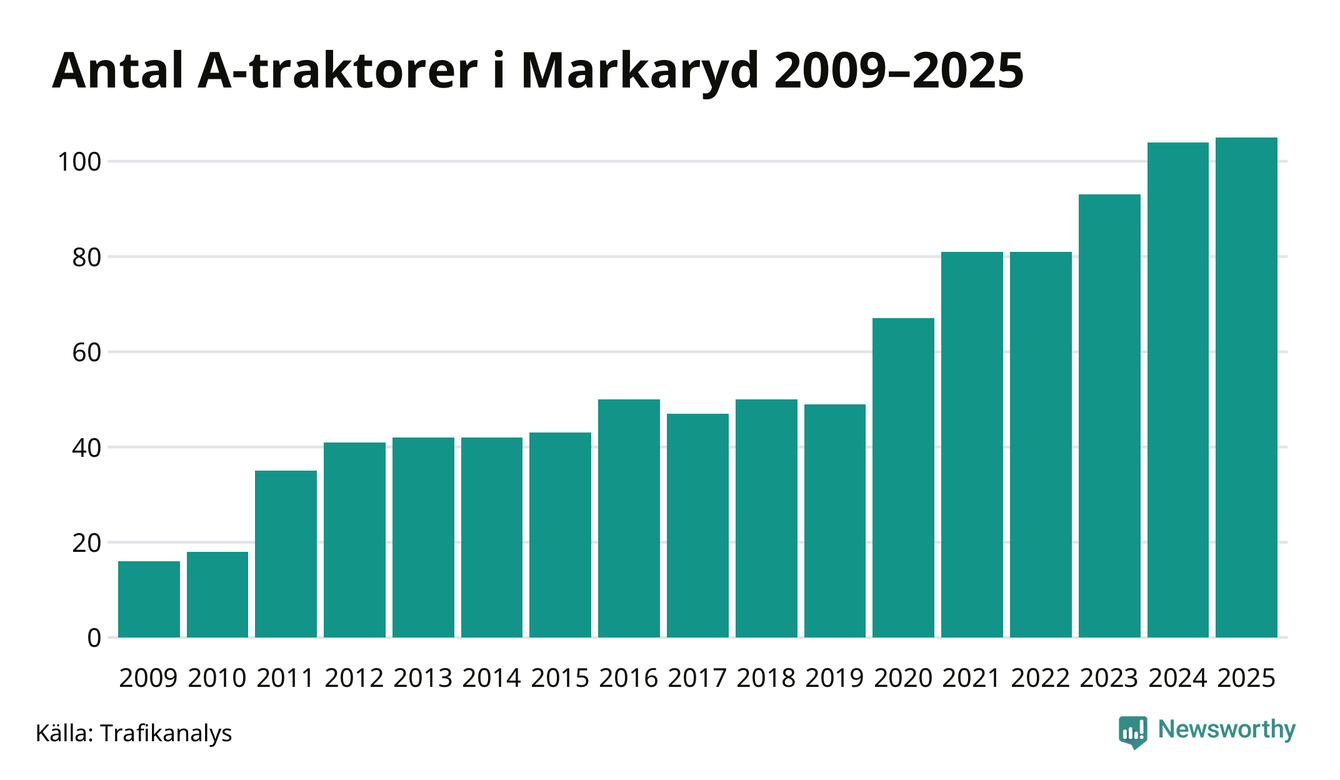 I slutet av 2025 fanns 105 A-traktorer registrerade i kommunen, vilket är en mer än året innan. Det visar nya siffror från Trafikanalys. Inte sedan åtminstone 2009, som är det första året vi har statistik för, har det funnits så många A-traktorer i kommunen.