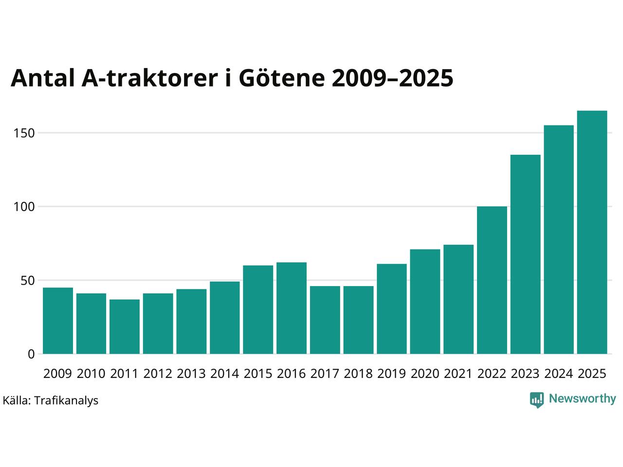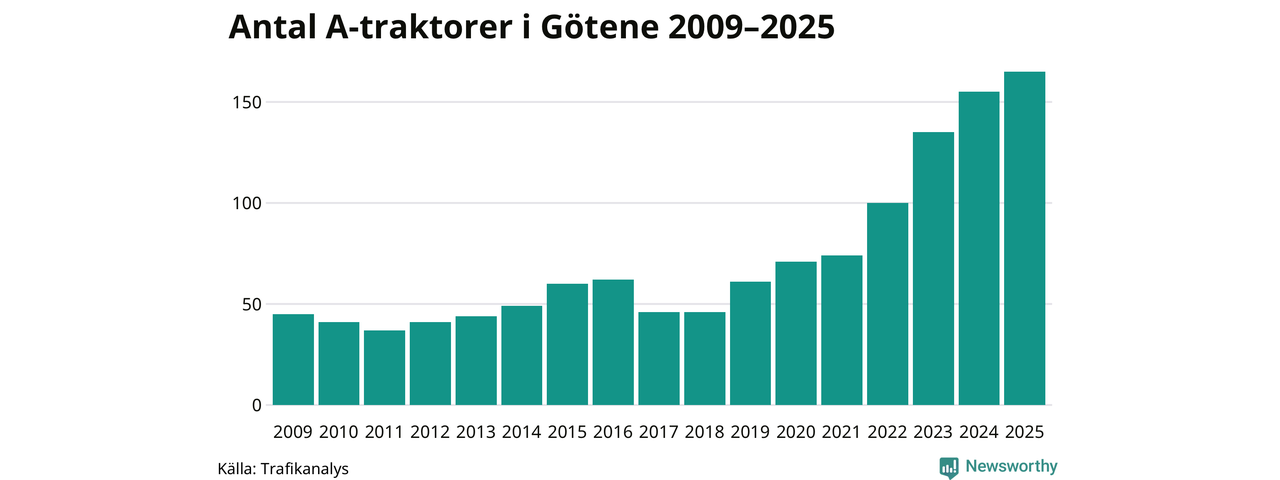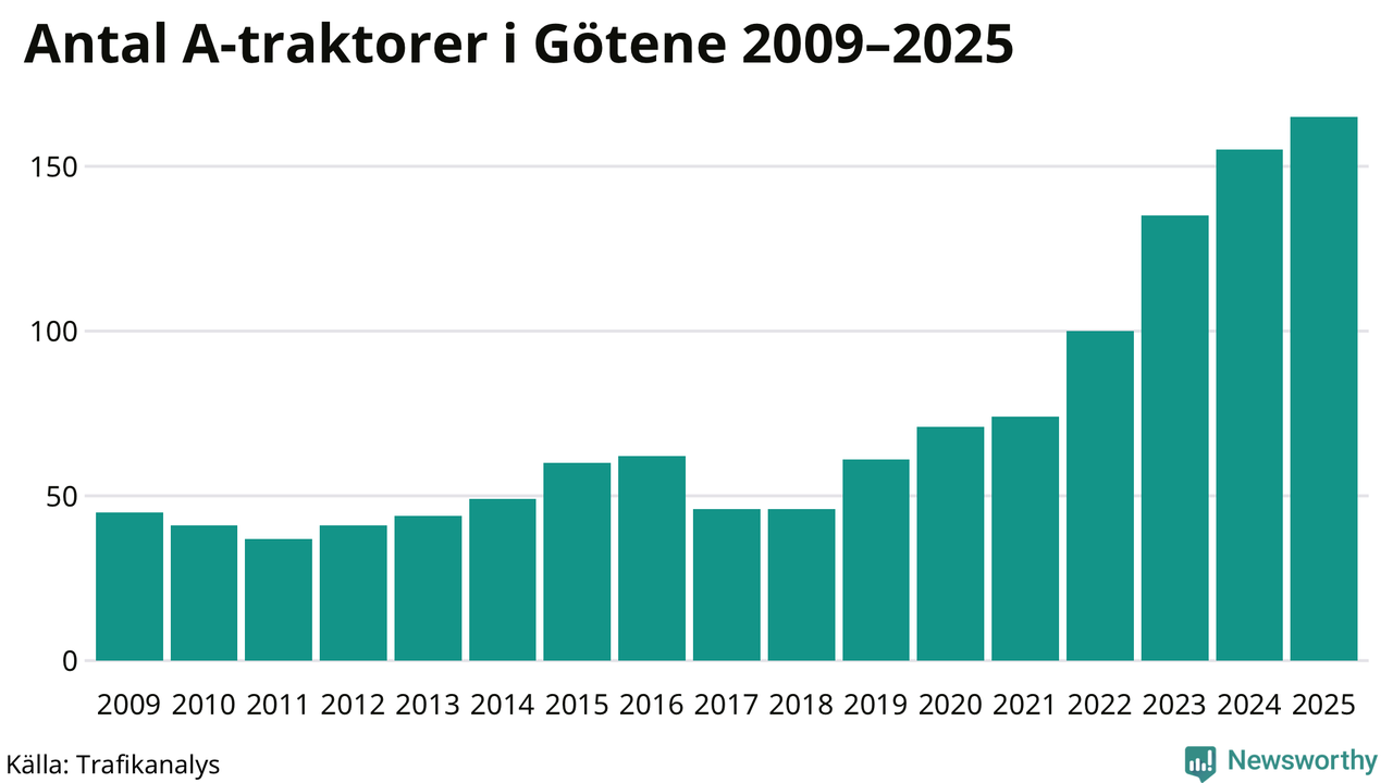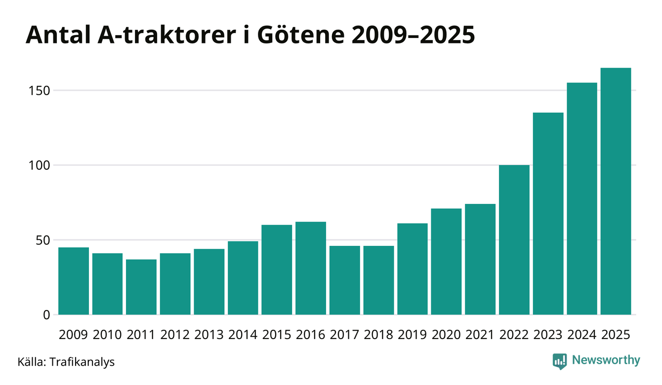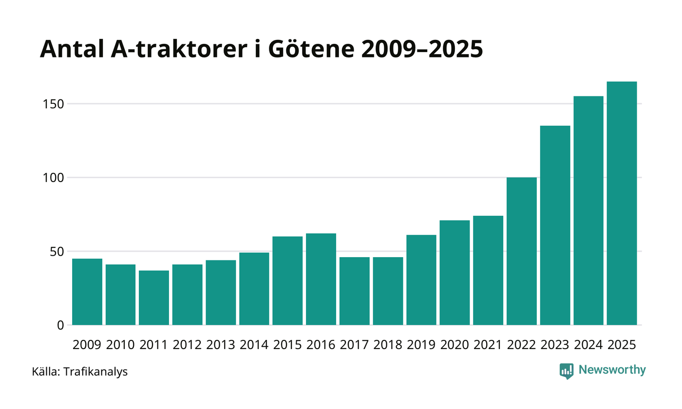 För sjunde året i rad ökar antalet A-traktorer i Götene kommun, visar nya siffror från Trafikanalys. I slutet av 2025 fanns 165 A-traktorer registrerade i kommunen, vilket är tio mer än året innan – en ökning med 6 procent. Inte sedan åtminstone 2009, som är det första året vi har statistik för, har det funnits så många A-traktorer i kommunen.