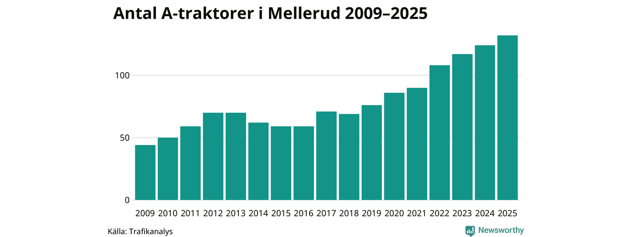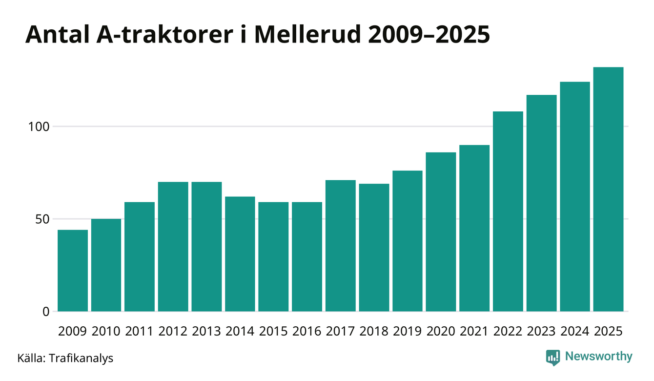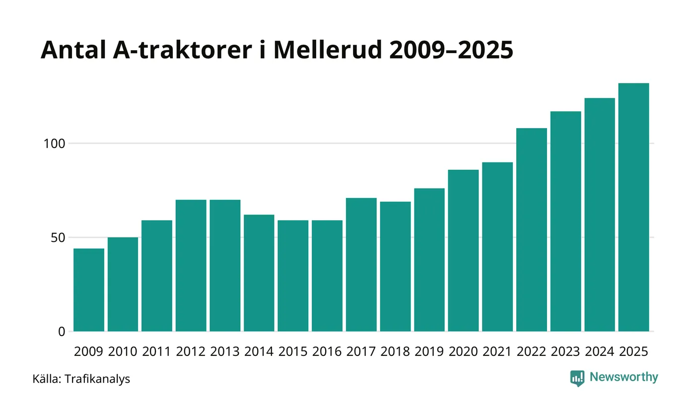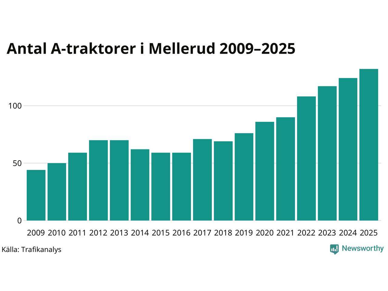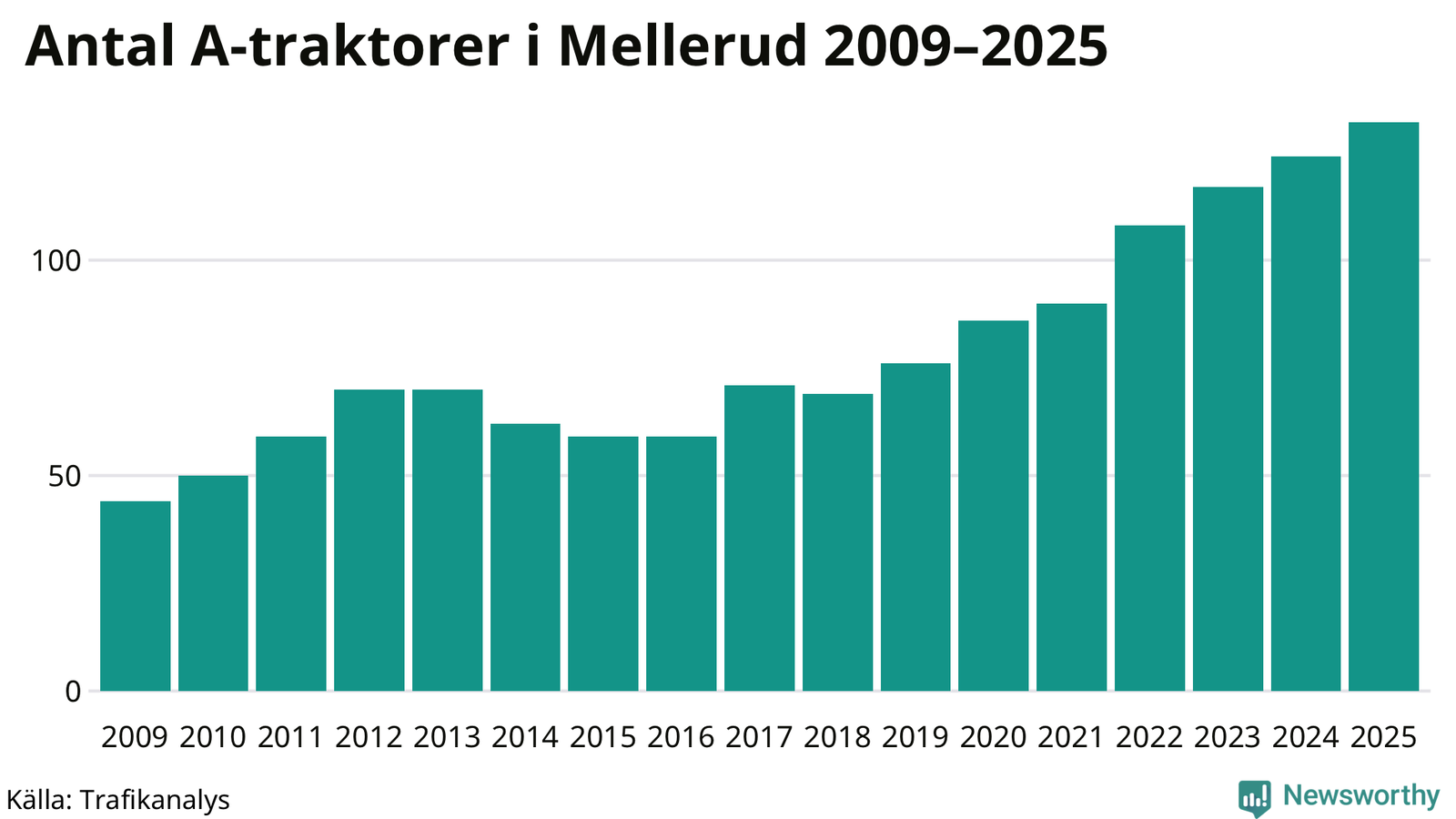 För sjunde året i rad ökar antalet A-traktorer i Melleruds kommun, visar nya siffror från Trafikanalys. I slutet av 2025 fanns 132 A-traktorer registrerade i kommunen, vilket är åtta mer än året innan – en ökning med 6 procent. Inte sedan åtminstone 2009, som är det första året vi har statistik för, har det funnits så många A-traktorer i kommunen.