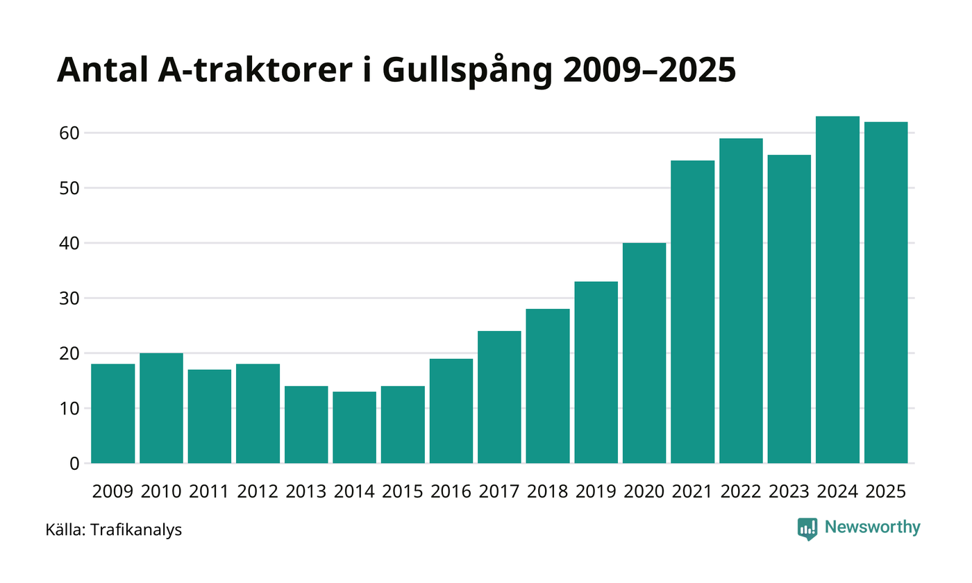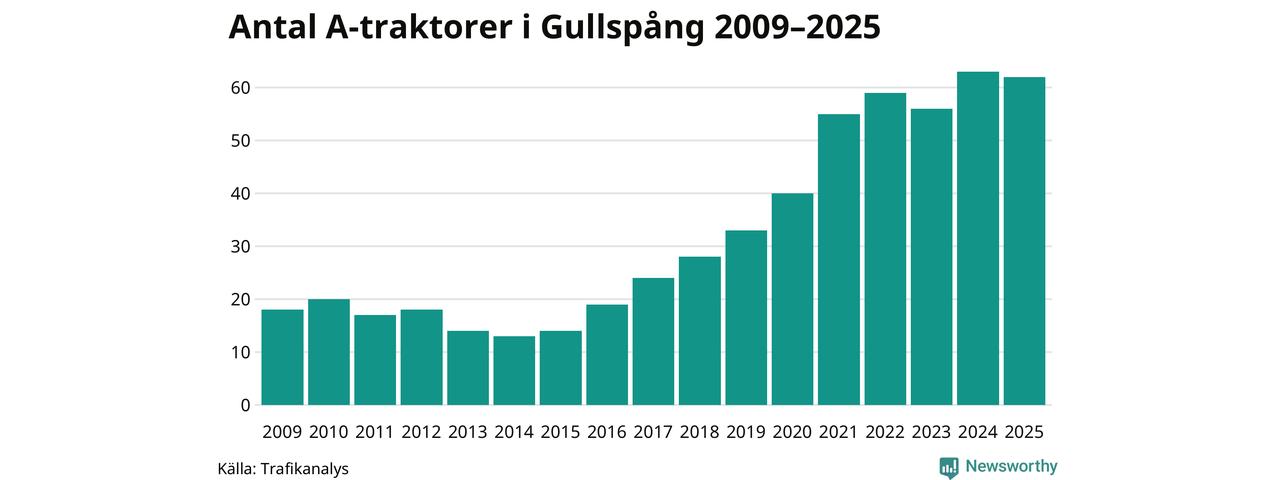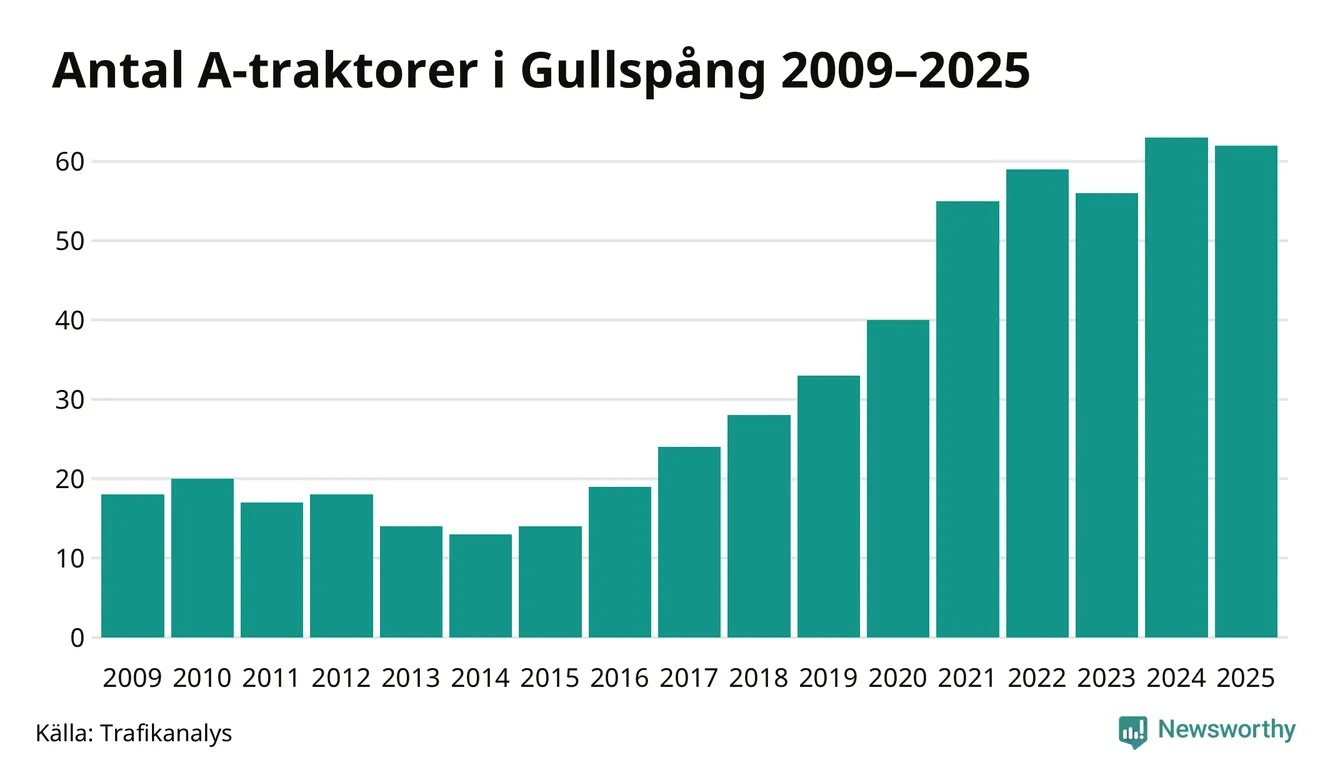 Under det senaste decenniet har antalet A-traktorer femdubblats i Sverige – och under 2025 fortsatte utvecklingen. Nu släpps nya siffror som visar hur många som finns i Gullspångs kommun.