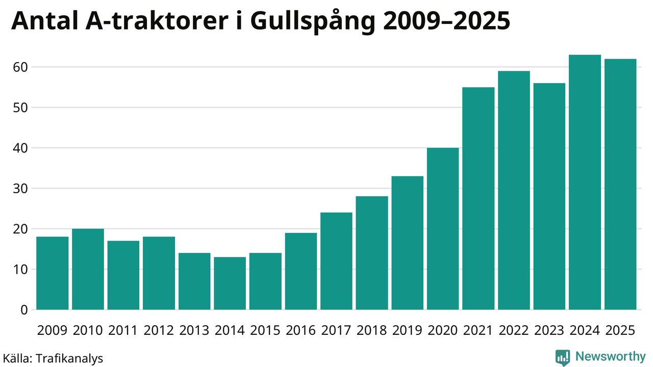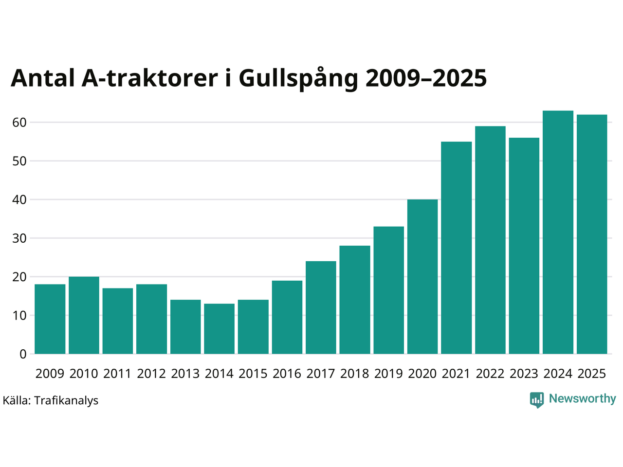 I slutet av 2025 fanns 62 A-traktorer registrerade i Gullspångs kommun, vilket är en mindre än året innan. Det visar nya siffror från Trafikanalys.