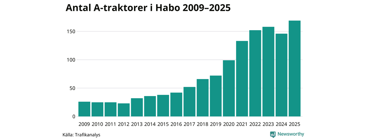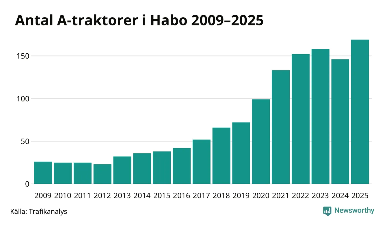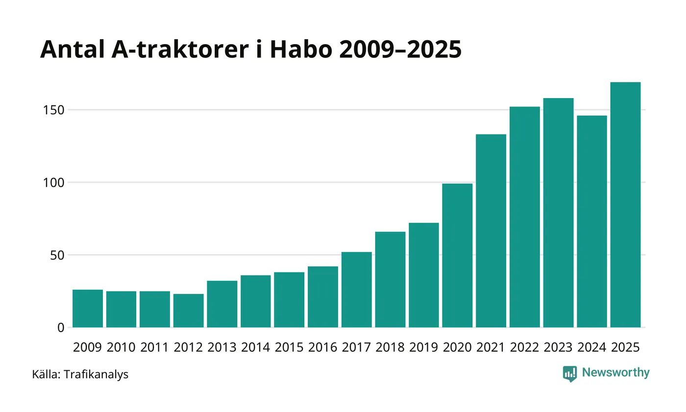 I slutet av 2025 fanns 169 A-traktorer registrerade i kommunen, vilket är 23 mer än året innan – en ökning med 16 procent. Det visar nya siffror från Trafikanalys. Inte sedan åtminstone 2009, som är det första året vi har statistik för, har det funnits så många A-traktorer i kommunen.