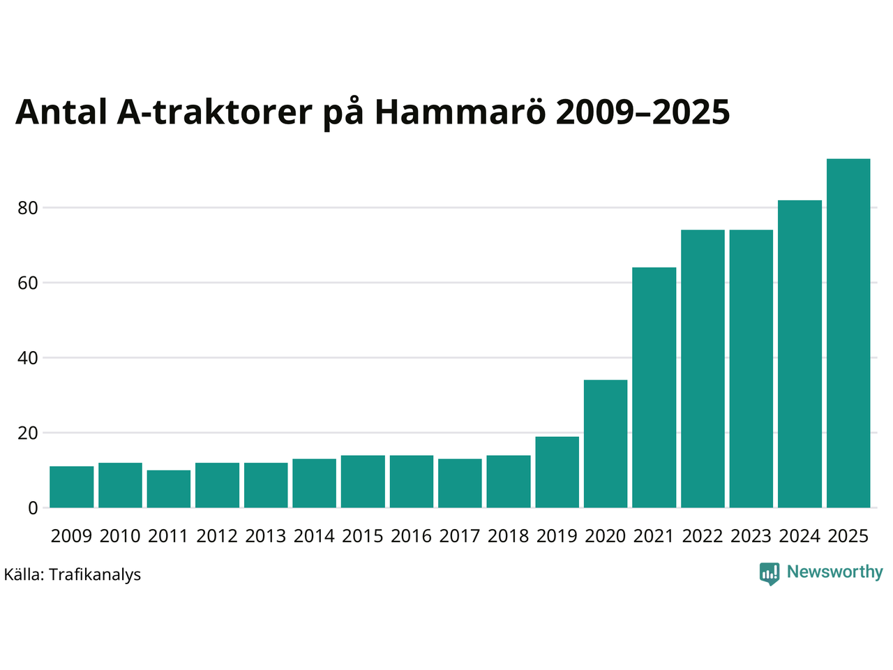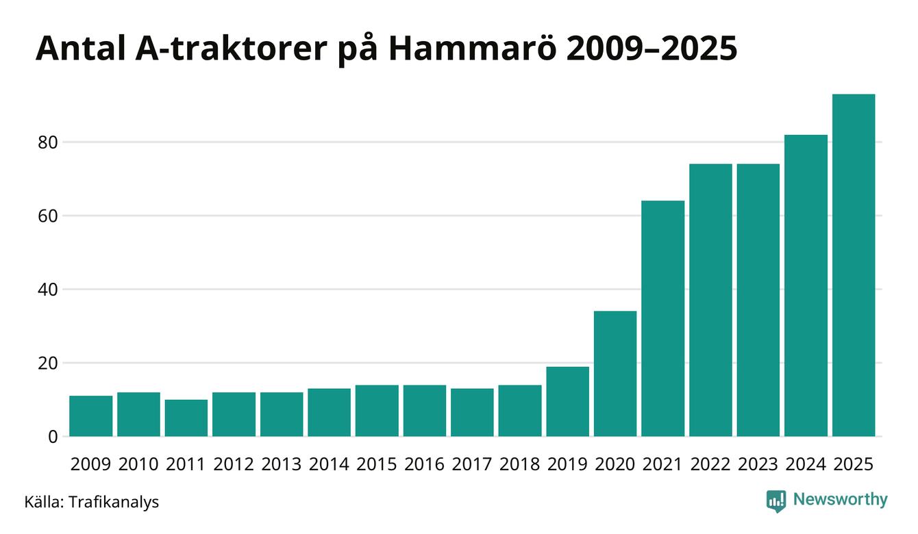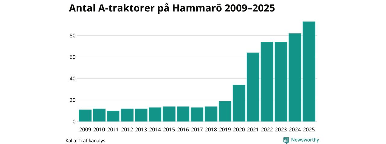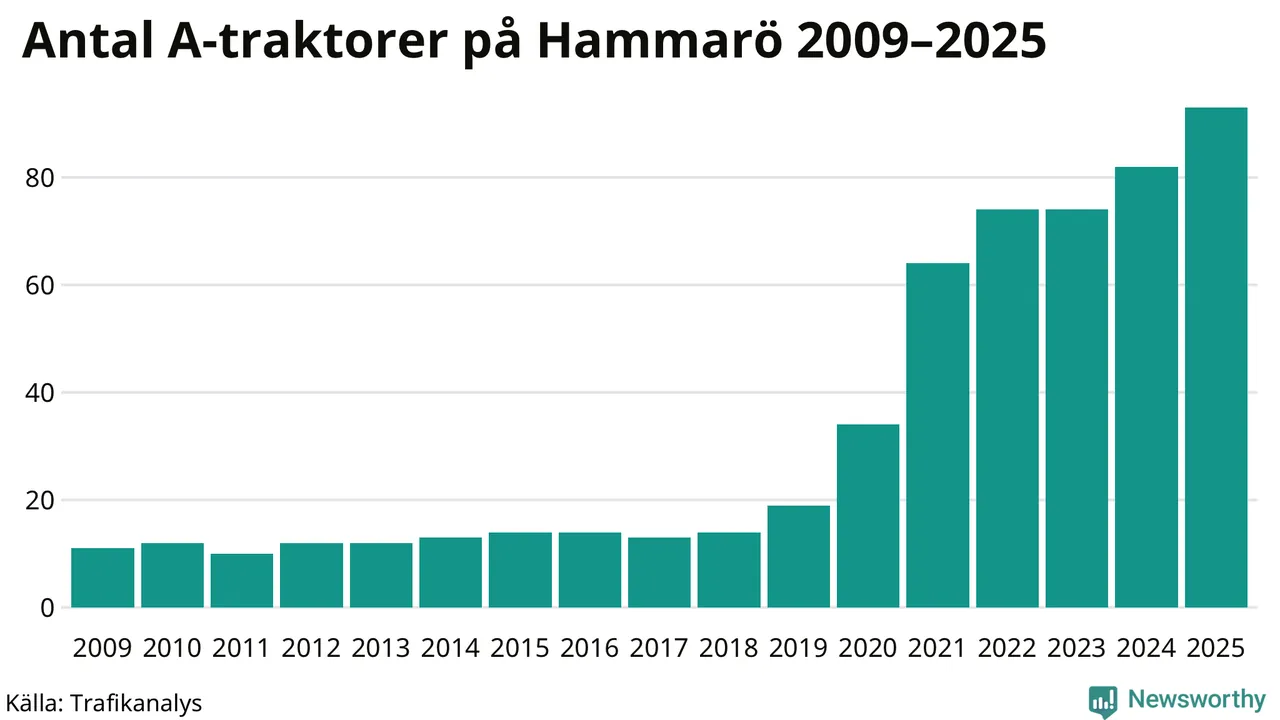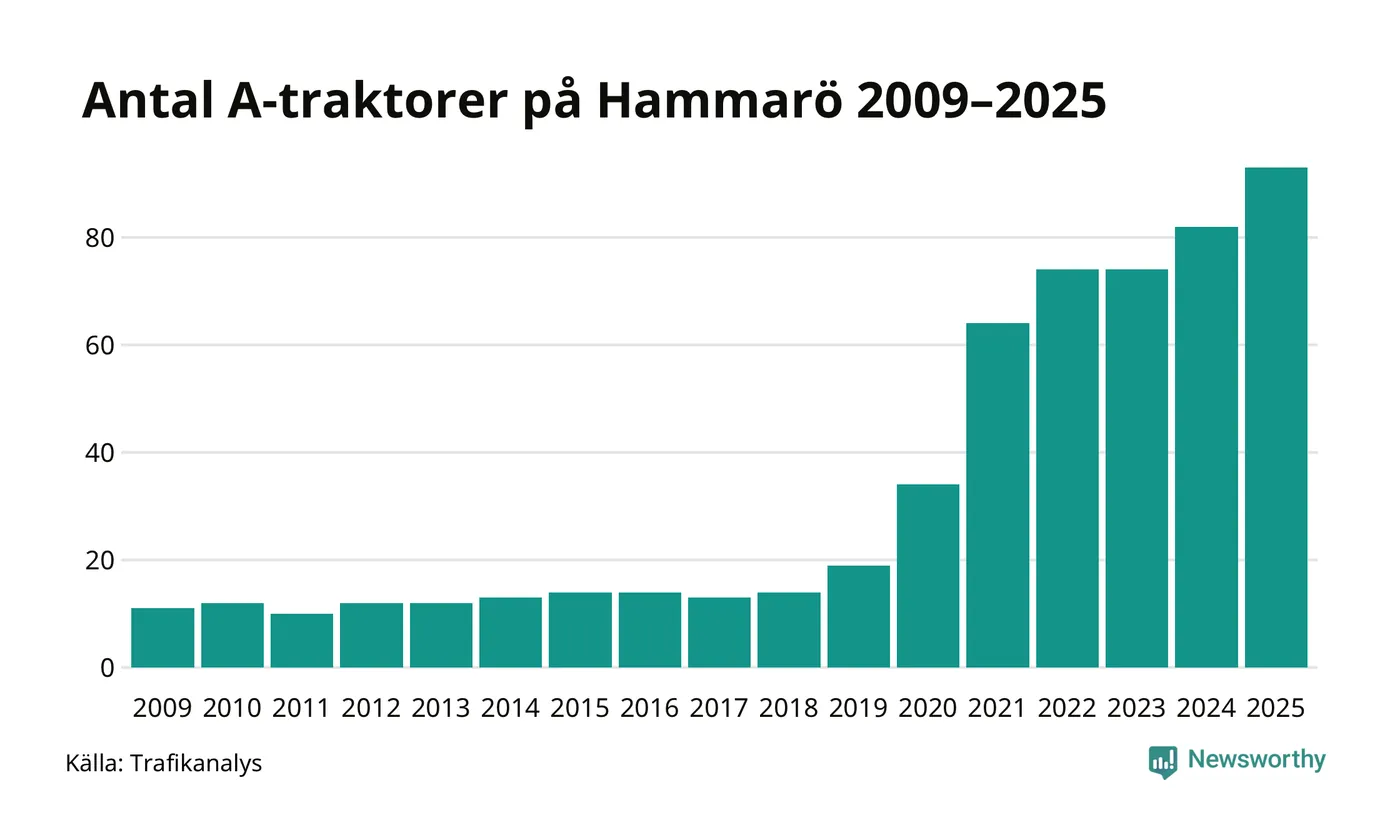 För andra året i rad ökar antalet A-traktorer i Hammarö kommun, visar nya siffror från Trafikanalys. I slutet av 2025 fanns 93 A-traktorer registrerade i kommunen, vilket är elva mer än året innan – en ökning med 13 procent. Det visar nya siffror från Trafikanalys. Det är den näst största ökningen i Värmlands län. Inte sedan åtminstone 2009, som är det första året vi har statistik för, har det funnits så många A-traktorer i kommunen.