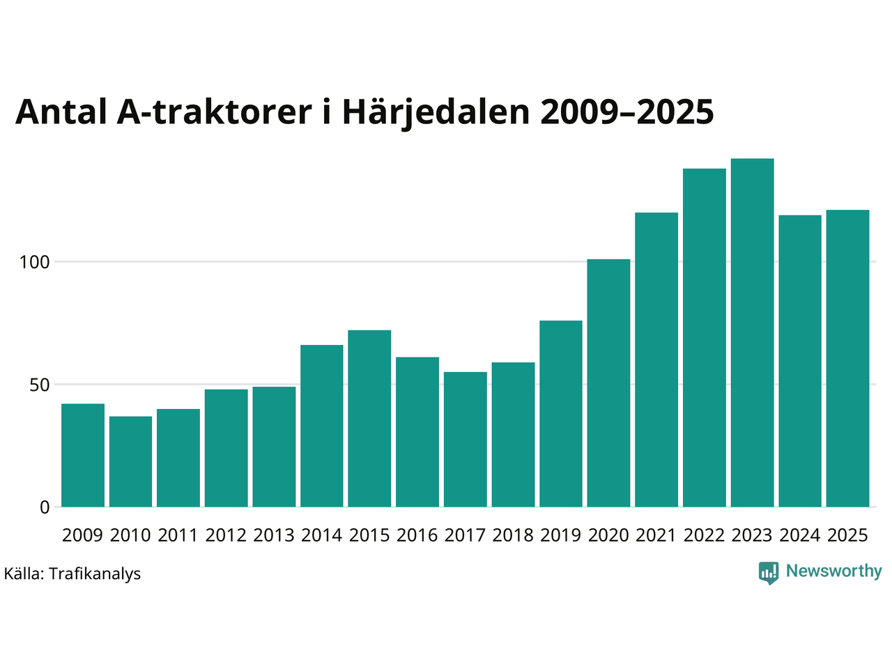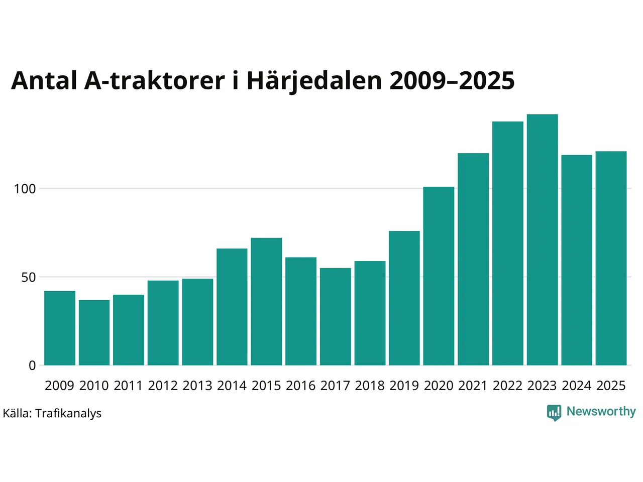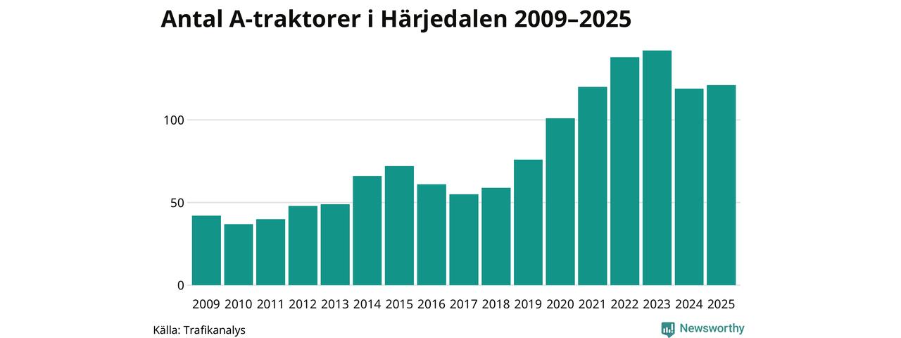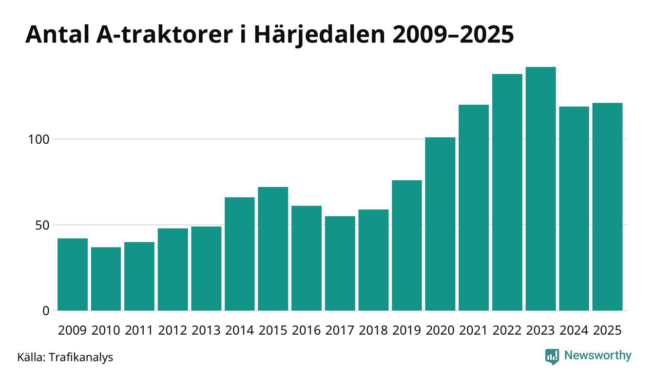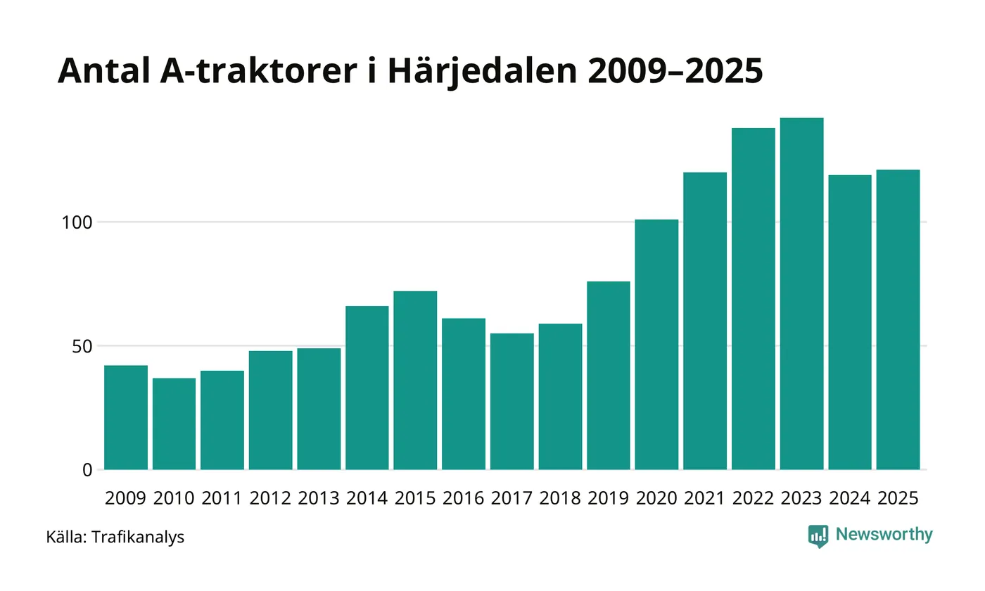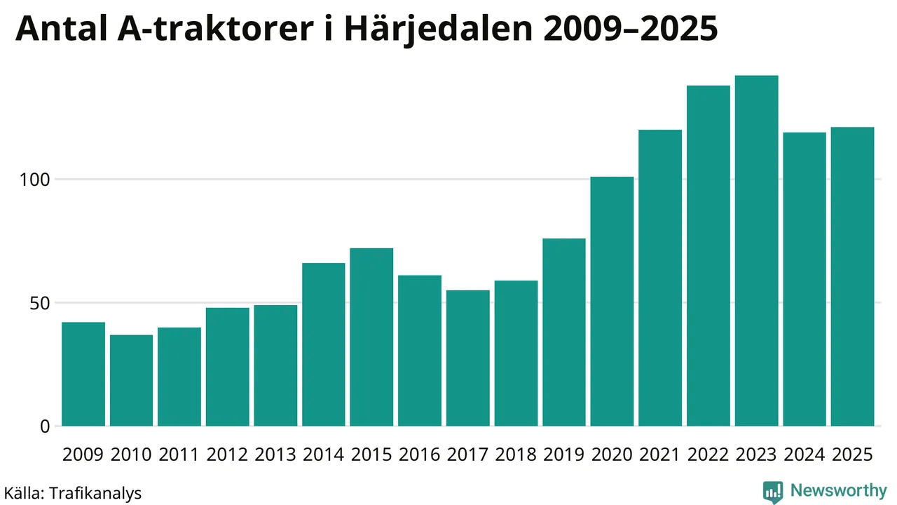I slutet av 2025 fanns 121 A-traktorer registrerade i Härjedalens kommun, vilket är två mer än året innan. Det visar nya siffror från Trafikanalys.