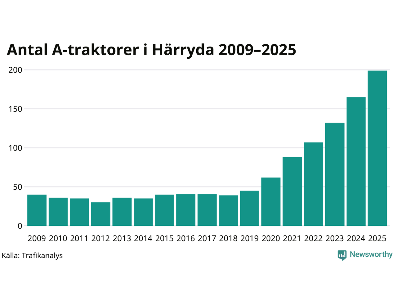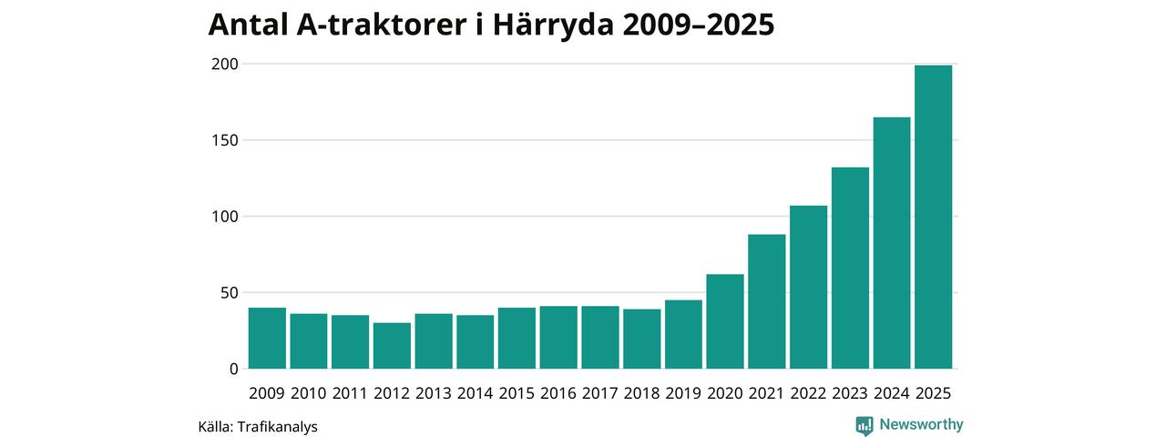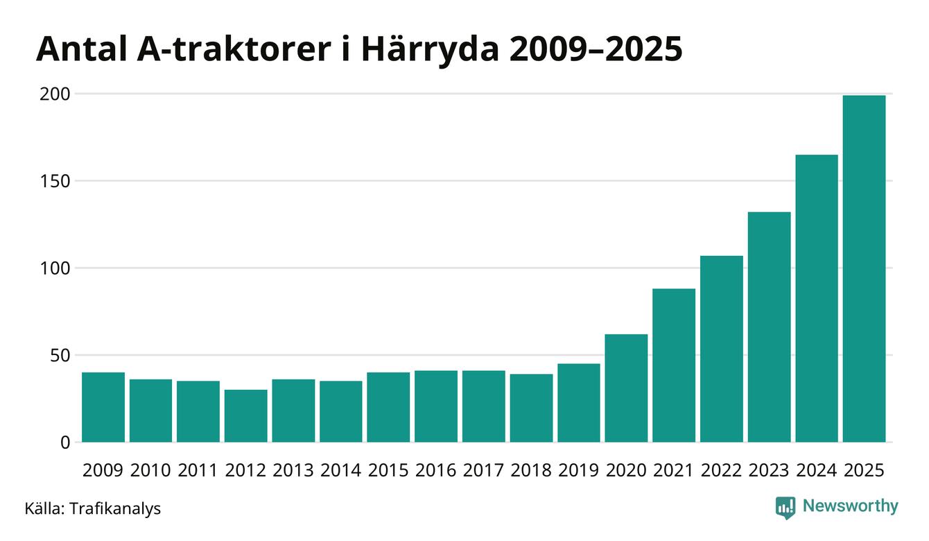 För sjunde året i rad ökar antalet A-traktorer i Härryda kommun, visar nya siffror från Trafikanalys. I slutet av 2025 fanns 199 A-traktorer registrerade i kommunen, vilket är 34 mer än året innan – en ökning med 21 procent. Ökningen är den största från ett år till ett annat någonsin i Härryda kommun i absoluta tal.