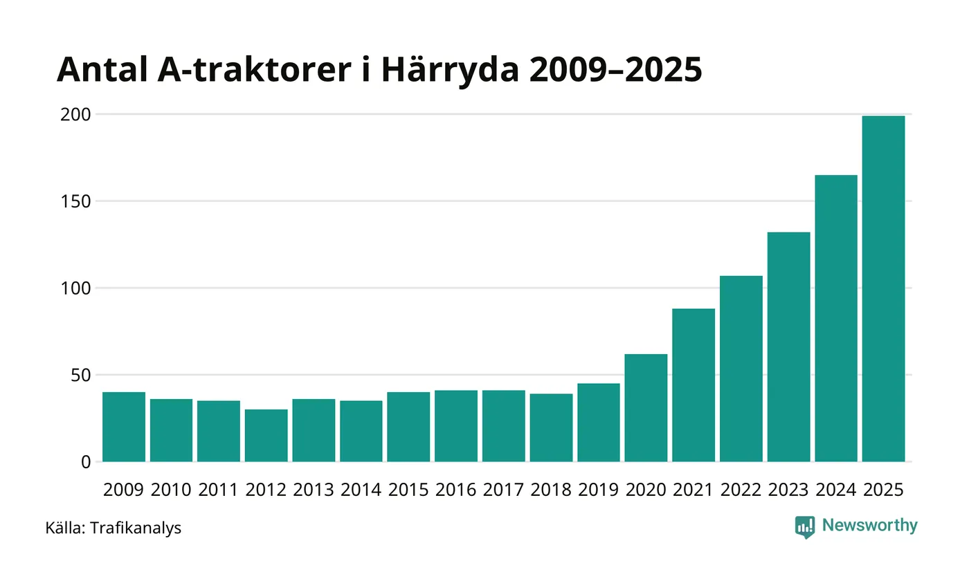 Under det senaste decenniet har antalet A-traktorer femdubblats i Sverige – och under 2025 fortsatte utvecklingen. Ökningen i Härryda kommun är den största hittills.
