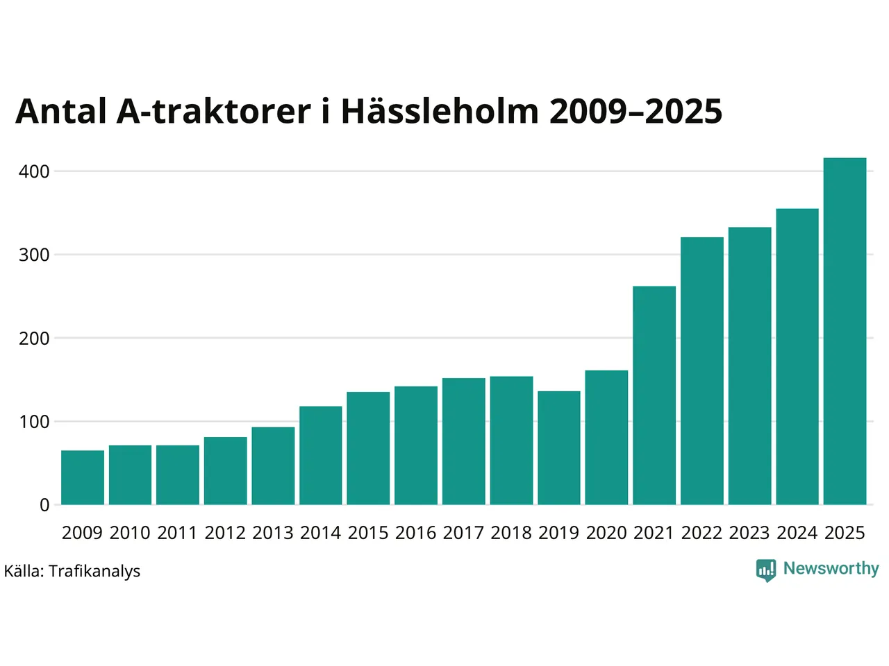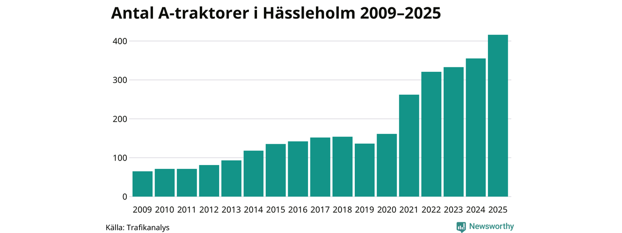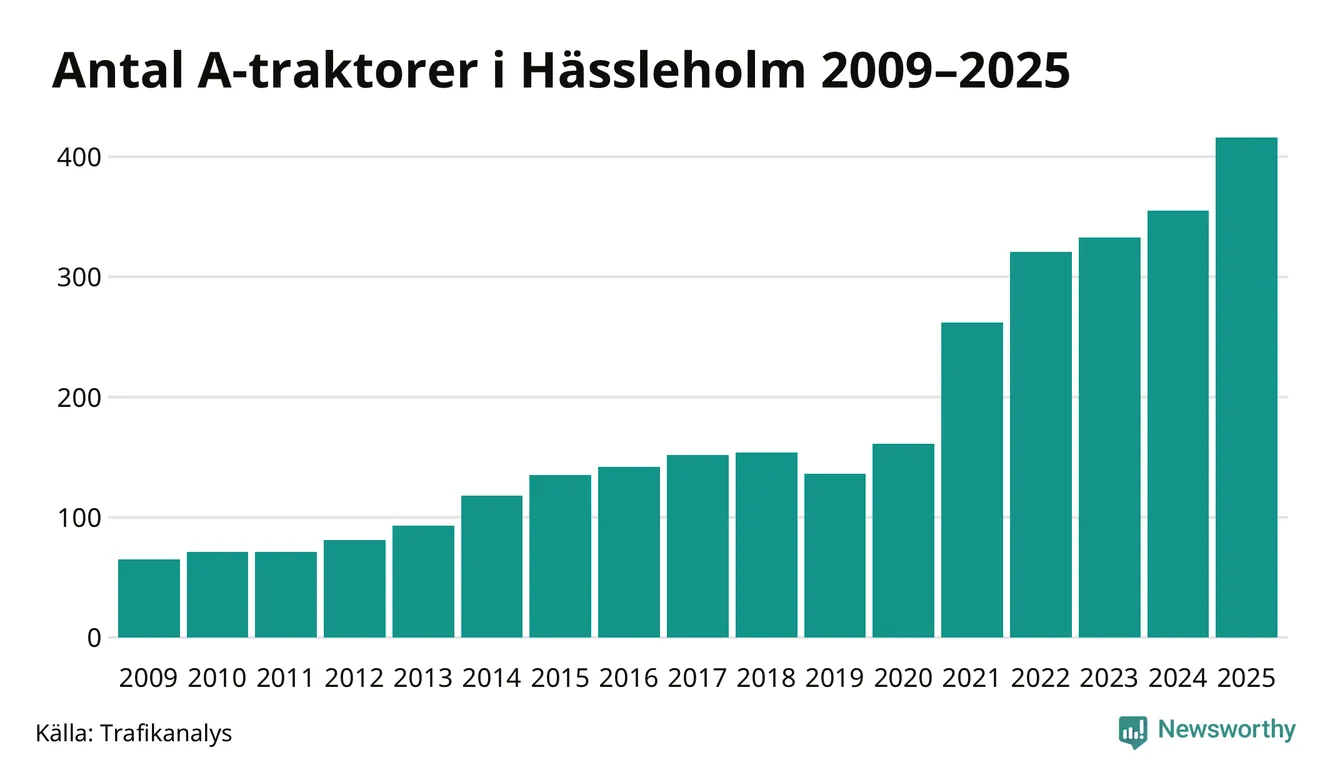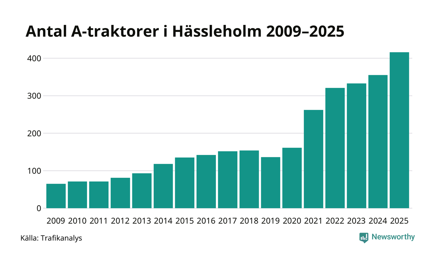För sjätte året i rad ökar antalet A-traktorer i Hässleholms kommun, visar nya siffror från Trafikanalys. I slutet av 2025 fanns 416 A-traktorer registrerade i kommunen, vilket är 61 mer än året innan – en ökning med 17 procent. Inte sedan åtminstone 2009, som är det första året vi har statistik för, har det funnits så många A-traktorer i kommunen.