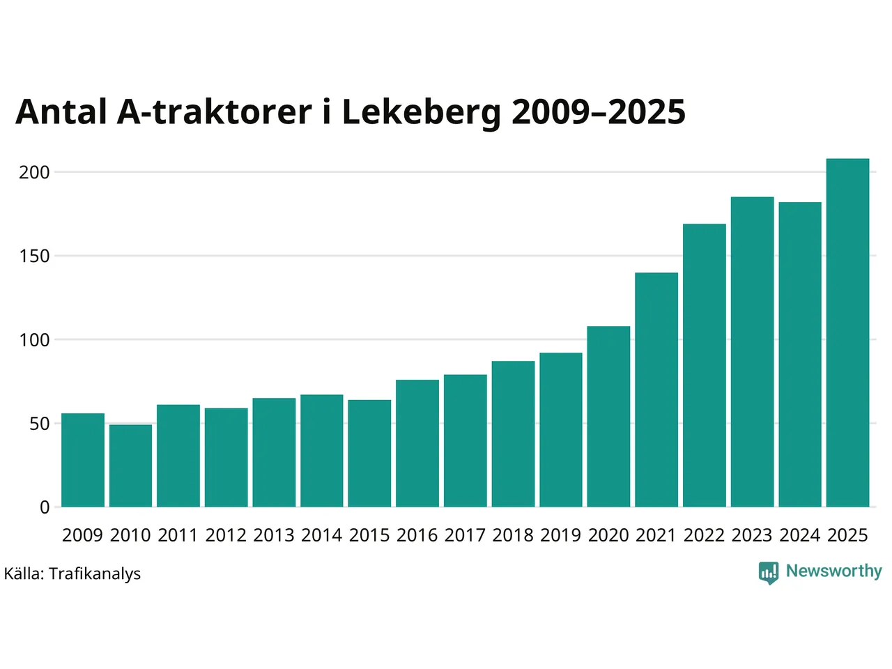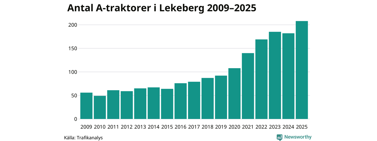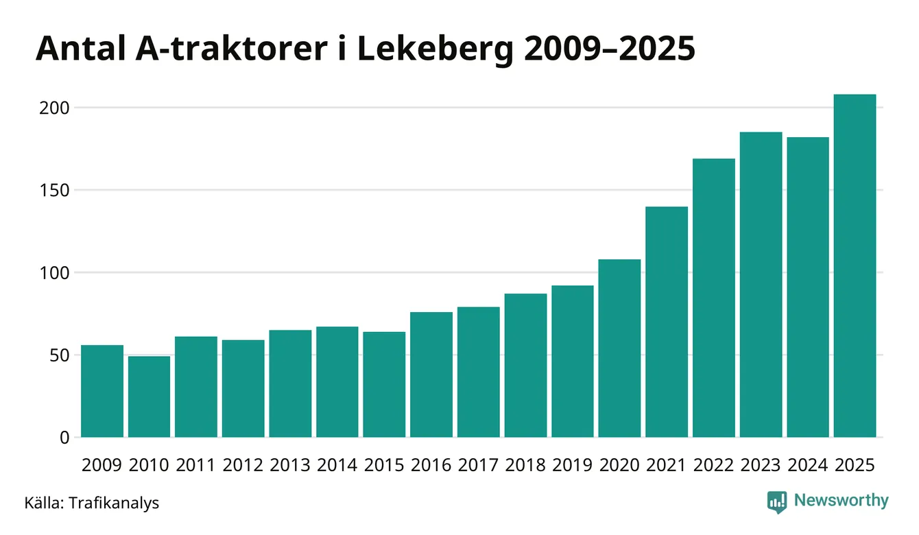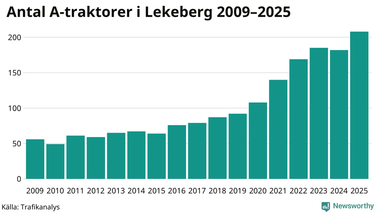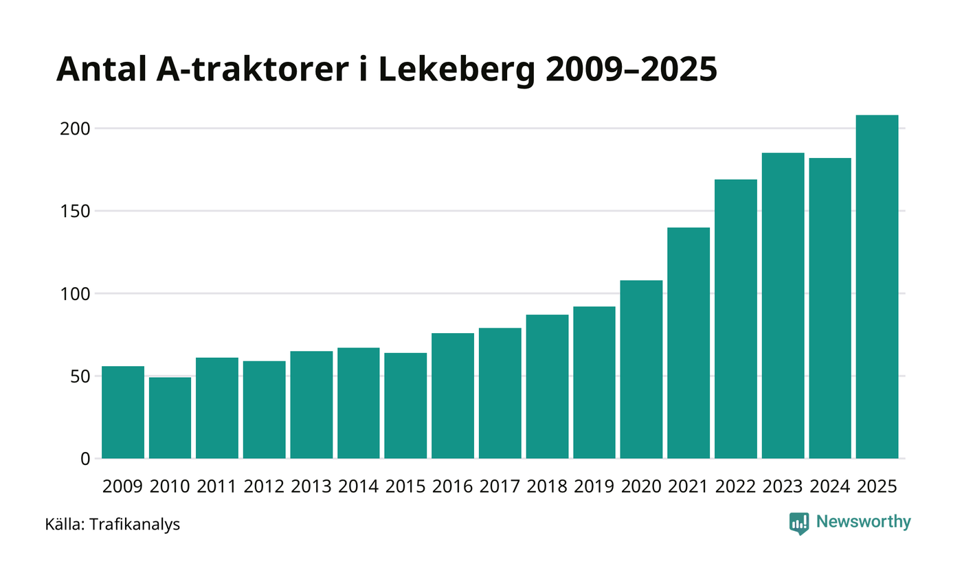 I slutet av 2025 fanns 208 A-traktorer registrerade i kommunen, vilket är 26 mer än året innan – en ökning med 14 procent. Det visar nya siffror från Trafikanalys. Inte sedan åtminstone 2009, som är det första året vi har statistik för, har det funnits så många A-traktorer i kommunen.