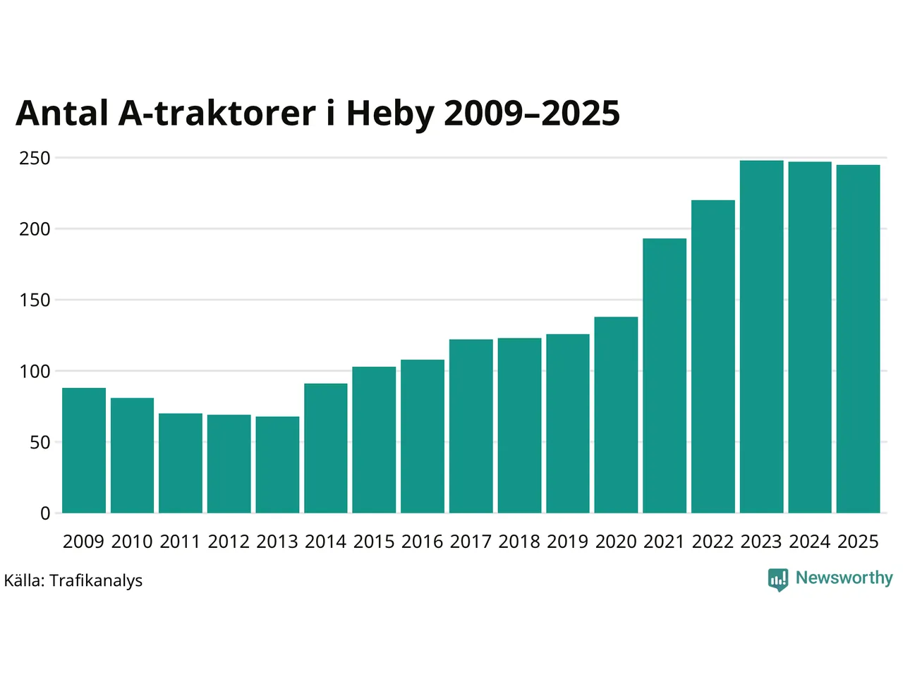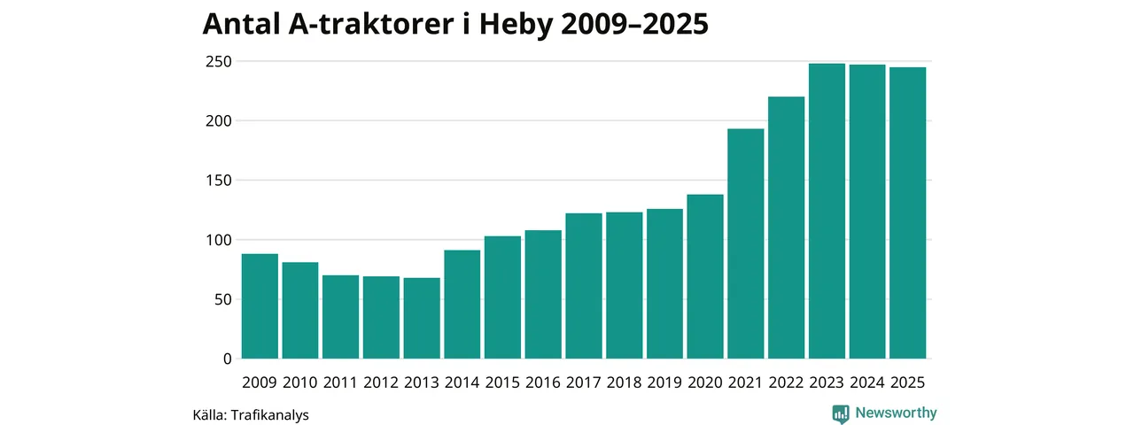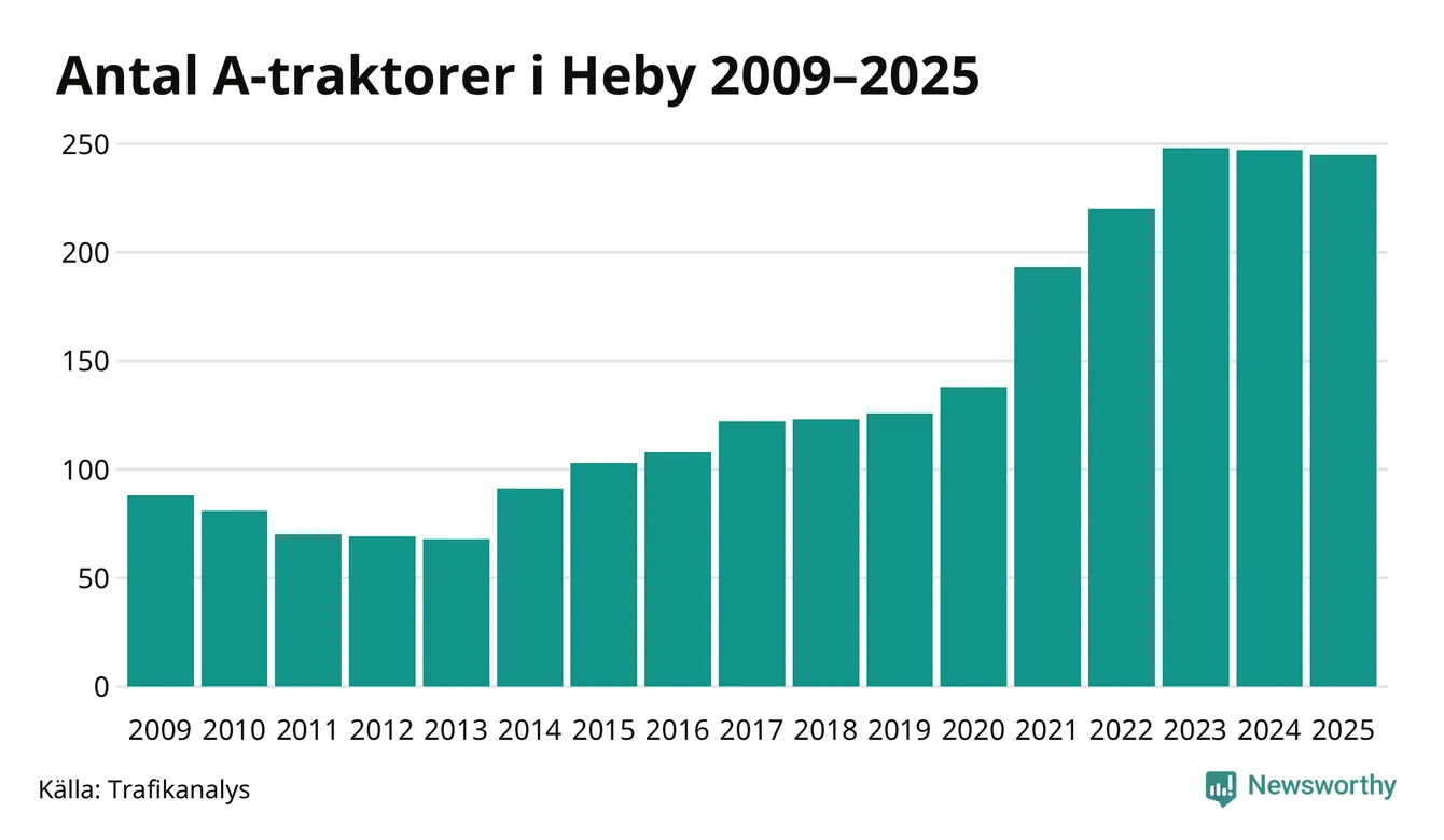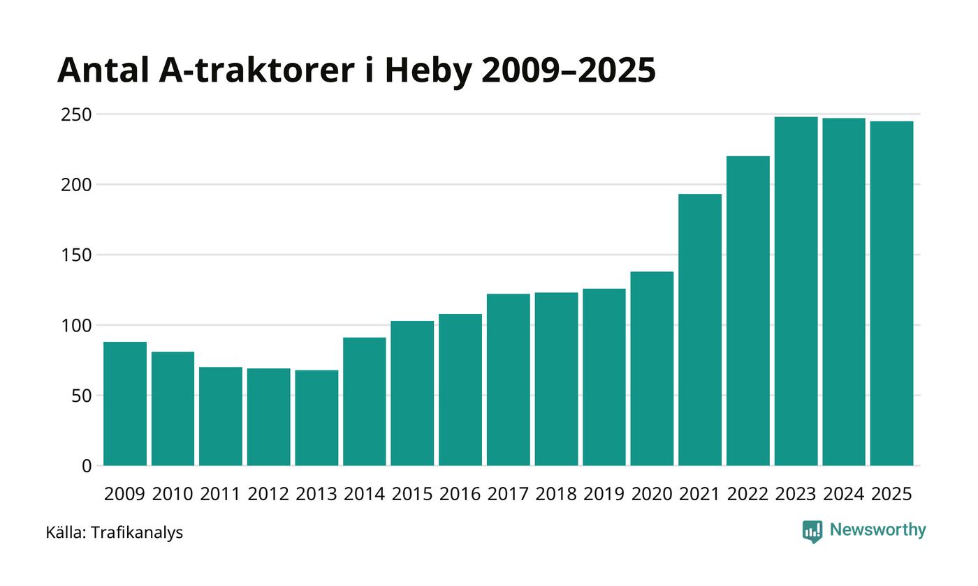 För andra året i rad minskar antalet A-traktorer i Heby kommun, visar nya siffror från Trafikanalys. I slutet av 2025 fanns 245 A-traktorer registrerade i Heby kommun, vilket är två mindre än året innan. Det visar nya siffror från Trafikanalys.