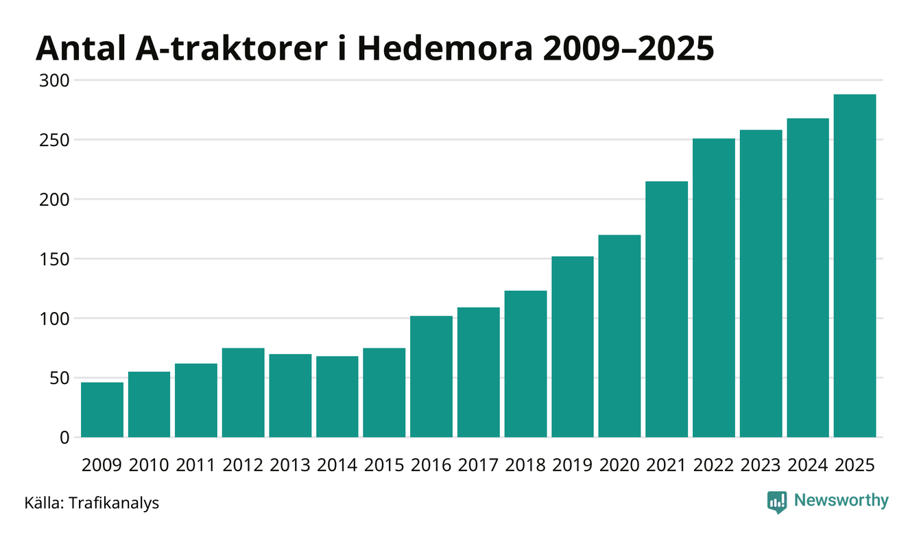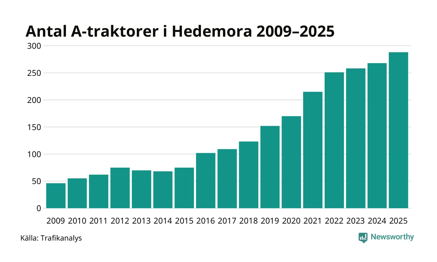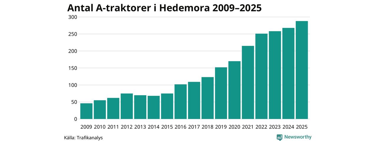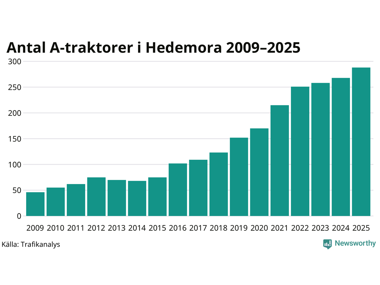 För elfte året i rad ökar antalet A-traktorer i Hedemora kommun, visar nya siffror från Trafikanalys. I slutet av 2025 fanns 288 A-traktorer registrerade i kommunen, vilket är 20 mer än året innan – en ökning med 7 procent. Inte sedan åtminstone 2009, som är det första året vi har statistik för, har det funnits så många A-traktorer i kommunen.