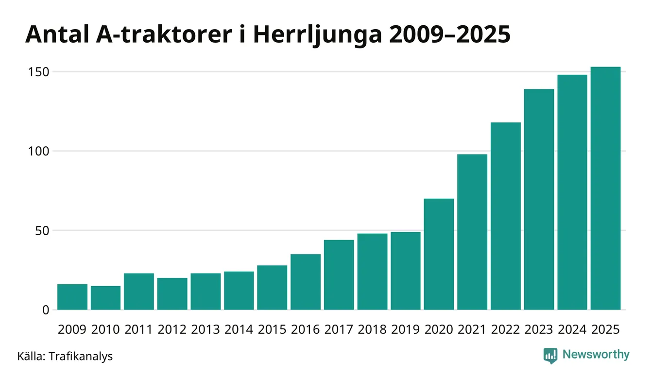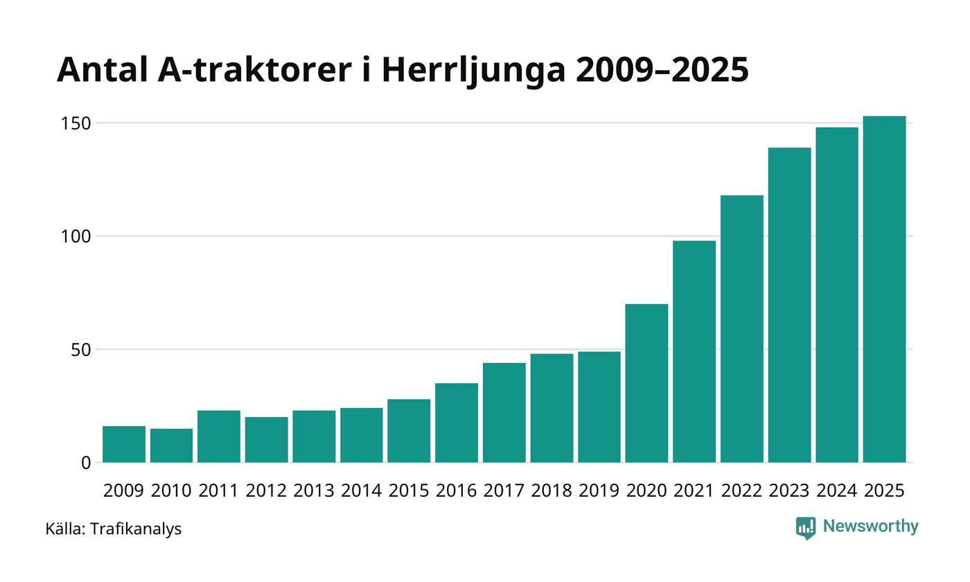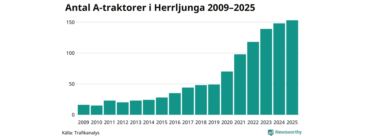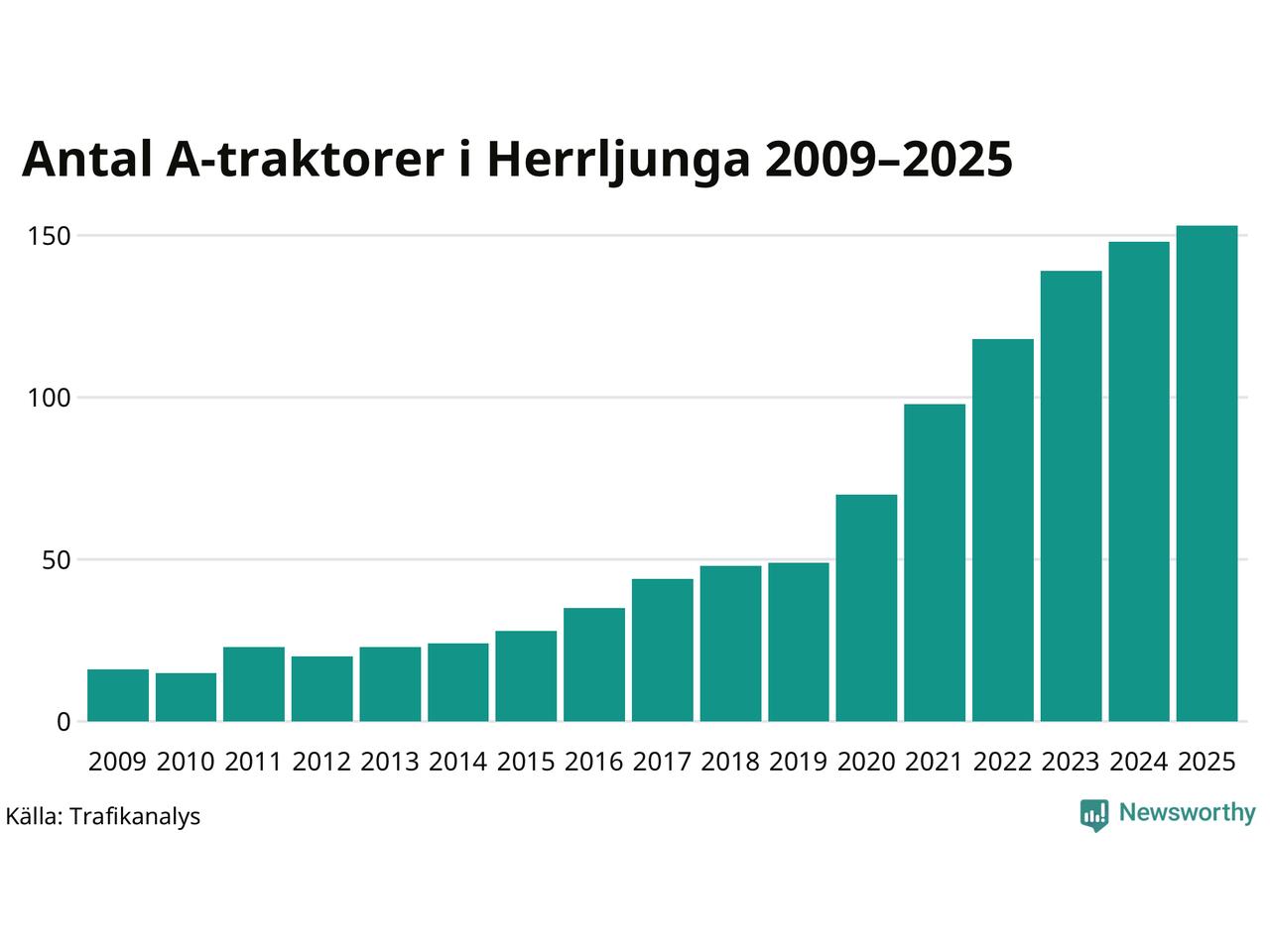 För 13:e året i rad ökar antalet A-traktorer i Herrljunga kommun, visar nya siffror från Trafikanalys. I slutet av 2025 fanns 153 A-traktorer registrerade i kommunen, vilket är fem mer än året innan. Inte sedan åtminstone 2009, som är det första året vi har statistik för, har det funnits så många A-traktorer i kommunen.