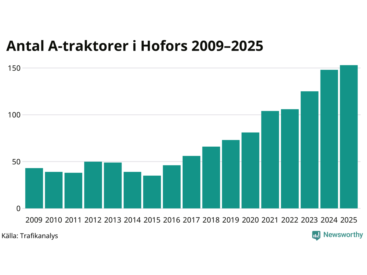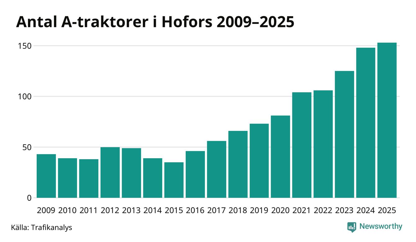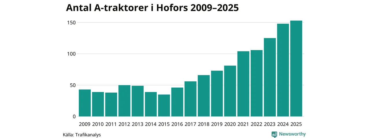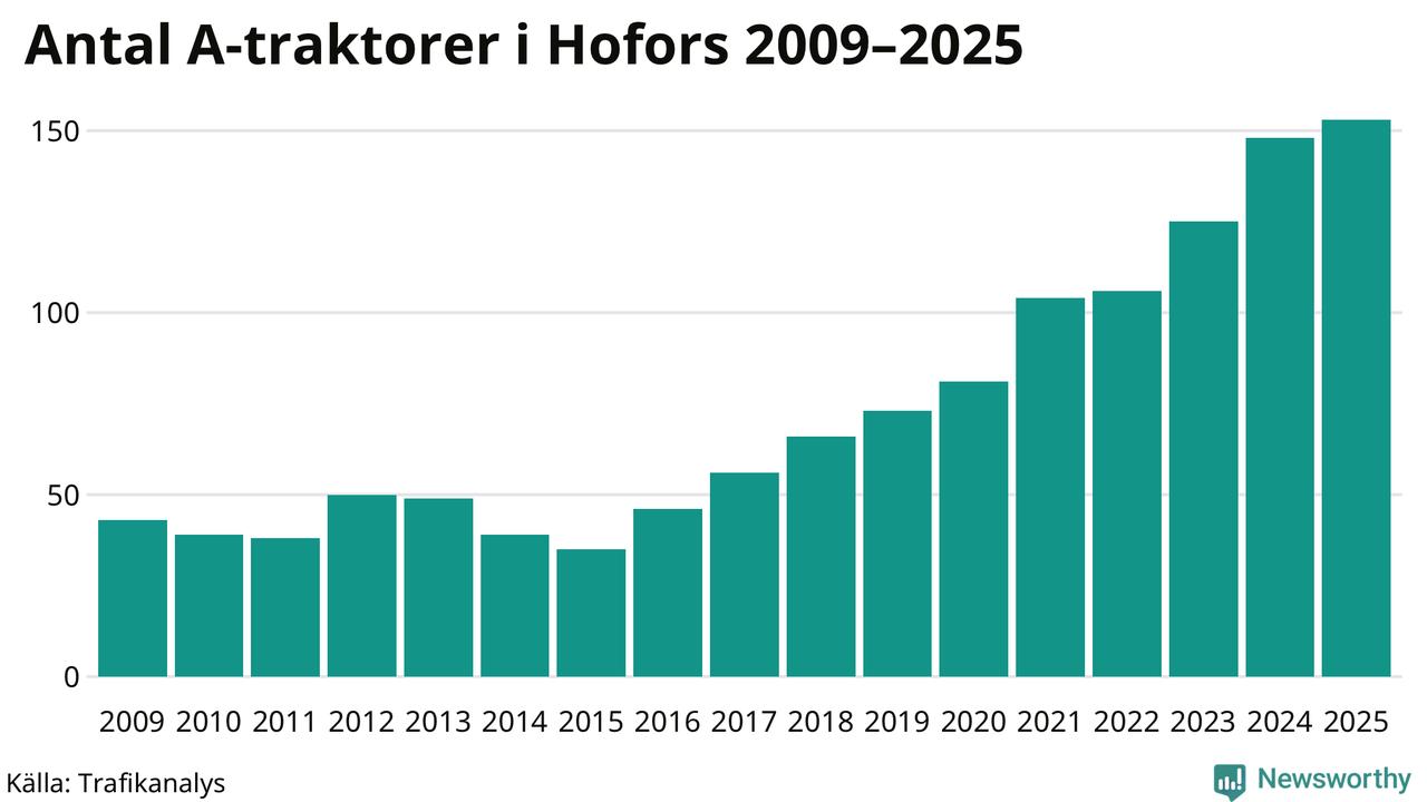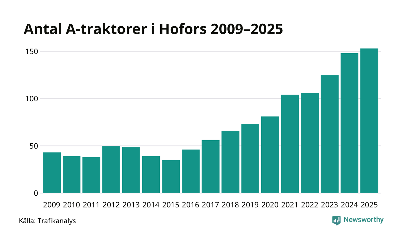 För tionde året i rad ökar antalet A-traktorer i Hofors kommun, visar nya siffror från Trafikanalys. I slutet av 2025 fanns 153 A-traktorer registrerade i kommunen, vilket är fem mer än året innan. Inte sedan åtminstone 2009, som är det första året vi har statistik för, har det funnits så många A-traktorer i kommunen.