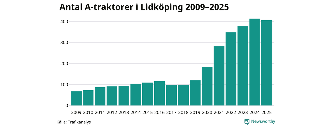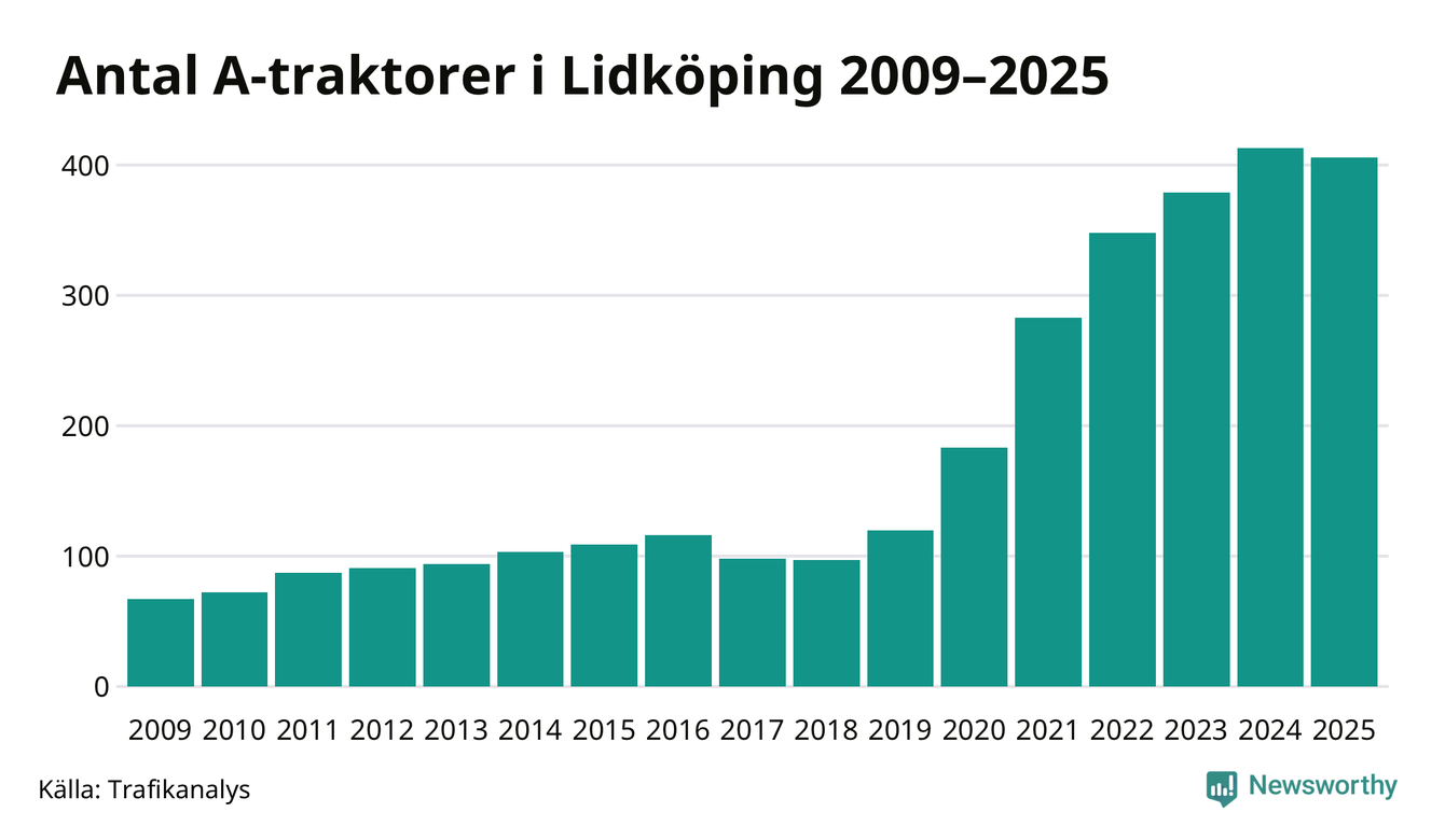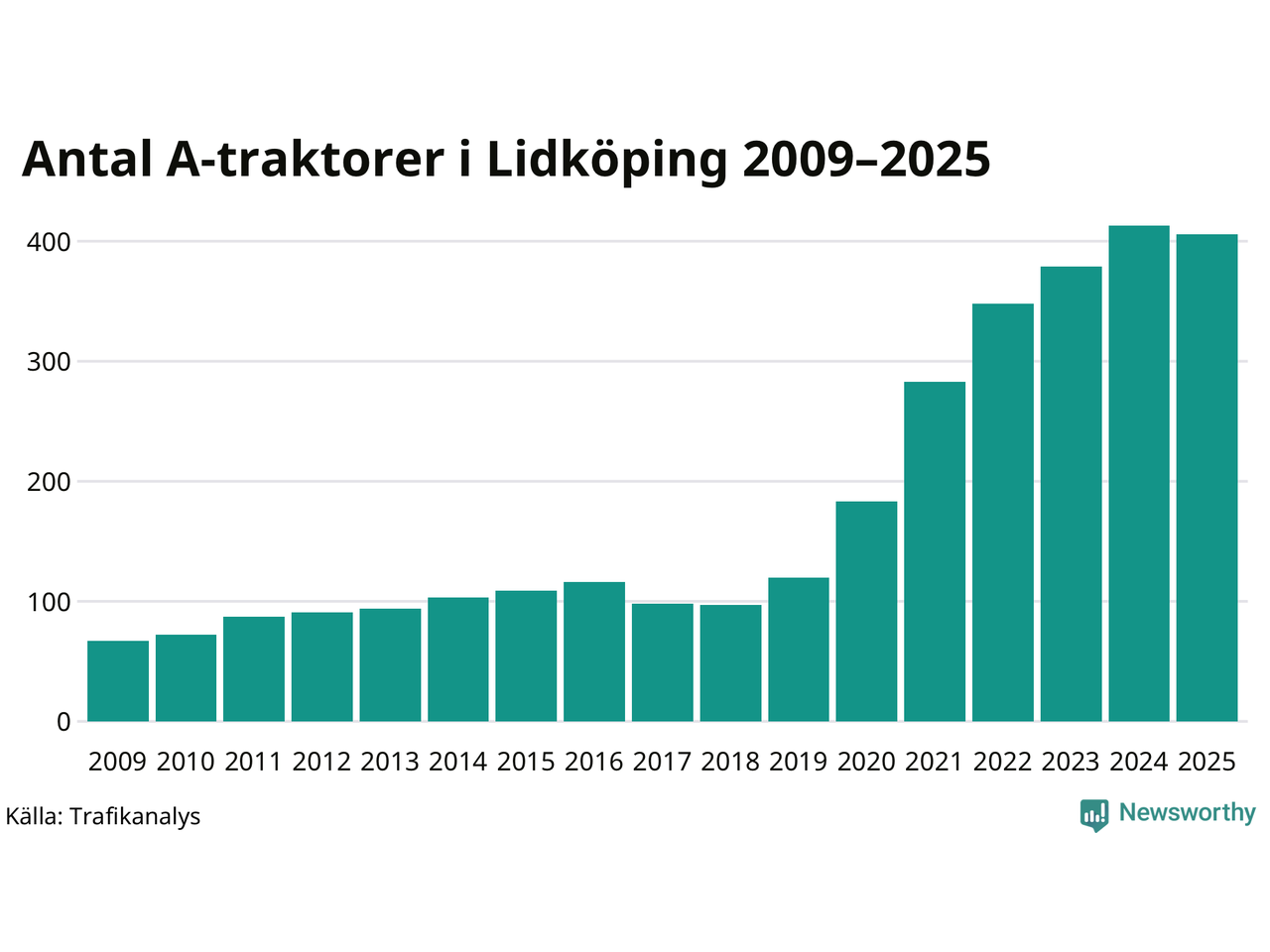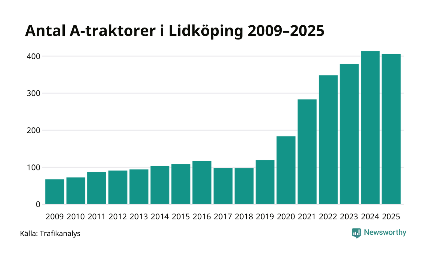 Under det senaste decenniet har antalet A-traktorer femdubblats i Sverige, och under 2025 fortsatte utvecklingen. Men i Lidköpings kommun blev A-traktorerna färre. Det är första gången sedan 2018 som antalet inte ökar.