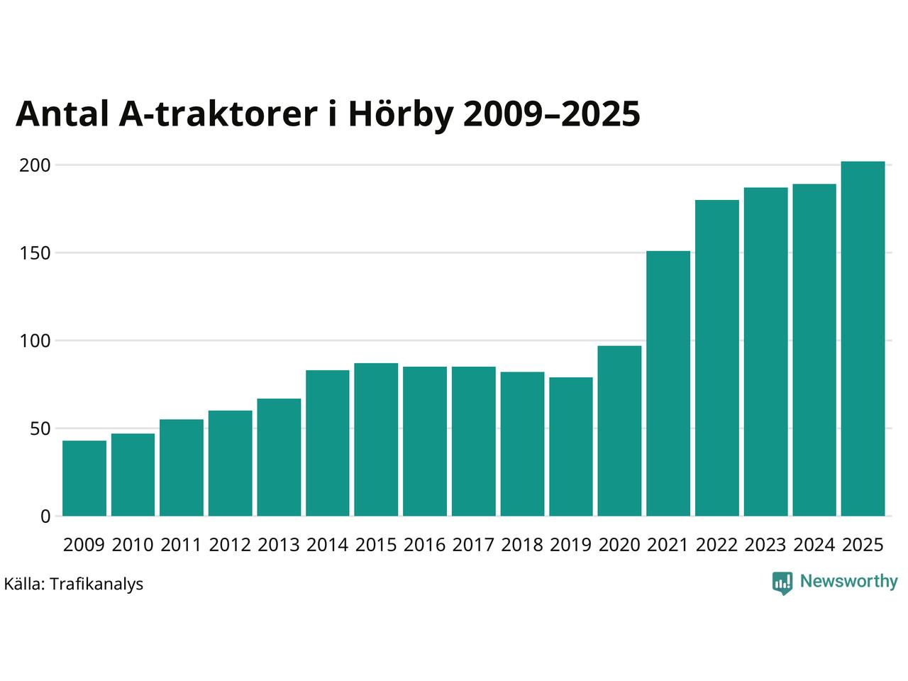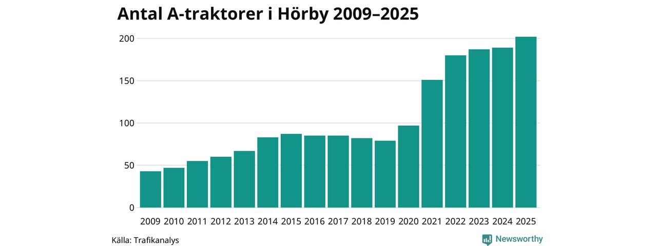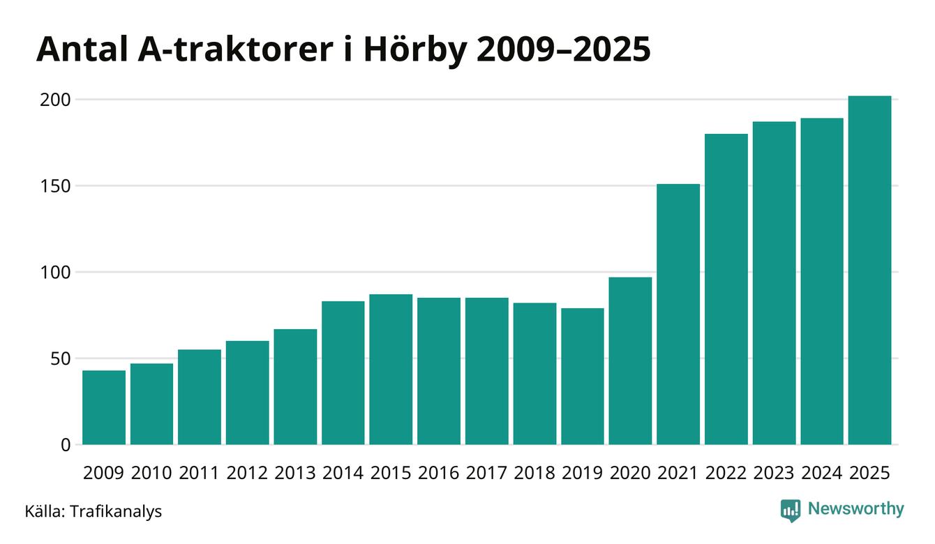 För sjätte året i rad ökar antalet A-traktorer i Hörby kommun, visar nya siffror från Trafikanalys. I slutet av 2025 fanns 202 A-traktorer registrerade i kommunen, vilket är 13 mer än året innan – en ökning med 7 procent. Inte sedan åtminstone 2009, som är det första året vi har statistik för, har det funnits så många A-traktorer i kommunen.