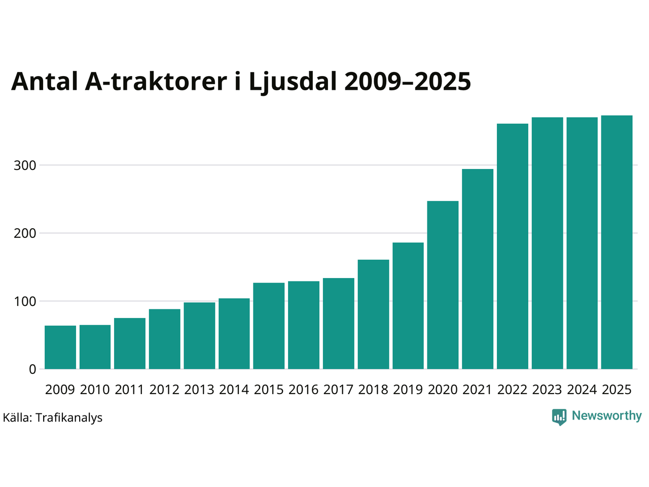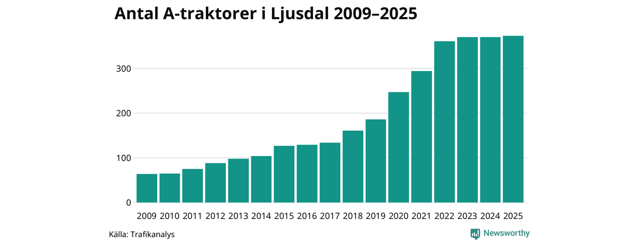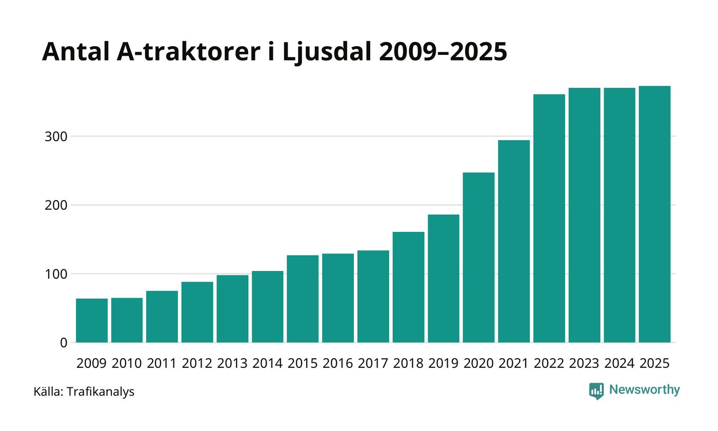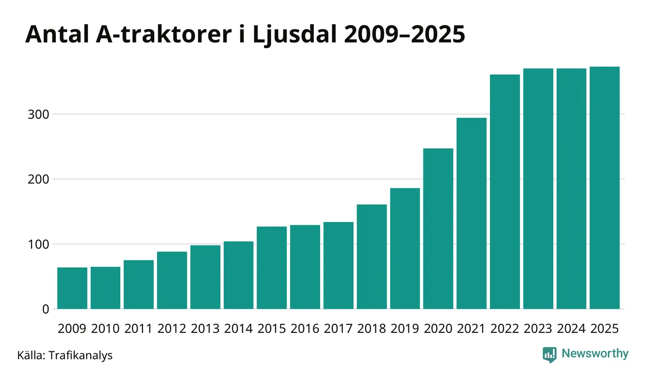 I slutet av 2025 fanns 373 A-traktorer registrerade i kommunen, vilket är tre mer än året innan. Det visar nya siffror från Trafikanalys. Inte sedan åtminstone 2009, som är det första året vi har statistik för, har det funnits så många A-traktorer i kommunen.