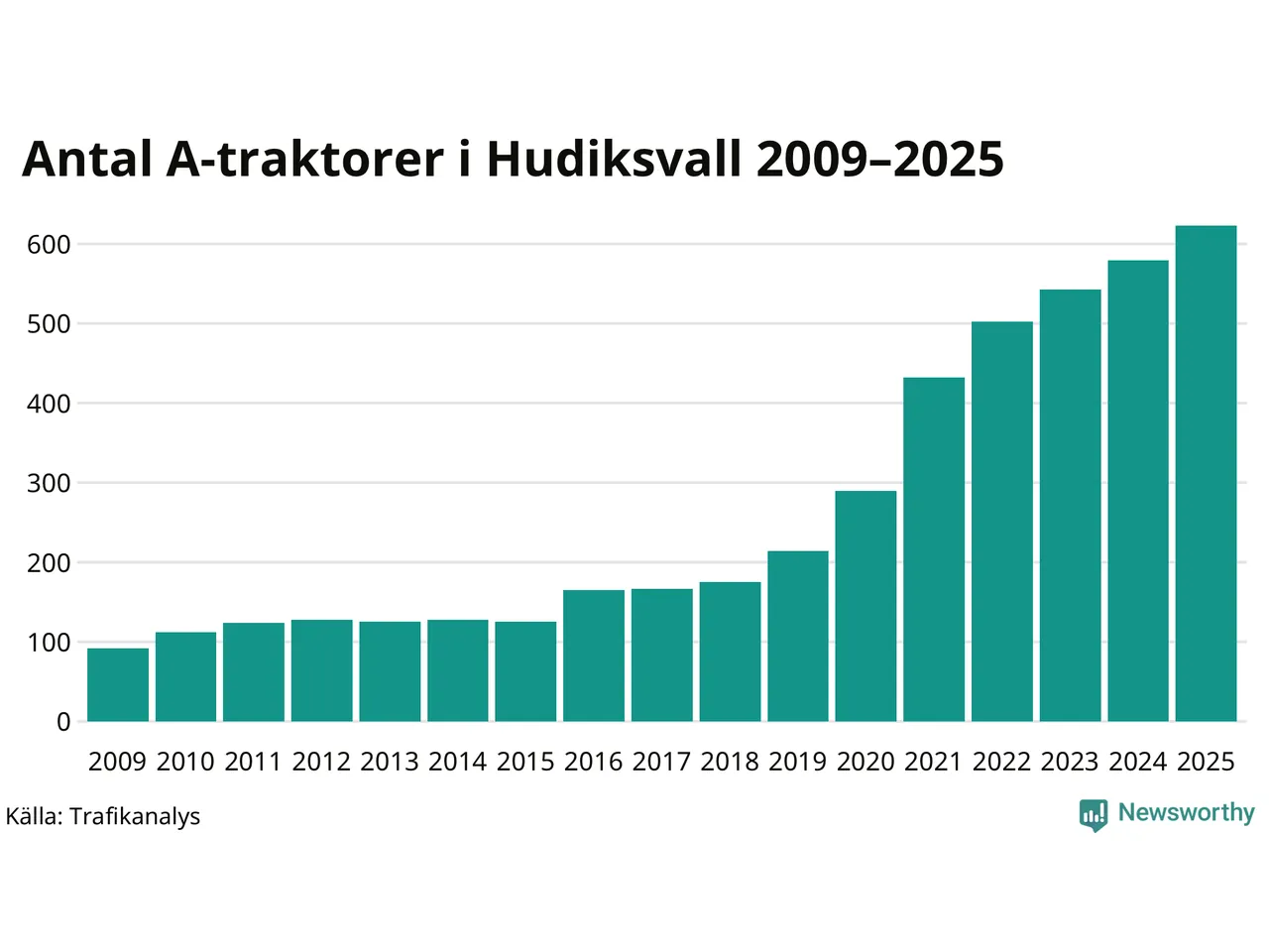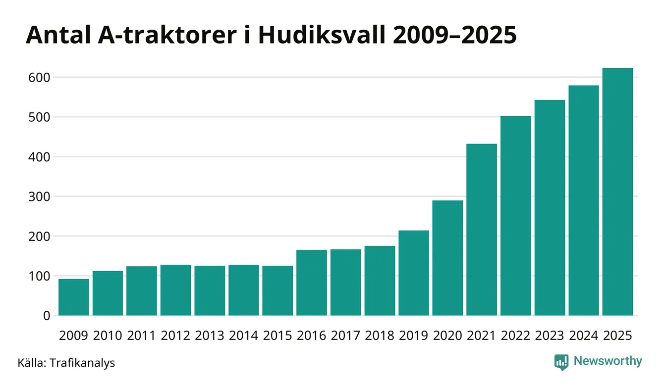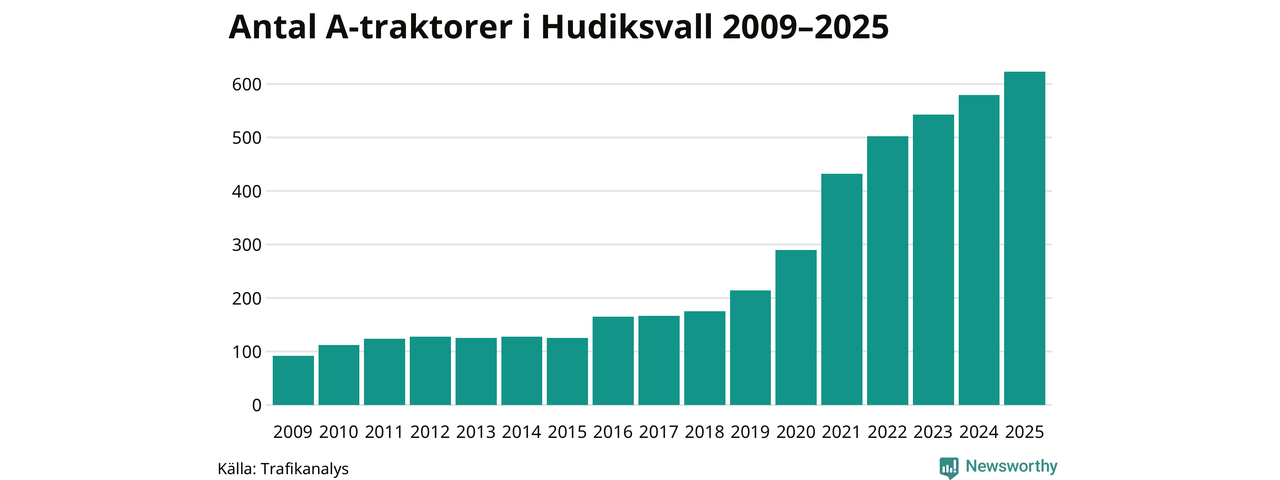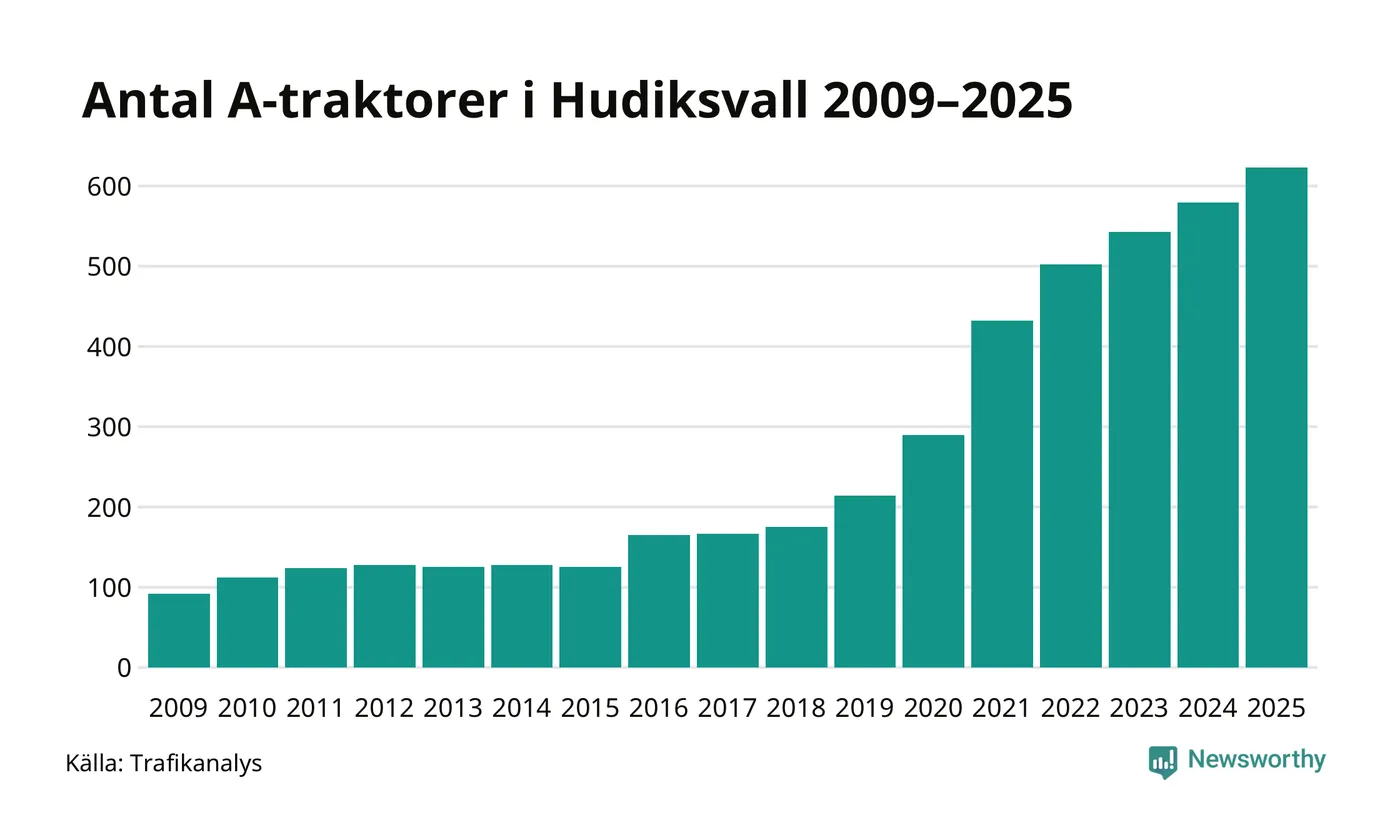För tionde året i rad ökar antalet A-traktorer i Hudiksvalls kommun, visar nya siffror från Trafikanalys. I slutet av 2025 fanns 623 A-traktorer registrerade i kommunen, vilket är 44 mer än året innan – en ökning med 8 procent. Inte sedan åtminstone 2009, som är det första året vi har statistik för, har det funnits så många A-traktorer i kommunen.
