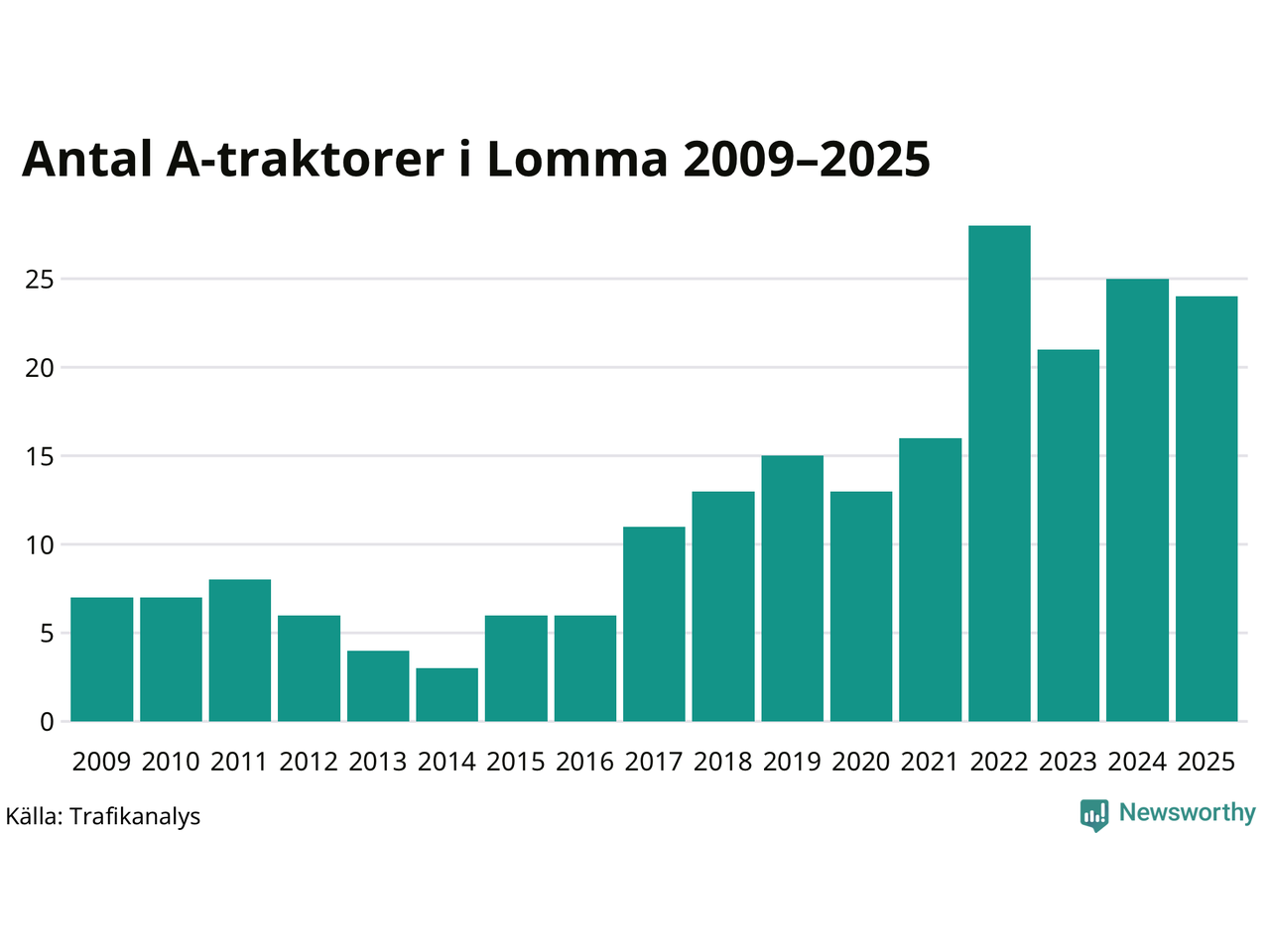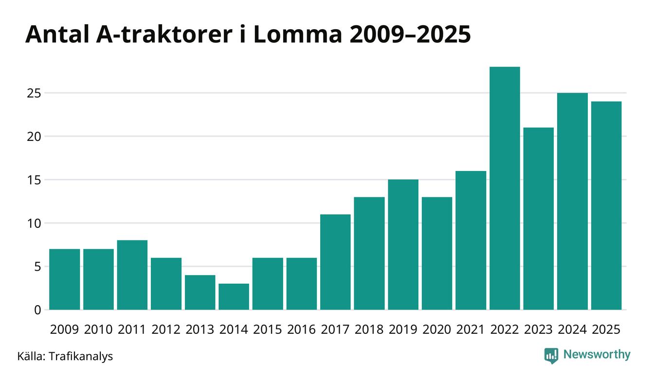 I slutet av 2025 fanns 24 A-traktorer registrerade i Lomma kommun, vilket är en mindre än året innan. Det visar nya siffror från Trafikanalys.
