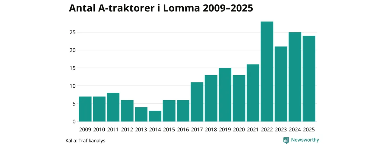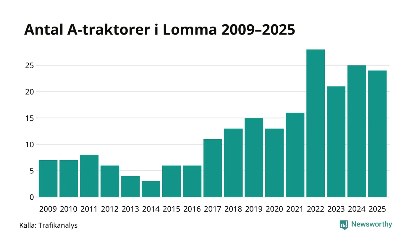 Under det senaste decenniet har antalet A-traktorer femdubblats i Sverige – och under 2025 fortsatte utvecklingen. Nu släpps nya siffror som visar hur många som finns i Lomma kommun.