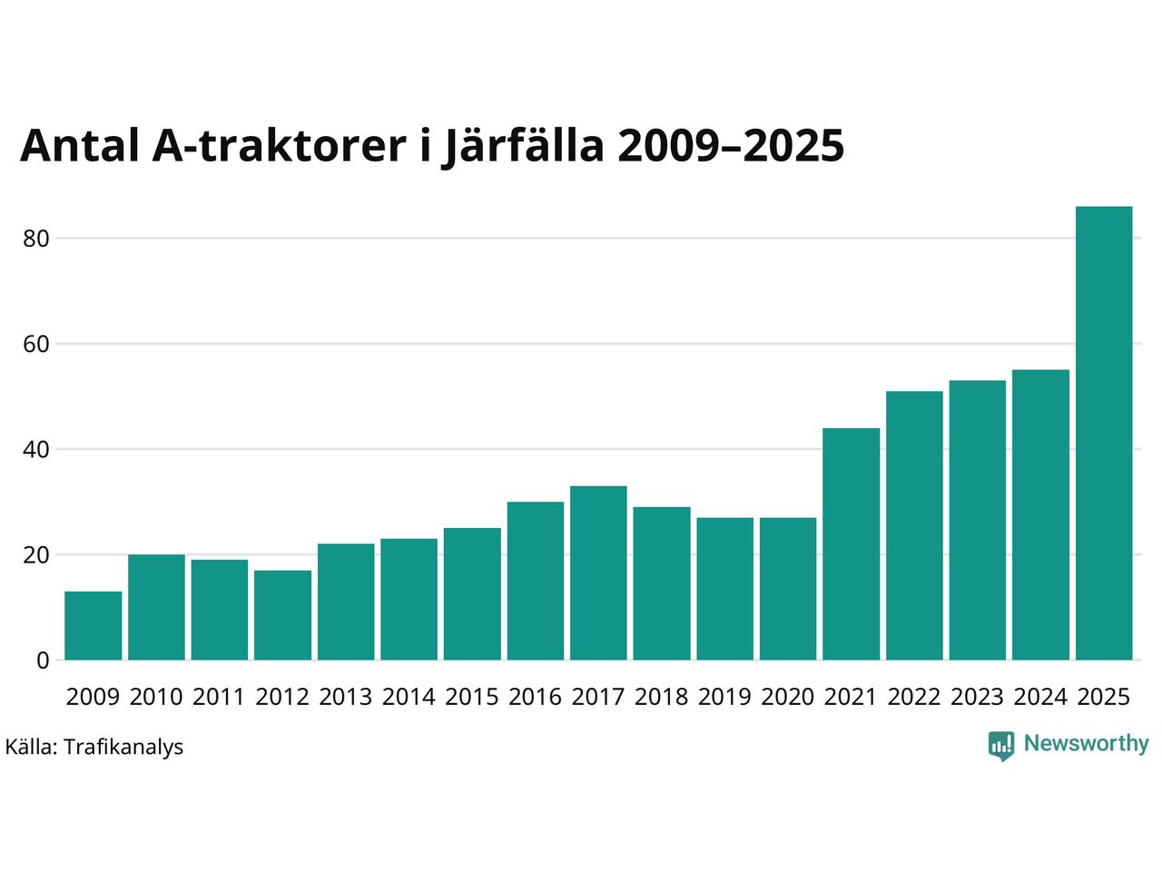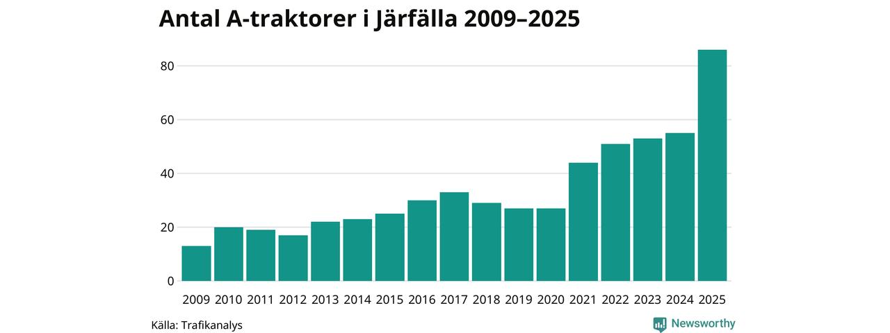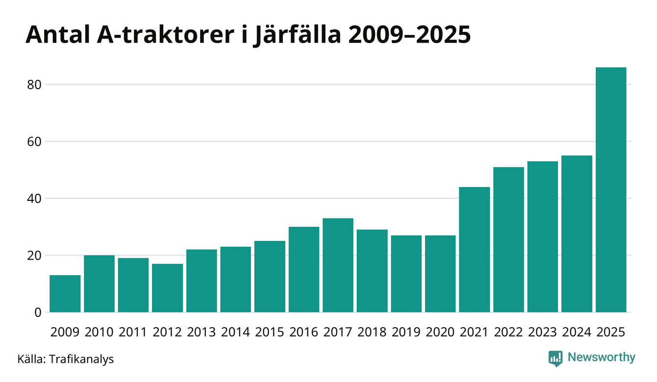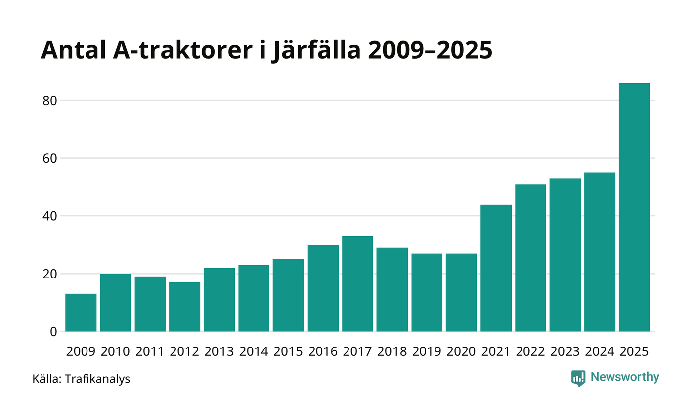 För femte året i rad ökar antalet A-traktorer i Järfälla kommun, visar nya siffror från Trafikanalys. I slutet av 2025 fanns 86 A-traktorer registrerade i kommunen, vilket är 31 mer än året innan – en ökning med 56 procent. Ökningen är den största från ett år till ett annat någonsin i Järfälla kommun i absoluta tal och den största ökningen i Stockholms län i år.