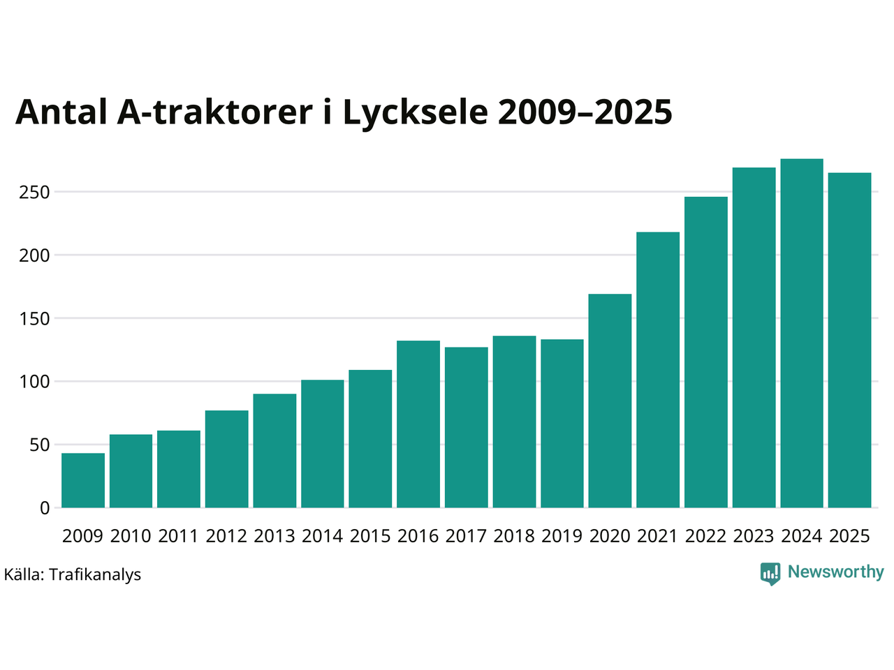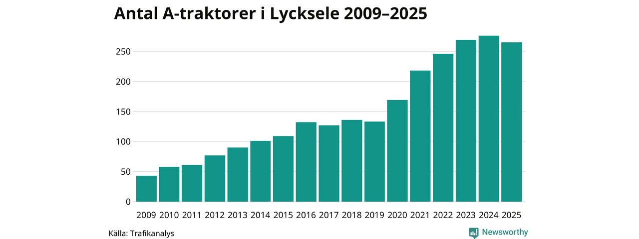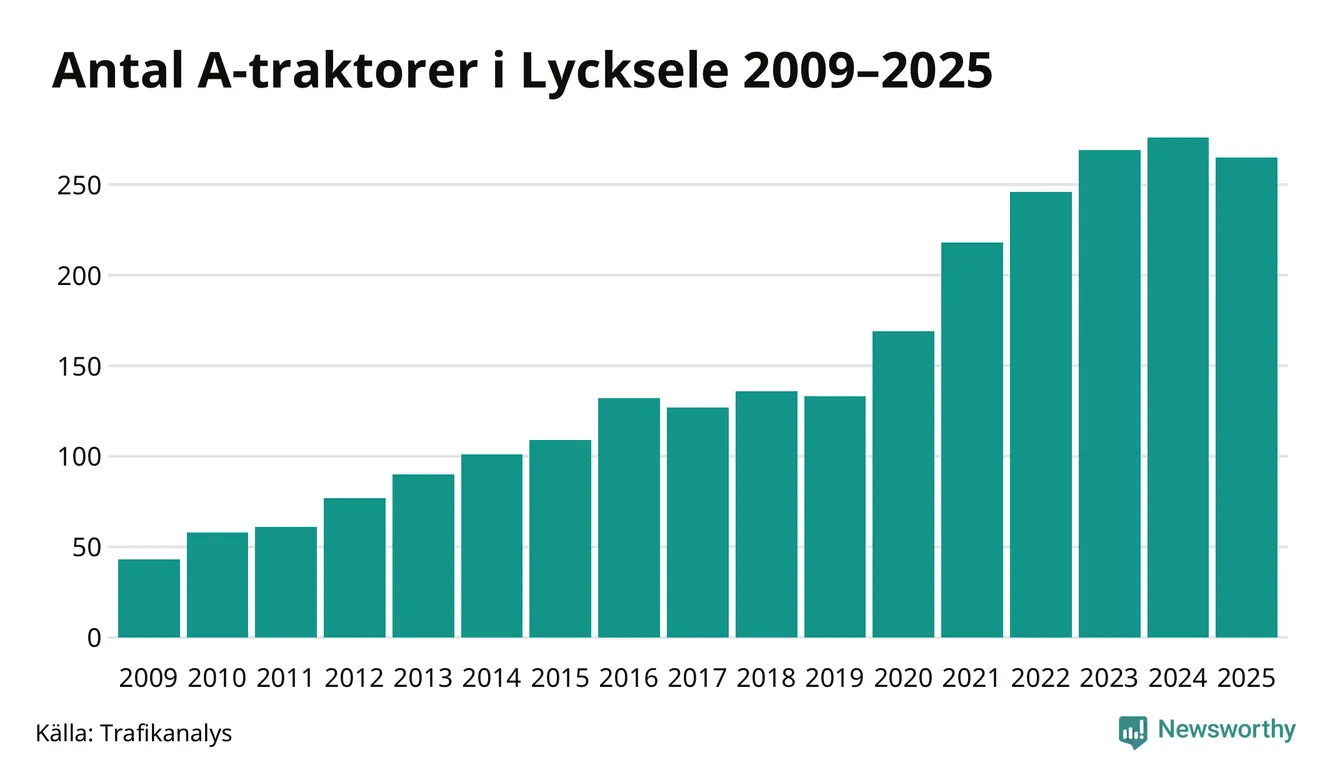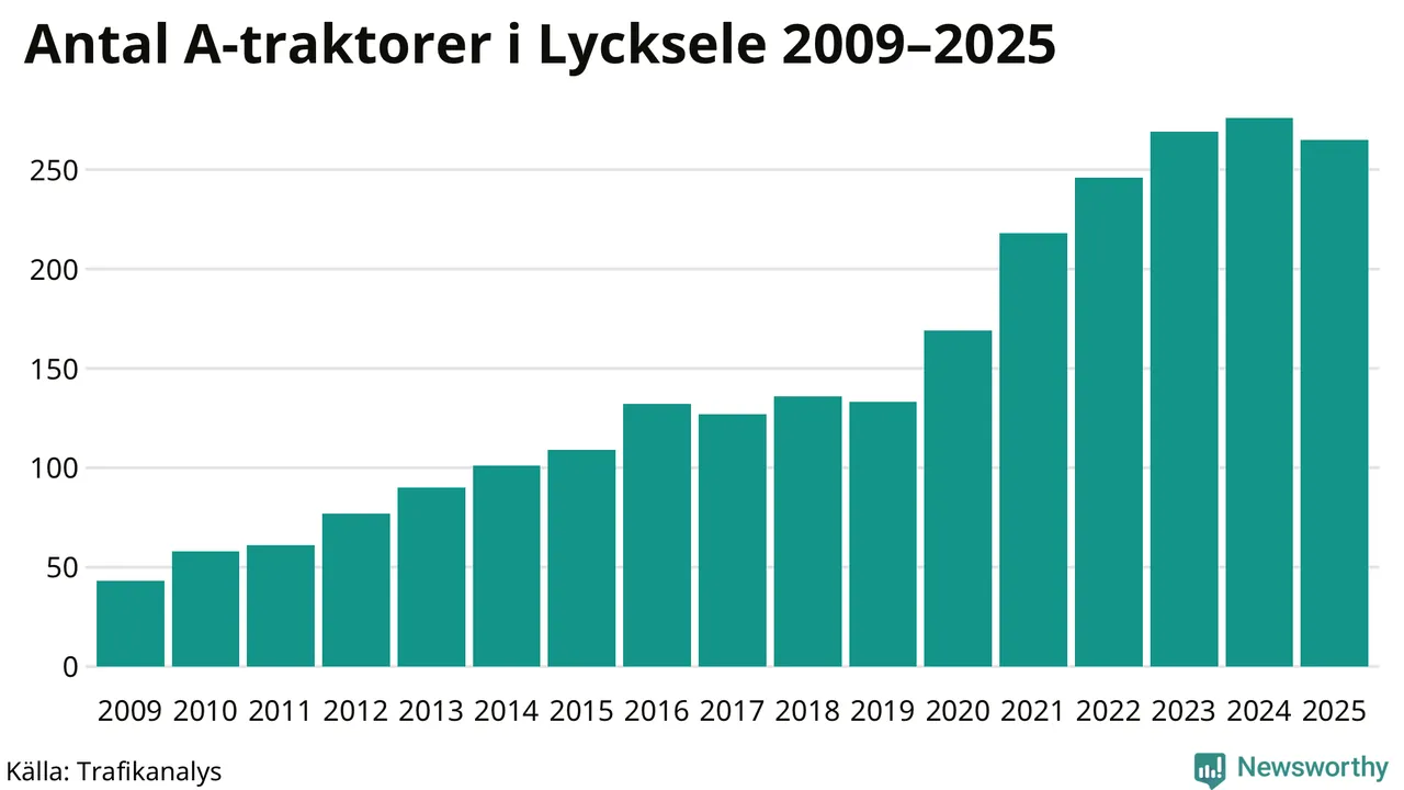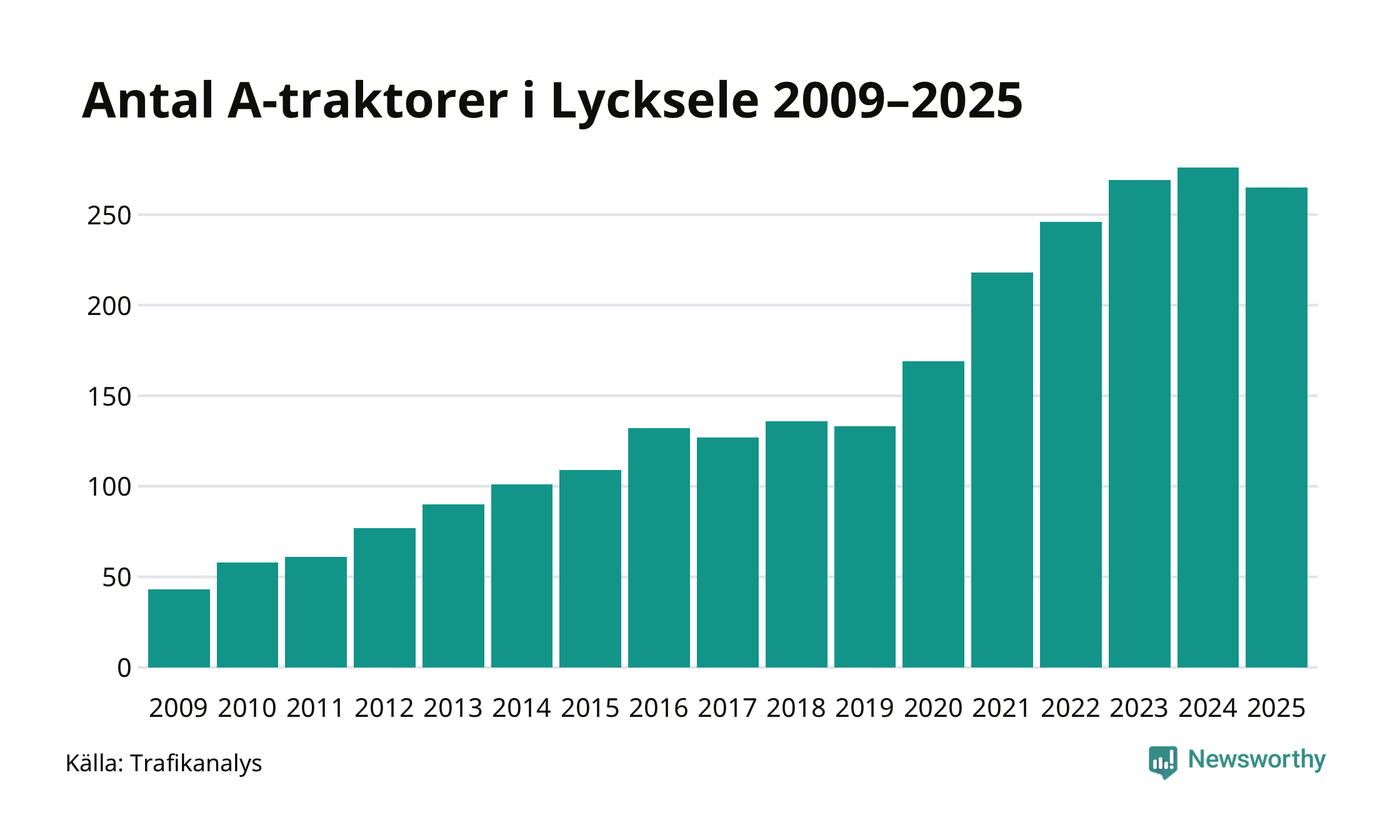 Under det senaste decenniet har antalet A-traktorer femdubblats i Sverige, och under 2025 fortsatte utvecklingen. Men i Lycksele kommun blev A-traktorerna färre. Det är första gången sedan 2019 som antalet inte ökar.