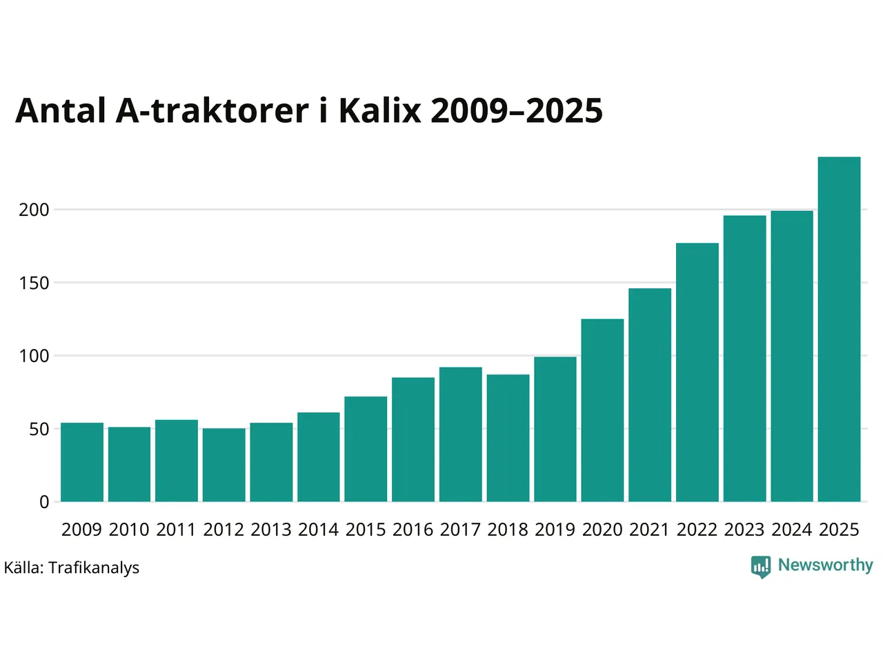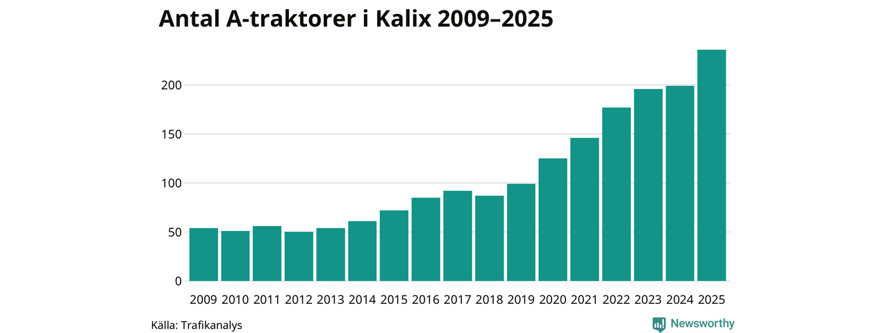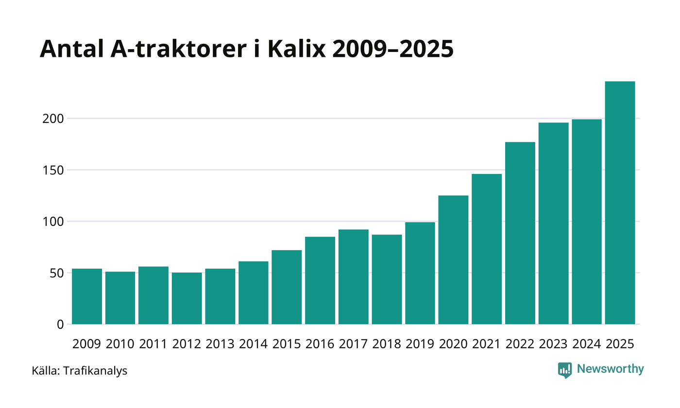 För sjunde året i rad ökar antalet A-traktorer i Kalix kommun, visar nya siffror från Trafikanalys. I slutet av 2025 fanns 236 A-traktorer registrerade i kommunen, vilket är 37 mer än året innan – en ökning med 19 procent. Ökningen är den största från ett år till ett annat någonsin i Kalix kommun i absoluta tal och den största ökningen i Norrbottens län i år.