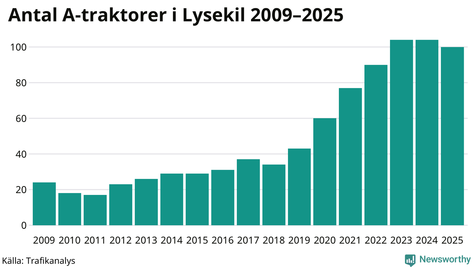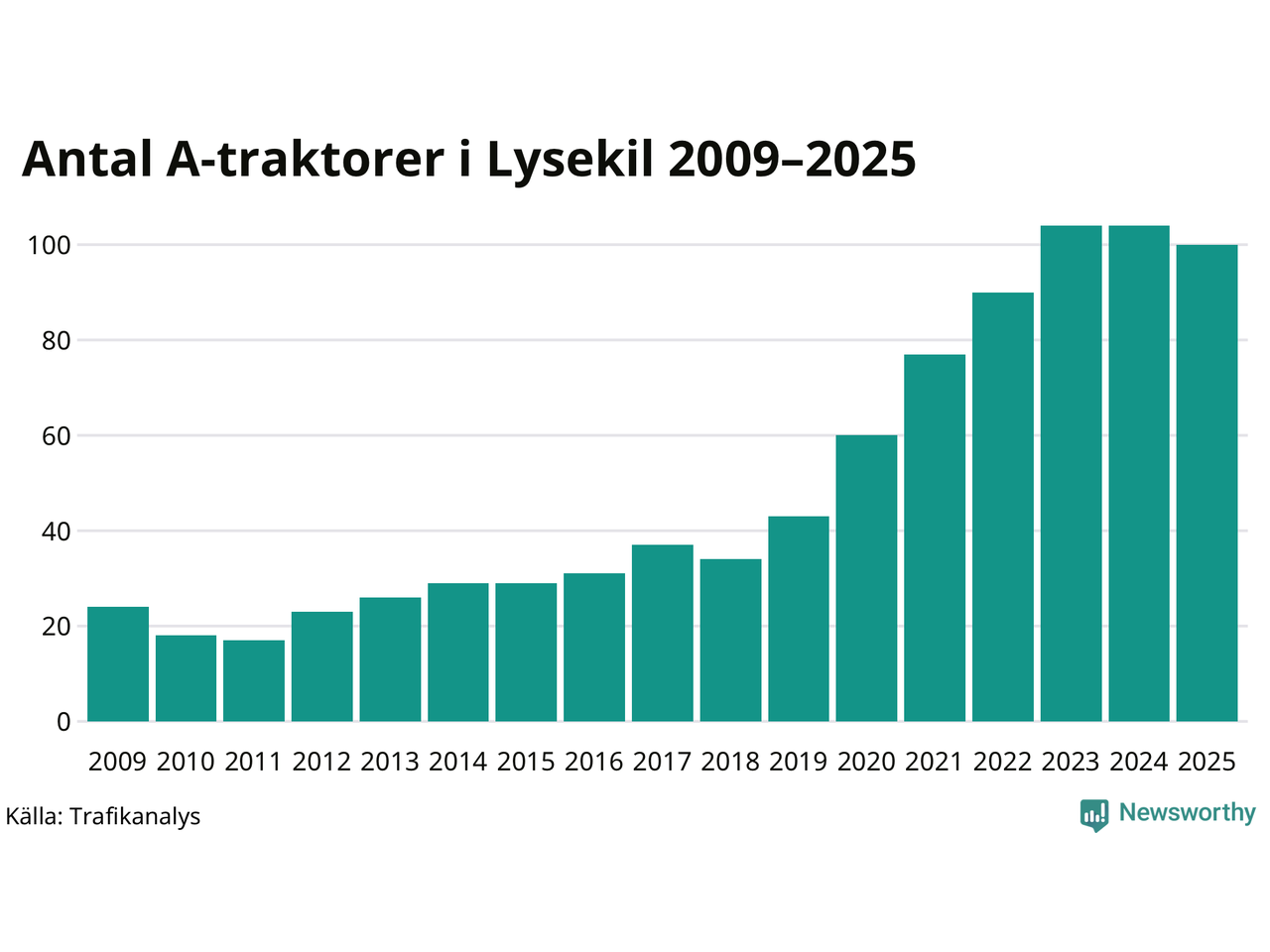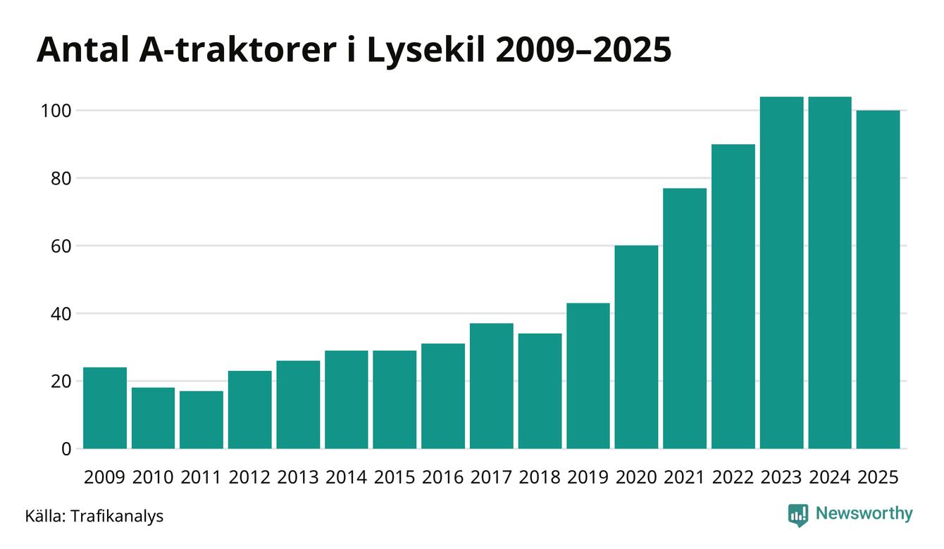 I slutet av 2025 fanns 100 A-traktorer registrerade i Lysekils kommun, vilket är fyra mindre än året innan. Det visar nya siffror från Trafikanalys.