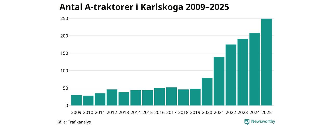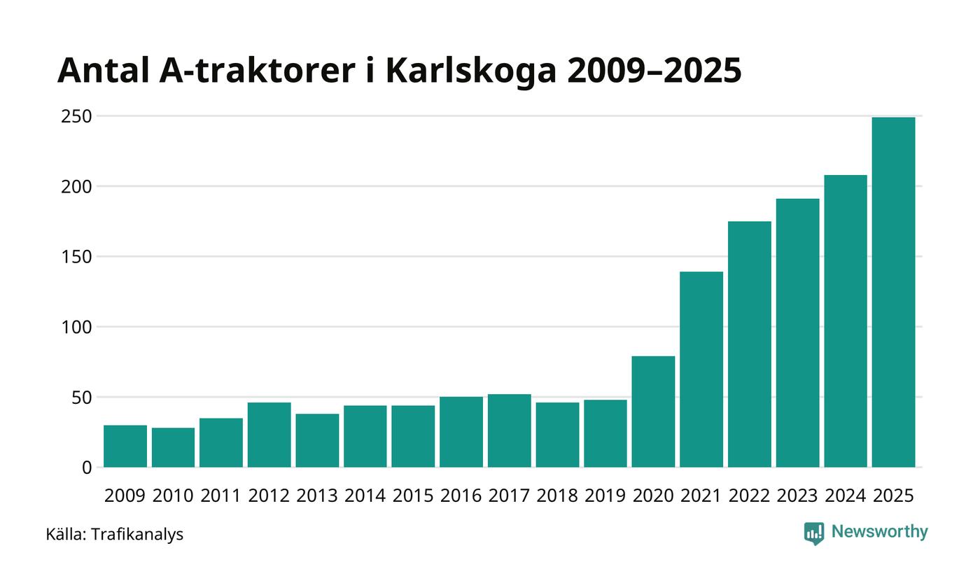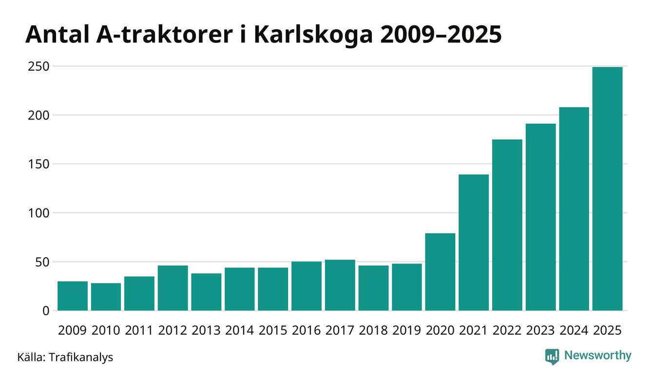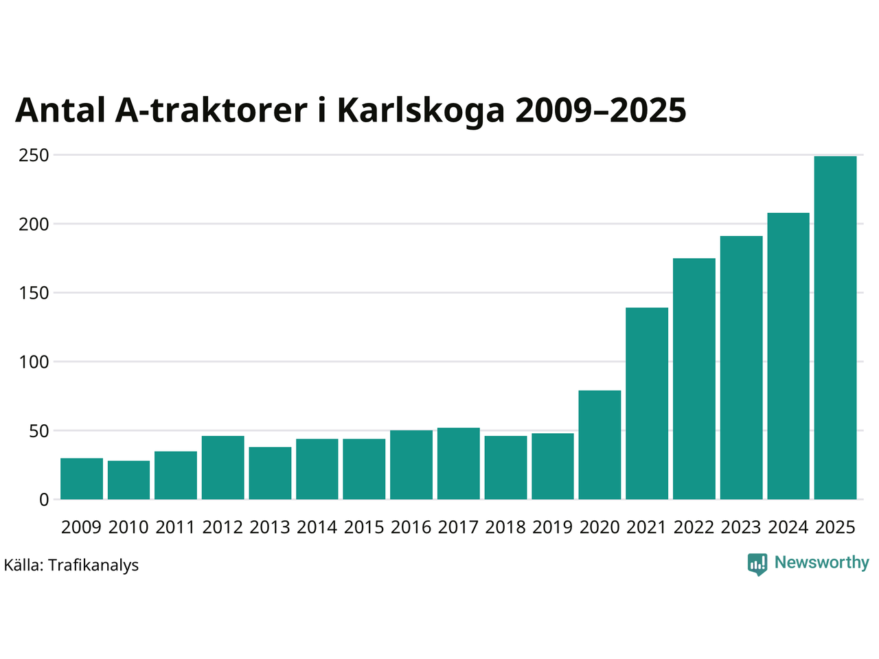För sjunde året i rad ökar antalet A-traktorer i Karlskoga kommun, visar nya siffror från Trafikanalys. I slutet av 2025 fanns 249 A-traktorer registrerade i kommunen, vilket är 41 mer än året innan – en ökning med 20 procent. Inte sedan åtminstone 2009, som är det första året vi har statistik för, har det funnits så många A-traktorer i kommunen.