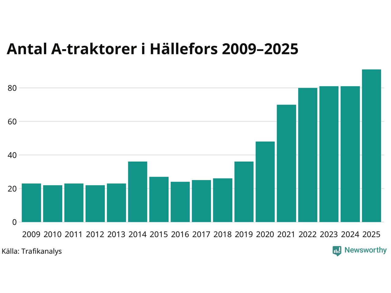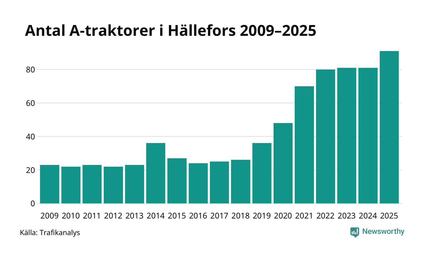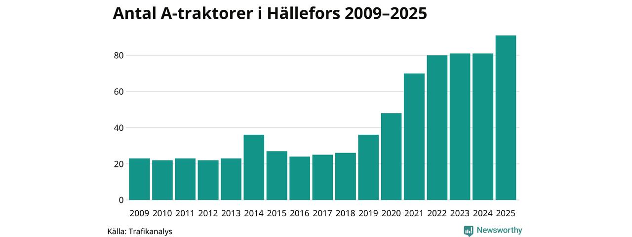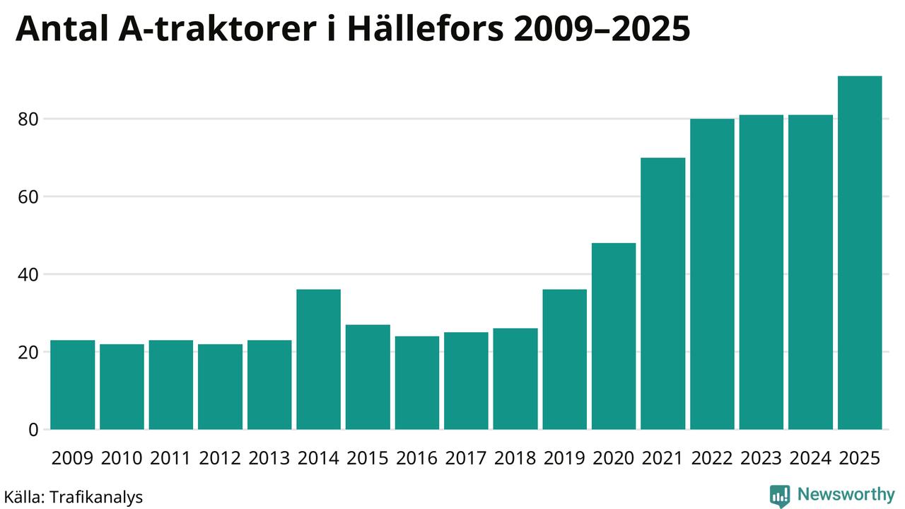 I slutet av 2025 fanns 91 A-traktorer registrerade i kommunen, vilket är tio mer än året innan – en ökning med 12 procent. Det visar nya siffror från Trafikanalys. Inte sedan åtminstone 2009, som är det första året vi har statistik för, har det funnits så många A-traktorer i kommunen.