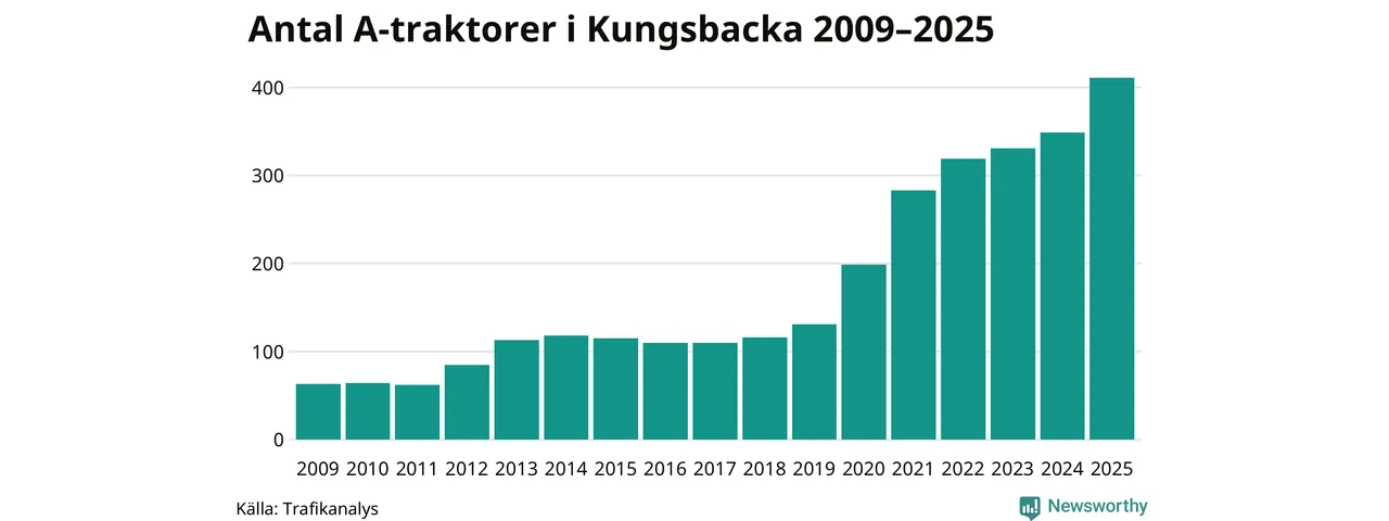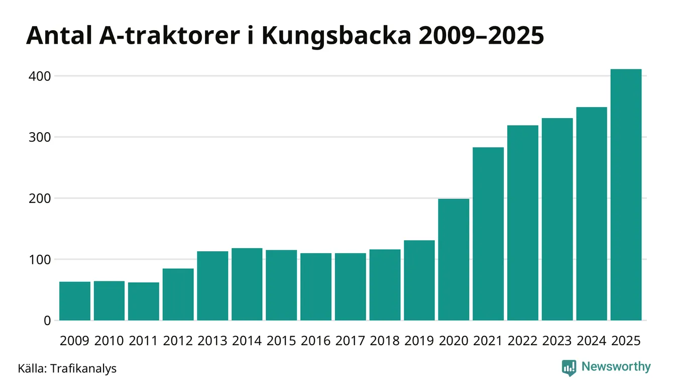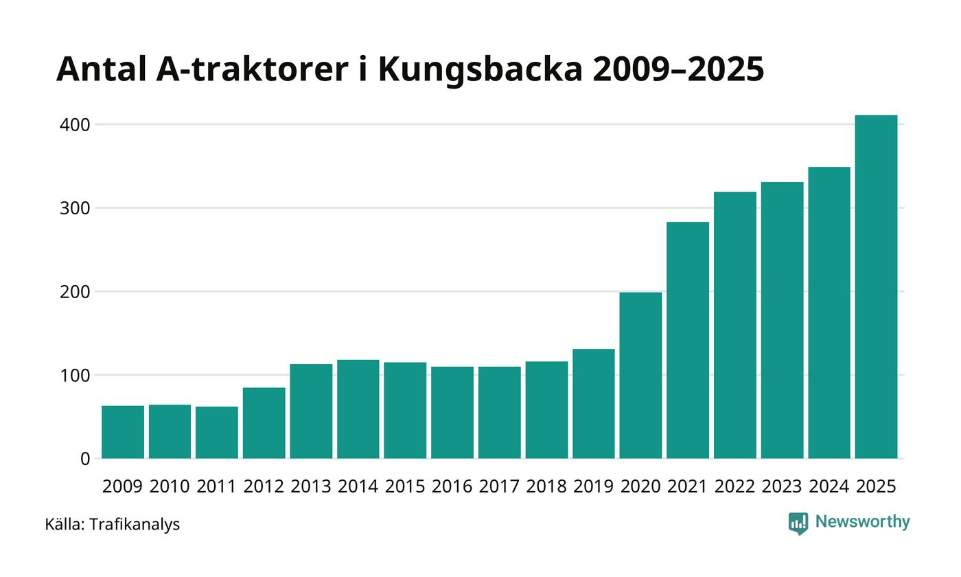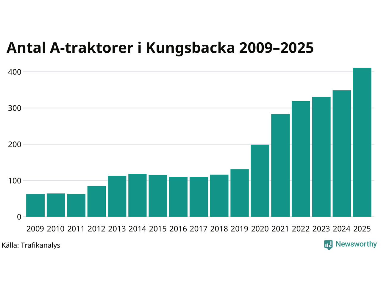 För åttonde året i rad ökar antalet A-traktorer i Kungsbacka kommun, visar nya siffror från Trafikanalys. I slutet av 2025 fanns 411 A-traktorer registrerade i kommunen, vilket är 62 mer än året innan – en ökning med 18 procent. Det är den största ökningen i Hallands län. Inte sedan åtminstone 2009, som är det första året vi har statistik för, har det funnits så många A-traktorer i kommunen.